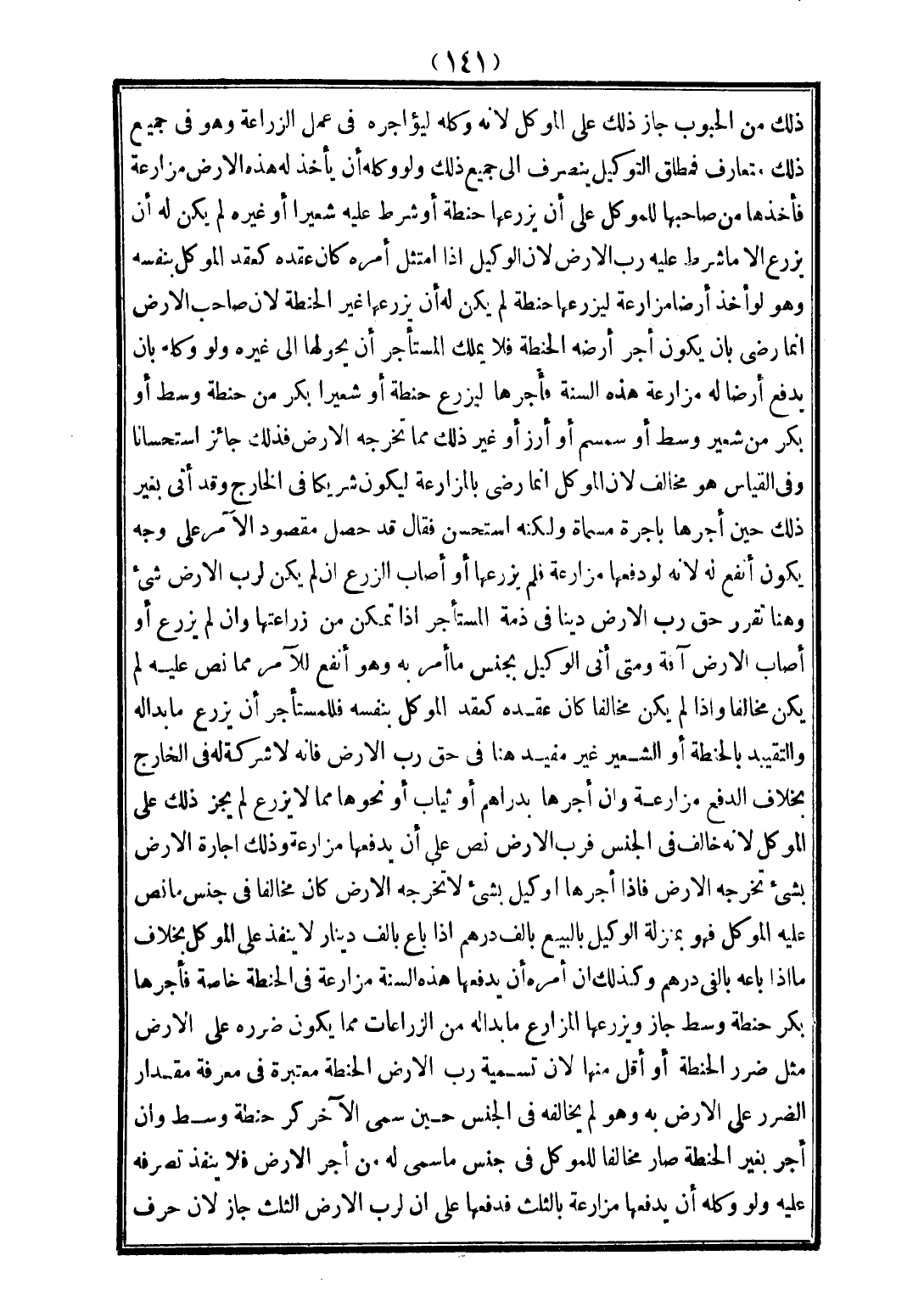 ذَلِكَ مِنْ الْحُبُوبِ - جَازَ ذَلِكَ عَلَى الْمُوَكِّلِ؛ لِأَنَّهُ وَكَّلَهُ لِيُؤَاجِرَهُ فِي عَمَلِ الزِّرَاعَةِ وَهُوَ فِي جَمِيعِ ذَلِكَ مُتَعَارَفٌ، فَمُطْلَقُ التَّوْكِيلِ يَنْصَرِفُ إلَى جَمِيعِ ذَلِكَ. وَلَوْ وَكَّلَهُ أَنْ يَأْخُذَ لَهُ هَذِهِ الْأَرْضَ مُزَارَعَةً فَأَخَذَهَا مِنْ صَاحِبِهَا لِلْمُوَكِّلِ عَلَى أَنْ يَزْرَعَهَا حِنْطَةً أَوْ شَرَطَ عَلَيْهِ شَعِيرًا أَوْ غَيْرَهُ - لَمْ يَكُنْ لَهُ أَنْ يَزْرَعَ إلَّا مَا شَرَطَ عَلَيْهِ رَبُّ الْأَرْضِ؛ لِأَنَّ الْوَكِيلَ إذَا امْتَثَلَ أَمْرَهُ كَانَ عَقْدُهُ كَعَقْدِ الْمُوَكِّلِ بِنَفْسِهِ وَهُوَ لَوْ أَخَذَ أَرْضًا مُزَارَعَةً لِيَزْرَعَهَا حِنْطَةً لَمْ يَكُنْ لَهُ أَنْ يَزْرَعَهَا غَيْرَ الْحِنْطَةِ؛ لِأَنَّ صَاحِبَ الْأَرْضِ إنَّمَا رَضِيَ بِأَنْ يَكُونَ أَجْرَ أَرْضِهِ الْحِنْطَةُ فَلَا يَمْلِكُ الْمُسْتَأْجِرُ أَنْ يُحَوِّلَهَا إلَى غَيْرِهِ.
