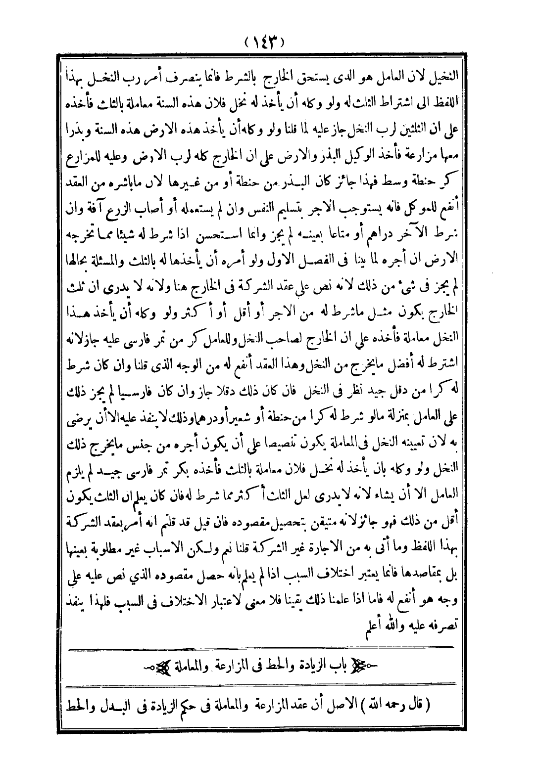 [قَالَ - رَحِمَهُ اللَّهُ -]: الْأَصْلُ أَنَّ عَقْدَ الْمُزَارَعَةِ وَالْمُعَامَلَةِ فِي حُكْمِ الزِّيَادَةِ فِي الْبَدَلِ وَالْحَطِّ