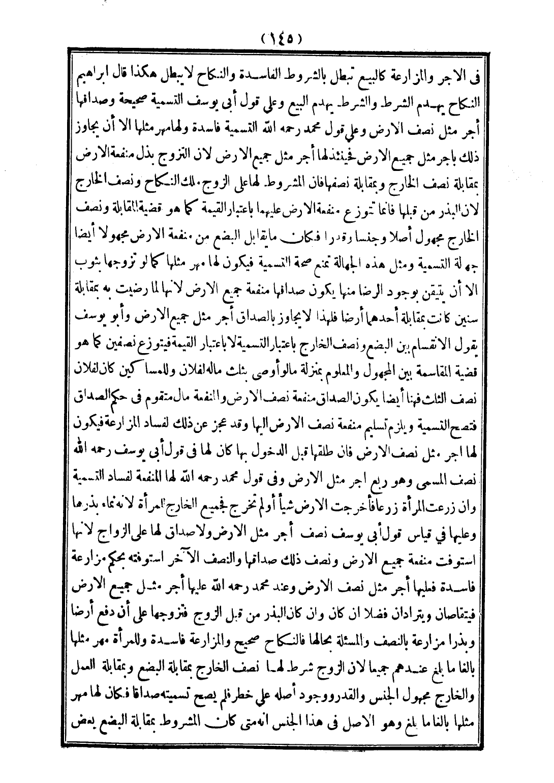 فِي الْأَجْرِ وَالْمُزَارَعَةُ كَالْبَيْعِ تَبْطُلُ بِالشُّرُوطِ الْفَاسِدَةِ، وَالنِّكَاحُ لَا يَبْطُلُ. هَكَذَا قَالَ إبْرَاهِيمُ: النِّكَاحُ يَهْدِمُ الشَّرْطَ، وَالشَّرْطُ يَهْدِمُ الْبَيْعَ. وَعَلَى قَوْلِ أَبِي يُوسُفَ: التَّسْمِيَةُ صَحِيحَةٌ، وَصَدَاقُهَا أَجْرُ مِثْلِ نِصْفِ الْأَرْضِ. وَعَلَى قَوْلِ مُحَمَّدٍ - رَحِمَهُ اللَّهُ -: التَّسْمِيَةُ فَاسِدَةٌ، وَلَهَا مَهْرُ مِثْلِهَا إلَّا أَنْ يُجَاوِزَ ذَلِكَ بِأَجْرِ مِثْلِ جَمِيعِ الْأَرْضِ، فَحِينَئِذٍ لَهَا أَجْرُ مِثْلِ جَمِيعِ الْأَرْضِ؛ لِأَنَّ التَّزَوُّجَ بَذْلُ مَنْفَعَةِ الْأَرْضِ بِمُقَابَلَةِ نِصْفِ الْخَارِجِ، وَبِمُقَابَلَةِ نِصْفِهَا فَإِنَّ الْمَشْرُوطَ لَهَا عَلَى الزَّوْجِ مِلْكُ النِّكَاحِ وَنِصْفُ الْخَارِجِ؛ لِأَنَّ الْبَذْرَ مِنْ قِبَلِهَا، فَإِنَّمَا تَتَوَزَّعُ مَنْفَعَةُ الْأَرْضِ عَلَيْهِمَا بِاعْتِبَارِ الْقِيمَةِ - كَمَا هُوَ قَضِيَّةُ الْمُقَابَلَةِ - وَنِصْفُ الْخَارِجِ مَجْهُولٌ أَصْلًا وَجِنْسًا وَقَدْرًا؛ فَكَانَ مَا يُقَابِلُ الْبُضْعَ مِنْ مَنْفَعَةِ الْأَرْضِ مَجْهُولًا أَيْضًا جَهَالَةَ التَّسْمِيَةِ.