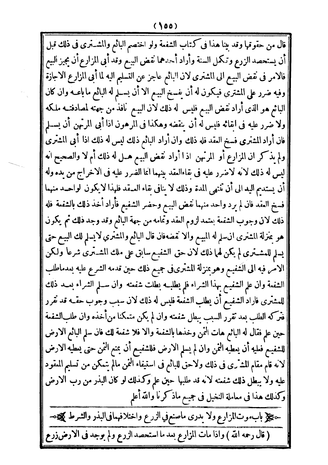قَالَ: مِنْ حُقُوقِهَا. وَقَدْ بَيَّنَّا هَذَا فِي كِتَابِ الشُّفْعَةِ. وَلَوْ اخْتَصَمَ الْبَائِعُ وَالْمُشْتَرِي فِي ذَلِكَ قَبْلَ أَنْ يُسْتَحْصَدَ الزَّرْعُ وَتَكْمُلَ السَّنَةُ، وَأَرَادَ أَحَدُهُمَا نَقْضَ الْبَيْعِ، وَقَدْ أَبَى الْمُزَارِعُ أَنْ يُجِيزَ الْبَيْعَ - فَالْأَمْرُ فِي نَقْضِ الْبَيْعِ إلَى الْمُشْتَرِي؛ لِأَنَّ الْبَائِعَ عَاجِزٌ عَنْ التَّسْلِيمِ إلَيْهِ لَمَّا أَبَى الْمُزَارِعُ الْإِجَازَةَ، وَفِيهِ ضَرَرٌ عَلَى الْمُشْتَرِي، فَيَكُونُ لَهُ أَنْ يَفْسَخَ الْبَيْعَ إلَّا أَنْ يُسَلِّمَ لَهُ الْبَائِعُ مَا بَاعَهُ. وَإِنْ كَانَ الْبَائِعُ هُوَ الَّذِي أَرَادَ نَقْضَ الْبَيْعِ فَلَيْسَ لَهُ ذَلِكَ؛ لِأَنَّ الْبَيْعَ نَافِذٌ مِنْ جِهَتِهِ لِمُصَادَفَتِهِ مِلْكَهُ وَلَا ضَرَرَ عَلَيْهِ فِي إبْقَائِهِ فَلَيْسَ لَهُ أَنْ يَنْقُضَهُ، وَهَكَذَا فِي الْمَرْهُونِ إذَا أَبَى الْمُرْتَهِنُ أَنْ يُسَلِّمَ.