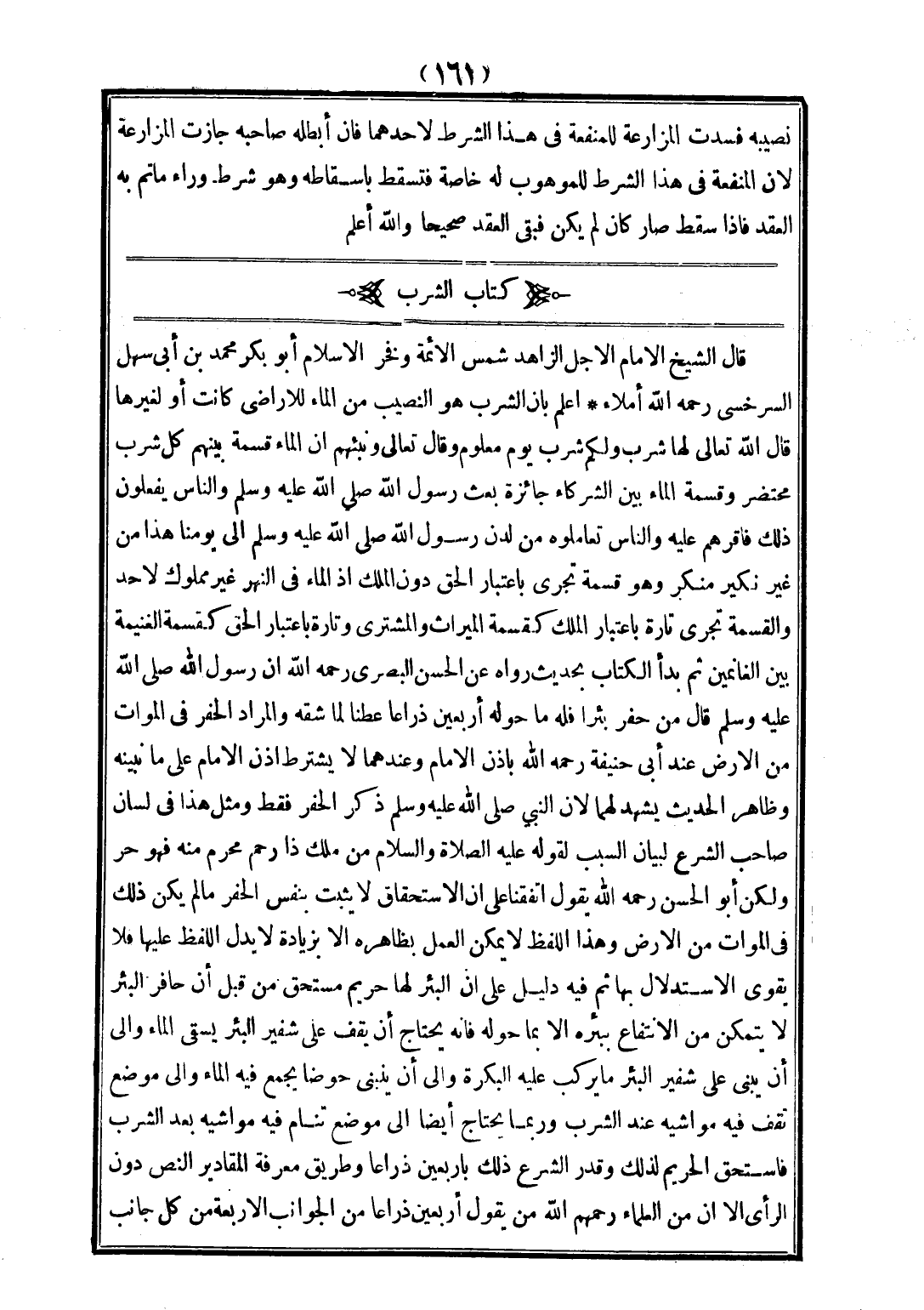 قَالَ الشَّيْخُ الْإِمَامُ الْأَجَلُّ الزَّاهِدُ شَمْسُ الْأَئِمَّةِ وَفَخْرُ الْإِسْلَامِ أَبُو بَكْرٍ مُحَمَّدُ بْنُ أَبِي سَهْلٍ السَّرَخْسِيُّ - رَحِمَهُ اللَّهُ - إمْلَاءً اعْلَمْ بِأَنَّ الشِّرْبَ هُوَ نَصِيبٌ مِنْ الْمَاءِ لِلْأَرَاضِيِ كَانَتْ أَوْ لِغَيْرِهَا قَالَ اللَّهُ تَعَالَى {لَهَا شِرْبٌ وَلَكُمْ شِرْبُ يَوْمٍ مَعْلُومٍ} [الشعراء: 155] وَقَالَ تَعَالَى {وَنَبِّئْهُمْ أَنَّ الْمَاءَ قِسْمَةٌ بَيْنَهُمْ كُلُّ شِرْبٍ مُحْتَضَرٌ} [القمر: 28] وَقِسْمَةُ الْمَاءِ بَيْنَ الشُّرَكَاءِ جَائِزَةٌ.