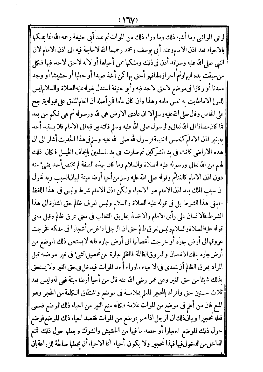 وَقَالَ - صَلَّى اللَّهُ عَلَيْهِ وَسَلَّمَ - «إلَّا أَنَّ عَادِيَّ الْأَرْضِ هِيَ لِلَّهِ، وَرَسُولِهِ ثُمَّ هِيَ لَكُمْ مِنْ بَعْدُ» فَمَا كَانَ مُضَافًا إلَى اللَّهِ تَعَالَى وَالرَّسُولِ - صَلَّى اللَّهُ عَلَيْهِ وَسَلَّمَ - فَالتَّدْبِيرُ فِيهِ إلَى الْإِمَامِ فَلَا يَسْتَبِدُّ أَحَدٌ بِهِ بِغَيْرِ إذْنِ الْإِمَامِ كَخُمُسِ الْغَنِيمَةِ فَرَسُولُ اللَّهِ - صَلَّى اللَّهُ عَلَيْهِ وَسَلَّمَ - فِي هَذَا الْحَدِيثِ أَشَارَ إلَى أَنَّ هَذِهِ الْأَرَاضِيَ كَانَتْ فِي يَدِ الْمُشْرِكِينَ ثُمَّ صَارَتْ فِي يَدِ الْمُسْلِمِينَ بِإِيجَافِ الْخَيْلِ فَكَانَ ذَلِكَ لَهُمْ مِنْ اللَّهِ تَعَالَى وَرَسُولِهِ - عَلَيْهِ الصَّلَاةُ وَالسَّلَامُ -، وَمَا كَانَ بِهَذِهِ الصِّفَةِ لَمْ يَخْتَصَّ أَحَدٌ بِشَيْءٍ مِنْهُ دُونَ إذْنِ الْإِمَامِ كَالْغَنَائِمِ.