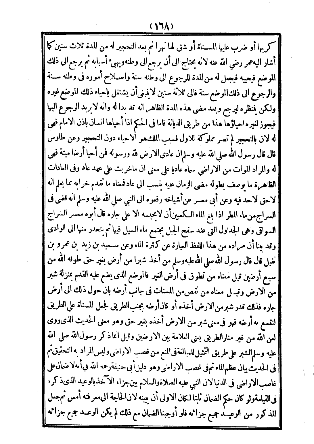 كَرَبَهَا أَوْ ضَرَبَ عَلَيْهَا الْمُسَنَّاةَ أَوْ شَقَّ لَهَا نَهْرًا ثُمَّ بَعْدَ التَّحْجِيرِ لَهُ مِنْ الْمُدَّةِ ثَلَاثُ سِنِينَ كَمَا أَشَارَ إلَيْهِ عُمَرُ - رَضِيَ اللَّهُ عَنْهُ -؛ لِأَنَّهُ يَحْتَاجُ إلَى أَنْ يَرْجِعَ إلَى وَطَنِهِ، وَيُهَيِّئَ أَسْبَابَهُ ثُمَّ يَرْجِعَ إلَى ذَلِكَ الْمَوْضِعِ فَيُحْيِيَهُ فَيُجْعَلُ لَهُ مِنْ الْمُدَّةِ لِلرُّجُوعِ إلَى وَطَنِهِ سَنَةً، وَإِصْلَاحِ أُمُورِهِ فِي وَطَنِهِ سَنَةً، وَالرُّجُوعِ إلَى ذَلِكَ الْمَوْضِعِ سَنَةً فَإِلَى ثَلَاثِ سِنِينَ لَا يَنْبَغِي أَنْ يَشْتَغِلَ بِإِحْيَاءِ ذَلِكَ الْمَوْضِعِ غَيْرُهُ، وَلَكِنْ يَنْتَظِرُهُ لِيَرْجِعَ، وَبَعْدَ مُضِيِّ هَذِهِ الْمُدَّةِ الظَّاهِرَ أَنَّهُ قَدْ بَدَا لَهُ، وَأَنَّهُ لَا يُرِيدُ الرُّجُوعَ إلَيْهَا فَيَجُوزُ لِغَيْرِهِ إحْيَاؤُهَا هَذَا مِنْ طَرِيقِ الدِّيَانَةِ فَأَمَّا فِي الْحُكْمِ إذَا أَحْيَاهَا إنْسَانٌ بِإِذْنِ الْإِمَامِ فَهِيَ لَهُ؛ لِأَنَّ بِالتَّحْجِيرِ لَمْ تَصِرْ مَمْلُوكَةً لِلْأَوَّلِ فَسَبَبُ الْمِلْكِ هُوَ الْإِحْيَاءُ دُونَ التَّحْجِيرِ، وَعَنْ طَاوُسٍ قَالَ قَالَ رَسُولُ اللَّهِ - صَلَّى اللَّهُ عَلَيْهِ وَسَلَّمَ -: «إنَّ عَادِيَّ الْأَرْضِ لِلَّهِ، وَرَسُولِهِ فَمَنْ أَحْيَا أَرْضًا مَيْتَةً فَهِيَ لَهُ»، وَالْمُرَادُ الْمَوَاتُ مِنْ الْأَرَاضِي سَمَّاهُ عَادِيًّا عَلَى مَعْنَى أَنَّهَا مَا خَرِبَتْ عَلَى عَهْدِ عَادٍ، وَفِي الْعَادَاتِ الظَّاهِرَةِ مَا يُوصَفُ بِطُولِ مُضِيِّ الزَّمَانِ عَلَيْهِ يُنْسَبُ إلَى عَادٍ فَمَعْنَاهُ مَا تَقَدَّمَ خَرَابُهُ مِمَّا يُعْلَمُ أَنَّهُ لَا حَقَّ لِأَحَدٍ فِيهِ، وَعَنْ أَبِي مُعَسِّرٍ عَنْ أَشْيَاخِهِ رَفَعُوهُ إلَى النَّبِيِّ - صَلَّى اللَّهُ عَلَيْهِ وَسَلَّمَ - «أَنَّهُ قَضَى فِي السِّرَاجِ مِنْ مَاءِ الْمَطَرِ إذَا بَلَغَ الْمَاءُ الْكَعْبَيْنِ أَنْ لَا يَحْبِسَهُ إلَّا عَلَى جَارِهِ» قَالَ أَبُو مُعَسِّرٍ السِّرَاجُ: السَّوَاقِي، وَهِيَ الْجَدَاوِلُ الَّتِي عِنْدَ سَفْحِ الْجَبَلِ يَجْتَمِعُ مَاءُ السَّيْلِ فِيهَا ثُمَّ يَنْحَدِرُ مِنْهَا إلَى الْوَادِي، وَقَدْ بَيَّنَّا أَنَّ مُرَادَهُ مِنْ هَذَا اللَّفْظِ الْعِبَارَةُ عَنْ كَثْرَةِ الْمَاءِ.