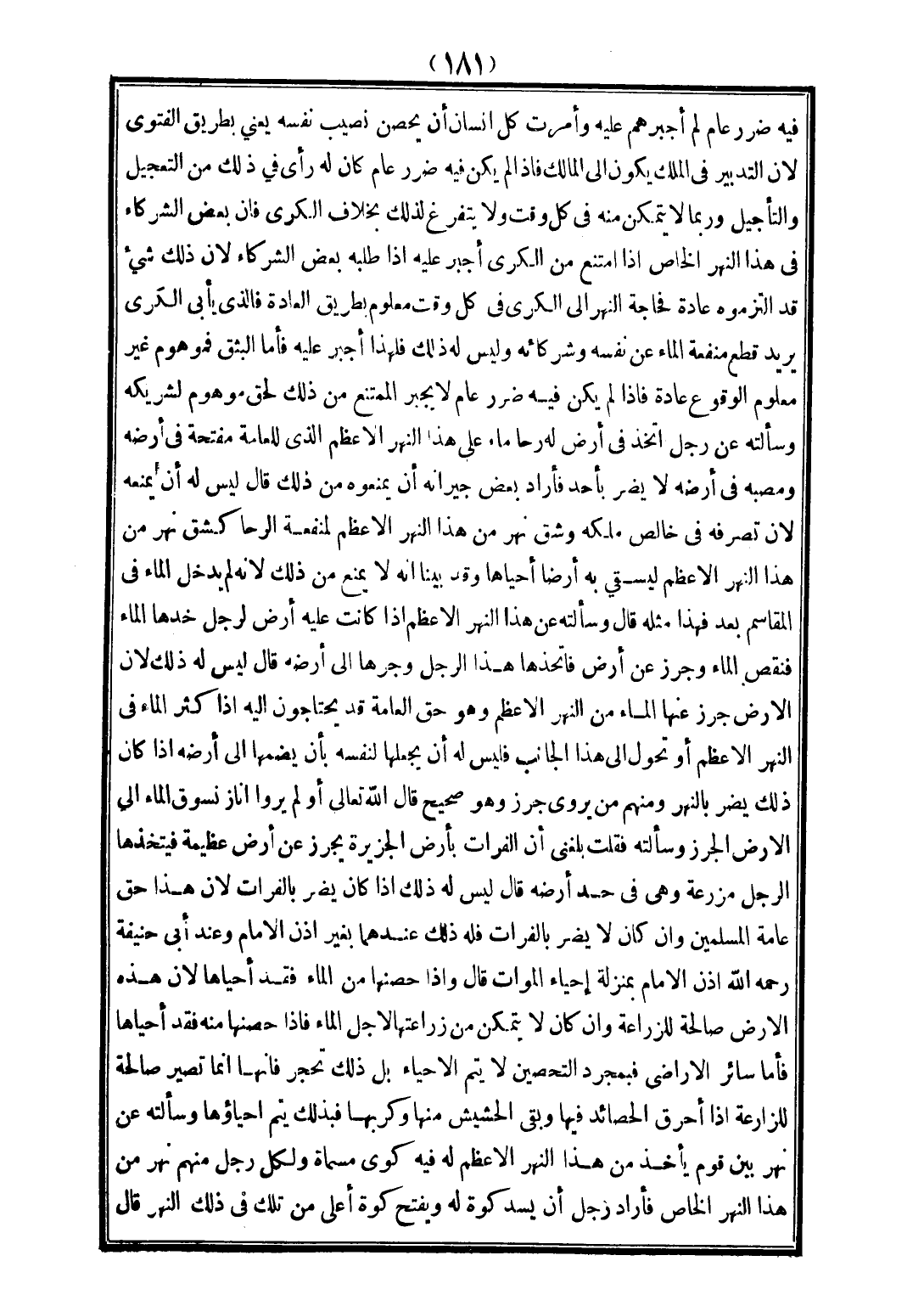 وَسَأَلَتْهُ عَنْ رَجُلٍ اتَّخَذَ فِي أَرْضٍ لَهُ رَحَا مَاءٍ عَلَى هَذَا النَّهْرِ الْأَعْظَمِ الَّذِي لِلْعَامَّةِ مِفْتَحُهُ فِي أَرْضِهِ، وَمَصَبُّهُ فِي أَرْضِهِ لَا يَضُرُّ بِأَحَدٍ فَأَرَادَ بَعْضُ جِيرَانِهِ أَنْ يَمْنَعُوهُ مِنْ ذَلِكَ قَالَ لَيْسَ لَهُ أَنْ يَمْنَعَهُ؛ لِأَنَّ تَصَرُّفَهُ فِي خَالِصِ مِلْكِهِ، وَشَقُّ نَهْرٍ مِنْ هَذَا النَّهْرِ الْأَعْظَمِ لِمَنْفَعَةِ الرَّحَا كَشِقِّ نَهْرٍ مِنْ هَذَا النَّهْرِ الْأَعْظَمِ لِيَسْقِيَ بِهِ أَرْضًا أَحْيَاهَا، وَقَدْ بَيَّنَّا أَنَّهُ لَا يُمْنَعُ مِنْ ذَلِكَ؛ لِأَنَّهُ لَمْ يُدْخِلْ الْمَاءَ فِي الْمَقَاسِمِ بَعْدُ فَهَذَا مِثْلُهُ.