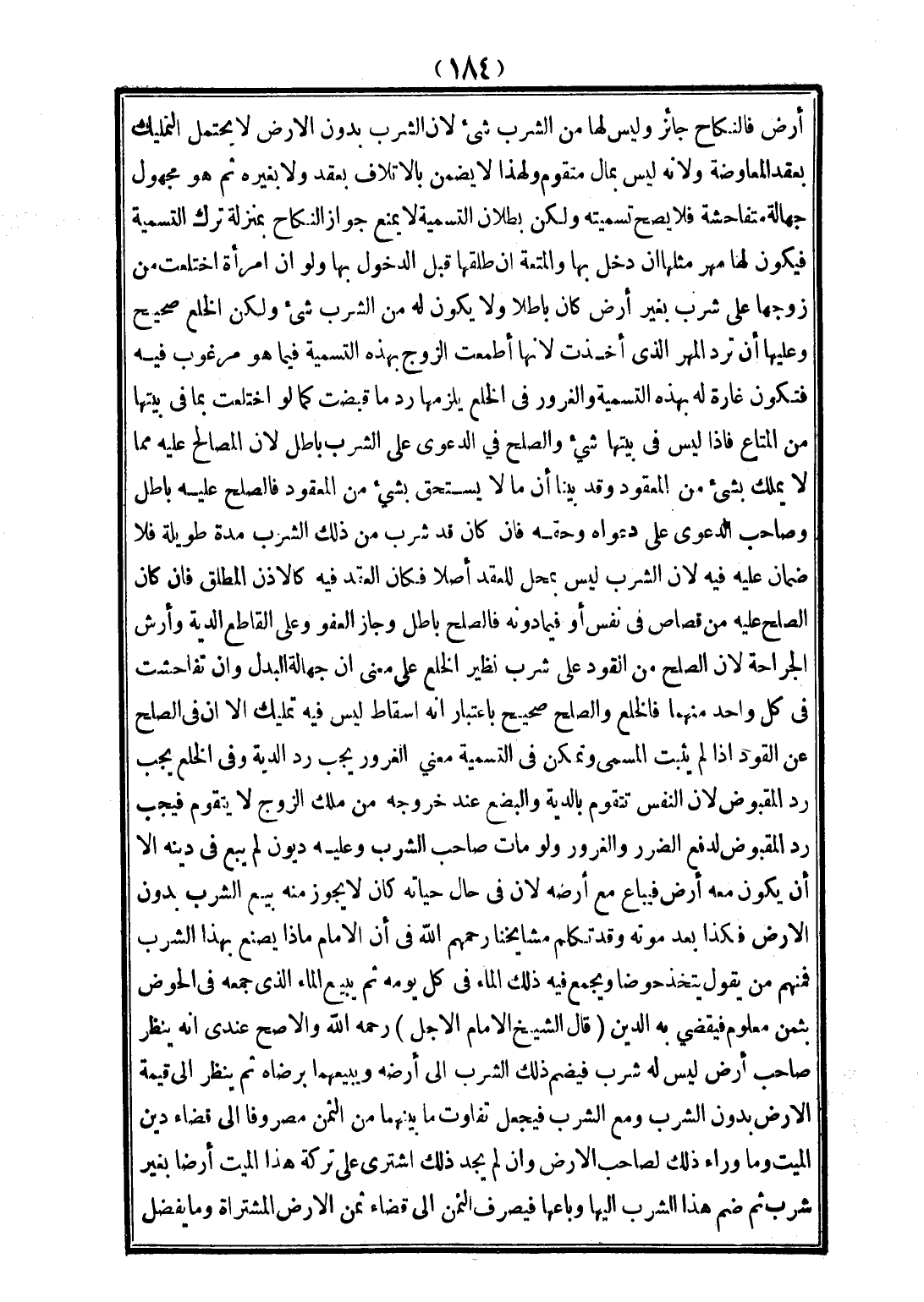 (قَالَ الشَّيْخُ الْإِمَامُ الْأَجَلُّ) - رَحِمَهُ اللَّهُ -، وَالْأَصَحُّ عِنْدِي أَنَّهُ يَنْظُرُ صَاحِبَ أَرْضٍ لَيْسَ لَهُ شِرْبٌ فَيَضُمُّ ذَلِكَ الشِّرْبَ إلَى أَرْضِهِ، وَيَبِيعُهَا بِرِضَاهُ ثُمَّ يَنْظُرُ إلَى قِيمَةِ الْأَرْضِ بِدُونِ الشِّرْبِ، وَمَعَ الشِّرْبِ فَيَجْعَلُ تَفَاوُتَ مَا بَيْنَهُمَا مِنْ الثَّمَنِ مَصْرُوفًا إلَى قَضَاءِ دَيْنِ الْمَيِّتِ، وَمَا، وَرَاءَ ذَلِكَ لِصَاحِبِ الْأَرْضِ، وَإِنْ لَمْ يَجِدْ ذَلِكَ اشْتَرَى عَلَى تَرِكَةِ هَذَا الْمَيِّتِ أَرْضًا بِغَيْرِ شِرْبٍ ثُمَّ ضَمَّ هَذَا الشِّرْبَ إلَيْهَا، وَبَاعَهَا فَيَصْرِفُ الثَّمَنَ إلَى قَضَاءِ ثَمَنِ الْأَرْضِ الْمُشْتَرَاةِ، وَمَا يَفْضُلُ