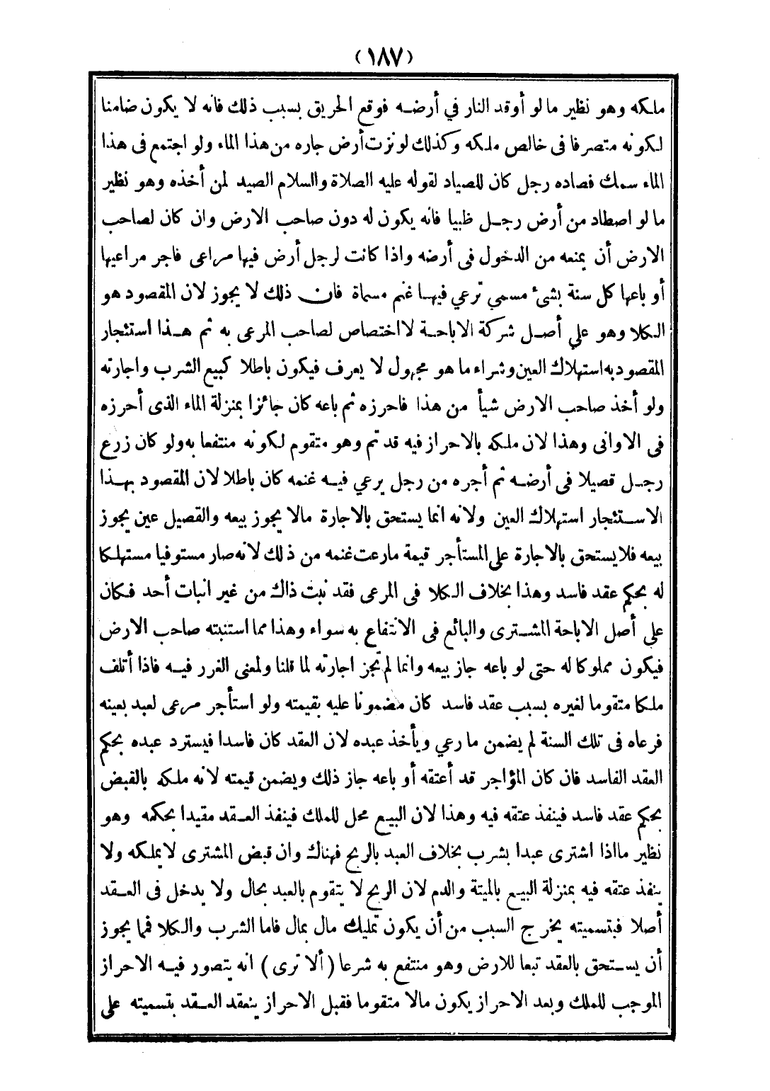 وَإِذَا كَانَتْ لِرَجُلٍ أَرْضٌ فِيهَا مَرَاعِي فَأَجَّرَ مَرَاعِيهَا أَوْ بَاعَهَا كُلُّ سَنَةٍ بِشَيْءٍ مُسَمًّى تَرْعَى فِيهَا غَنَمٌ مُسَمَّاةٌ فَإِنَّ ذَلِكَ لَا يَجُوزُ؛ لِأَنَّ الْمَقْصُودَ هُوَ الْكَلَأُ، وَهُوَ عَلَى أَصْلِ شَرِكَةِ الْإِبَاحَةِ لَا اخْتِصَاصَ لِصَاحِبِ الْمَرْعَى بِهِ ثُمَّ هَذَا اسْتِئْجَارٌ الْمَقْصُودُ بِهِ اسْتِهْلَاكُ الْعَيْنِ، وَشِرَاءُ مَا هُوَ مَجْهُولٌ لَا يُعْرَفُ فَيَكُونُ بَاطِلًا كَبَيْعِ الشِّرْبِ، وَإِجَارَتِهِ.