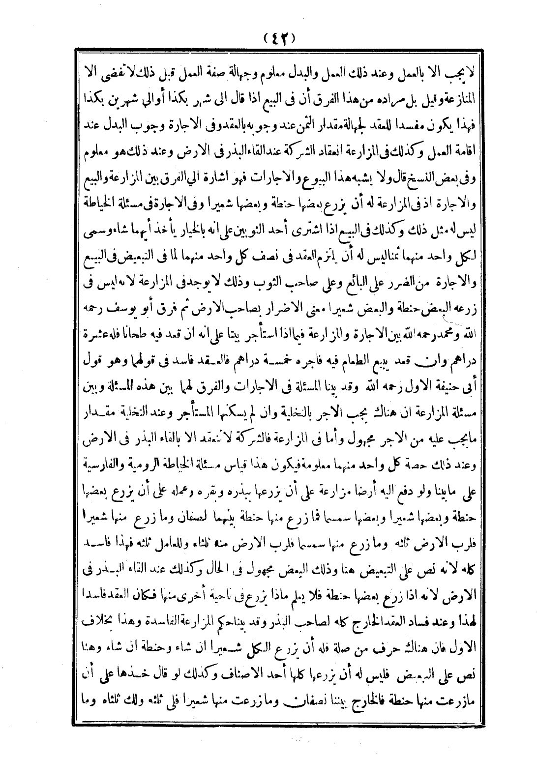 لَا يَجِبُ إلَّا بِالْعَمَلِ، وَعِنْدَ ذَلِكَ الْعَمَلُ وَالْبَدَلُ مَعْلُومٌ، وَجَهَالَةُ صِفَةِ الْعَمَلِ قَبْلَ ذَلِكَ لَا تُفْضِي إلَى الْمُنَازَعَةِ، وَقِيلَ: بَلْ مُرَادُهُ مِنْ هَذَا الْفَرْقِ أَنَّ فِي الْبَيْعِ إذَا قَالَ: إلَى شَهْرٍ بِكَذَا أَوْ إلَى شَهْرَيْنِ بِكَذَا فَهَذَا يَكُونُ مُفْسِدًا لِلْعَقْدِ لِجَهَالَةِ مِقْدَارِ الثَّمَنِ عِنْدَ وُجُوبِهِ بِالْعَقْدِ، وَفِي الْإِجَارَةِ وُجُوبُ الْبَدَلِ عِنْدَ إقَامَةِ الْعَمَلِ، وَكَذَلِكَ فِي الْمُزَارَعَةِ انْعِقَادُ الشَّرِكَةِ عِنْدَ إلْقَاءِ الْبَذْرِ فِي الْأَرْضِ، وَعِنْدَ ذَلِكَ هُوَ مَعْلُومٌ، وَفِي بَعْضِ النُّسَخِ قَالَ: وَلَا يُشْبِهُ هَذَا الْبُيُوعَ وَالْإِجَارَاتِ، فَهُوَ إشَارَةٌ إلَى الْفَرْقِ بَيْنَ الْمُزَارَعَةِ وَالْبَيْعِ وَالْإِجَارَةِ، إذْ فِي الْمُزَارَعَةِ لَهُ أَنْ يَزْرَعَ بَعْضَهَا حِنْطَةً، وَبَعْضَهَا شَعِيرًا، وَفِي الْإِجَارَةِ فِي مَسْأَلَةِ الْخِيَاطَةِ لَيْسَ لَهُ مِثْلُ ذَلِكَ، وَكَذَلِكَ فِي الْبَيْعِ إذَا اشْتَرَى أَحَدَ الثَّوْبَيْنِ عَلَى أَنَّهُ بِالْخِيَارِ يَأْخُذُ أَيَّهمَا شَاءَ، وَسَمَّى لِكُلِّ وَاحِدٍ مِنْهُمَا ثَمَنًا لَيْسَ لَهُ أَنْ يَلْتَزِمَ الْعَقْدَ فِي نِصْفِ كُلِّ وَاحِدٍ مِنْهُمَا لِمَا فِي التَّبْعِيضِ فِي الْبَيْعِ وَالْإِجَارَةِ مِنْ الضَّرَرِ عَلَى الْبَائِعِ، وَعَلَى صَاحِبِ الثَّوْبِ، وَذَلِكَ لَا يُوجَدُ فِي الْمُزَارَعَةِ؛ لِأَنَّهُ لَيْسَ فِي زَرْعِهِ الْبَعْضَ حِنْطَةً وَالْبَعْضَ شَعِيرًا مَعْنَى الْإِضْرَارِ بِصَاحِبِ الْأَرْضِ، ثُمَّ فَرَّقَ أَبُو يُوسُفَ - رَحِمَهُ اللَّهُ - وَمُحَمَّدٌ - رَحِمَهُ اللَّهُ - بَيْنَ الْإِجَارَةِ وَالْمُزَارَعَةِ فِيمَا إذَا اسْتَأْجَرَ بَيْتًا عَلَى أَنَّهُ إنْ قَعَدَ فِيهِ طَحَّانًا فَلَهُ عَشَرَةُ دَرَاهِمَ وَإِنْ قَعَدَ يَبِيعُ الطَّعَامَ فِيهِ فَأَجْرُهُ خَمْسَةُ دَرَاهِمَ فَالْعَقْدُ فَاسِدٌ فِي قَوْلِهِمَا، وَهُوَ قَوْلُ أَبِي حَنِيفَةَ الْأَوَّلُ - رَحِمَهُ اللَّهُ - وَقَدْ بَيَّنَّا الْمَسْأَلَةَ فِي الْإِجَارَاتِ، وَالْفَرْقُ لَهُمَا بَيْنَ هَذِهِ الْمَسْأَلَةِ، وَبَيْنَ مَسْأَلَةِ الْمُزَارَعَةِ أَنَّ هُنَاكَ يَجِبُ الْأَجْرُ بِالتَّخْلِيَةِ وَإِنْ لَمْ يَسْكُنْهَا الْمُسْتَأْجِرُ، وَعِنْدَ التَّخْلِيَةِ مِقْدَارُ مَا يَجِبُ عَلَيْهِ مِنْ الْأَجْرِ مَجْهُولٌ، وَأَمَّا فِي الْمُزَارَعَةِ فَالشَّرِكَةُ لَا تَنْعَقِدُ إلَّا بِإِلْقَاءِ الْبَذْرِ فِي الْأَرْضِ، وَعِنْدَ ذَلِكَ حِصَّةُ كُلِّ وَاحِدٍ مِنْهُمَا مَعْلُومَةٌ، فَيَكُونُ هَذَا قِيَاسَ مَسْأَلَةِ الْخِيَاطَةِ الرُّومِيَّةِ وَالْفَارِسِيَّةِ عَلَى مَا بَيَّنَّا