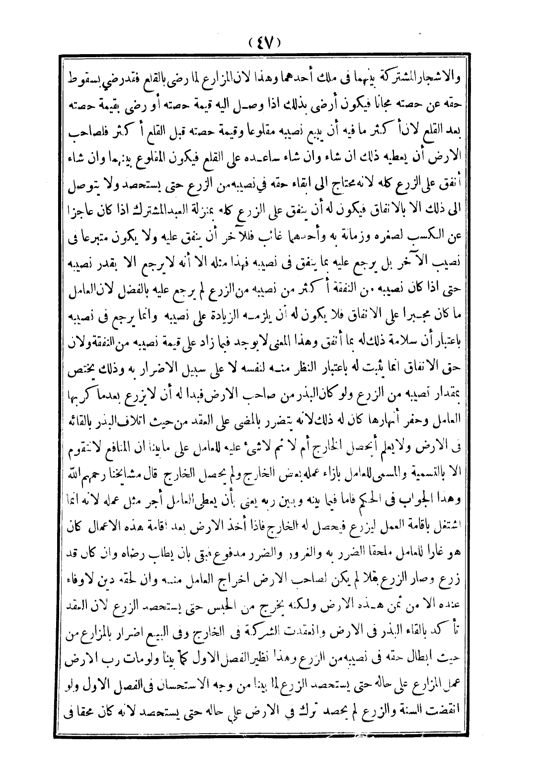 وَالْأَشْجَارِ الْمُشْتَرَكَةِ بَيْنَهُمَا فِي مِلْكِ أَحَدِهِمَا، وَهَذَا؛ لِأَنَّ الْمُزَارِعَ لَمَّا رَضِيَ بِالْقَلْعِ فَقَدْ رَضِيَ بِسُقُوطِ حَقِّهِ عَنْ حِصَّتِهِ مَجَّانًا، فَيَكُونُ أَرْضَى بِذَلِكَ إذَا وَصَلَ إلَيْهِ قِيمَةُ حِصَّتِهِ أَوْ رَضِيَ بِقِيمَةِ حِصَّتِهِ بَعْدَ الْقَلْعِ؛ لِأَنَّ أَكْثَرَ مَا فِيهِ أَنْ يَبِيعَ نَصِيبَهُ مَقْلُوعًا، وَقِيمَةُ حِصَّتِهِ قَبْلَ الْقَلْعِ أَكْثَرُ، فَلِصَاحِبِ الْأَرْضِ أَنْ يُعْطِيَهُ ذَلِكَ إنْ شَاءَ، وَإِنْ شَاءَ سَاعَدَهُ عَلَى الْقَلْعِ، فَيَكُونُ الْمَقْلُوعُ بَيْنَهُمَا، وَإِنْ شَاءَ أَنْفَقَ عَلَى الزَّرْعِ كُلِّهِ؛ لِأَنَّهُ مُحْتَاجٌ إلَى إبْقَاءِ حَقِّهِ فِي نَصِيبِهِ مِنْ الزَّرْعِ حَتَّى يُسْتَحْصَدَ، وَلَا يُتَوَصَّلُ إلَى ذَلِكَ إلَّا بِالْإِنْفَاقِ، فَيَكُونُ لَهُ أَنْ يُنْفِقَ عَلَى الزَّرْعِ كُلِّهِ بِمَنْزِلَةِ الْعَبْدِ الْمُشْتَرَكِ إذَا كَانَ عَاجِزًا عَنْ الْكَسْبِ لِصِغَرِهِ وَزَمَانَةٍ بِهِ، وَأَحَدُهُمَا غَائِبٌ فَلِلْآخَرِ أَنْ يُنْفِقَ عَلَيْهِ، وَلَا يَكُونُ مُتَبَرِّعًا فِي نَصِيبِ الْآخَرِ، بَلْ يَرْجِعُ عَلَيْهِ بِمَا يُنْفِقُ فِي نَصِيبِهِ، فَهَذَا مِثْلُهُ إلَّا أَنَّهُ لَا يَرْجِعُ إلَّا بِقَدْرِ نَصِيبِهِ حَتَّى إذَا كَانَ نَصِيبُهُ مِنْ النَّفَقَةِ أَكْثَرَ مِنْ نَصِيبِهِ مِنْ الزَّرْعِ لَمْ يَرْجِعْ عَلَيْهِ بِالْفَضْلِ؛ لِأَنَّ الْعَامِلَ مَا كَانَ مُجْبَرًا عَلَى الْإِنْفَاقِ فَلَا يَكُونُ لَهُ أَنْ يُلْزِمَهُ الزِّيَادَةَ عَلَى نَصِيبِهِ، وَإِنَّمَا يَرْجِعُ فِي نَصِيبِهِ بِاعْتِبَارِ أَنَّ سَلَامَةَ ذَلِكَ لَهُ بِمَا أَنْفَقَ، وَهَذَا الْمَعْنَى لَا يُوجَدُ فِيمَا زَادَ عَلَى قِيمَةِ نَصِيبِهِ مِنْ النَّفَقَةِ، وَلِأَنَّ حَقَّ الْإِنْفَاقِ إنَّمَا يَثْبُتُ لَهُ بِاعْتِبَارِ النَّظَرِ مِنْهُ لِنَفْسِهِ لَا عَلَى سَبِيلِ الْإِضْرَارِ بِهِ، وَذَلِكَ يَخْتَصُّ بِمِقْدَارِ نَصِيبِهِ مِنْ الزَّرْعِ، وَلَوْ كَانَ الْبَذْرُ مِنْ صَاحِبِ الْأَرْضِ، فَبَدَا لَهُ أَنْ لَا يَزْرَعَ بَعْدَ مَا كَرَبَهَا الْعَامِلُ، وَحَفَرَ أَنْهَارَهَا كَانَ لَهُ ذَلِكَ؛ لِأَنَّهُ يَتَضَرَّرُ بِالْمُضِيِّ عَلَى الْعَقْدِ مِنْ حَيْثُ إتْلَافُ الْبَذْرِ بِإِلْقَائِهِ فِي الْأَرْضِ وَلَا يَعْلَمُ أَيُحَصِّلُ الْخَارِجَ أَمْ لَا؟ ثُمَّ لَا شَيْءَ عَلَيْهِ لِلْعَامِلِ عَلَى مَا بَيَّنَّا أَنَّ الْمَنَافِعَ لَا تَتَقَوَّمُ إلَّا بِالتَّسْمِيَةِ، وَالْمُسَمَّى لِلْعَامِلِ بِإِزَاءِ عَمَلِهِ بَعْضُ الْخَارِجِ، وَلَمْ يُحَصِّلْ الْخَارِجَ قَالَ مَشَايِخُنَا - رَحِمَهُمُ اللَّهُ -: وَهَذَا الْجَوَابُ فِي الْحُكْمِ، فَأَمَّا فِيمَا بَيْنَهُ وَبَيْنَ رَبِّهِ يَعْنِي بِأَنْ يُعْطِيَ الْعَامِلَ أَجْرَ مِثْلِ عَمَلِهِ؛ لِأَنَّهُ إنَّمَا اشْتَغَلَ بِإِقَامَةِ الْعَمَلِ لِيَزْرَعَ فَيَحْصُلُ لَهُ الْخَارِجُ، فَإِذَا أَخَذَ الْأَرْضَ بَعْدَ إقَامَةِ هَذِهِ الْأَعْمَالِ كَانَ هُوَ غَارًّا لِلْعَامِلِ مُلْحِقًا الضَّرَرَ بِهِ، وَالْغُرُورُ وَالضَّرَرُ مَدْفُوعٌ فَبَقِيَ بِأَنْ يَطْلُبَ رِضَاهُ، وَإِنْ كَانَ قَدْ زَرَعَ وَصَارَ الزَّرْعُ بَقْلًا لَمْ يَكُنْ لِصَاحِبِ الْأَرْضِ إخْرَاجُ الْعَامِلِ مِنْهُ، وَإِنْ لَحِقَهُ دَيْنٌ لَا وَفَاءَ عِنْدَهُ إلَّا مِنْ ثَمَنِ هَذِهِ الْأَرْضِ، وَلَكِنَّهُ يُخْرَجُ مِنْ الْحَبْسِ حَتَّى يَسْتَحْصِدَ الزَّرْعَ؛ لِأَنَّ الْعَقْدَ تَأَكَّدَ بِإِلْقَاءِ الْبَذْرِ فِي الْأَرْضِ، وَانْعَقَدَتْ الشَّرِكَةُ فِي الْخَارِجِ، وَفِي الْبَيْعِ إضْرَارٌ بِالْمُزَارِعِ مِنْ حَيْثُ إبْطَالُ حَقِّهِ فِي نَصِيبِهِ مِنْ الزَّرْعِ، وَهَذَا نَظِيرُ الْفَصْلِ الْأَوَّل
