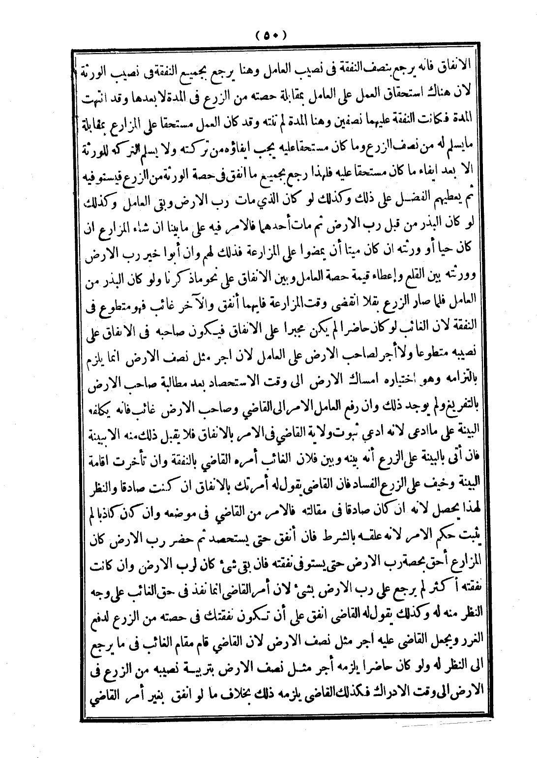 الْإِنْفَاقَ فَإِنَّهُ يَرْجِعُ بِنِصْفِ النَّفَقَةِ فِي نَصِيبِ الْعَامِلِ، وَهُنَا يَرْجِعُ بِجَمِيعِ النَّفَقَةِ فِي نَصِيبِ الْوَرَثَةِ؛ لِأَنَّ هُنَاكَ اسْتِحْقَاقَ الْعَمَلِ عَلَى الْعَامِلِ بِمُقَابَلَةِ حِصَّتِهِ مِنْ الزَّرْعِ فِي الْمُدَّةِ لَا بَعْدَهَا، وَقَدْ انْتَهَتْ الْمُدَّةُ، فَكَانَتْ النَّفَقَةُ عَلَيْهِمَا نِصْفَيْنِ، وَهُنَا الْمُدَّةُ لَمْ تَنْتَهِ، وَقَدْ كَانَ الْعَمَلُ مُسْتَحَقًّا عَلَى الْمُزَارِعِ بِمُقَابَلَةِ مَا يُسَلَّمُ لَهُ مِنْ نِصْفِ الزَّرْعِ، وَمَا كَانَ مُسْتَحَقًّا عَلَيْهِ يَجِبُ إيفَاؤُهُ مِنْ تَرِكَتِهِ، وَلَا يُسَلِّمُ التَّرِكَةَ لِلْوَرَثَةِ إلَّا بَعْدَ إيفَاءِ مَا كَانَ مُسْتَحَقًّا عَلَيْهِ؛ فَلِهَذَا رَجَعَ بِجَمِيعِ مَا أَنْفَقَ فِي حِصَّةِ الْوَرَثَةِ مِنْ الزَّرْعِ، فَيَسْتَوْفِيهِ ثُمَّ يُعْطِيهِمْ الْفَضْلَ عَلَى ذَلِكَ، وَكَذَلِكَ لَوْ كَانَ الَّذِي مَاتَ رَبَّ الْأَرْضِ وَبَقِيَ الْعَامِلُ، وَكَذَلِكَ لَوْ كَانَ الْبَذْرُ مِنْ قِبَلِ رَبِّ الْأَرْضِ ثُمَّ مَاتَ أَحَدُهُمَا، فَالْأَمْرُ فِيهِ عَلَى مَا بَيَّنَّا إنْ شَاءَ الْمُزَارِعُ إنْ كَانَ حَيًّا أَوْ وَرَثَتُهُ إنْ كَانَ مَيِّتًا أَنْ يَمْضُوا عَلَى الْمُزَارَعَةِ، فَذَلِكَ لَهُمْ، وَإِنْ أَبَوْا خُيِّرَ رَبُّ الْأَرْضِ وَوَرَثَتُهُ بَيْنَ الْقَلْعِ، وَإِعْطَاءِ قِيمَةِ حِصَّةِ الْعَامِلِ وَبَيْنَ الْإِنْفَاقِ عَلَى نَحْوِ مَا ذَكَرْنَا، وَلَوْ كَانَ الْبَذْرُ مِنْ الْعَامِلِ فَلَمَّا صَارَ الزَّرْعُ بَقْلًا انْقَضَى وَقْتُ الْمُزَارَعَةِ، فَأَيُّهُمَا أَنْفَقَ، وَالْآخَرُ غَائِبٌ فَهُوَ مُتَطَوِّعٌ فِي النَّفَقَةِ؛ لِأَنَّ الْغَائِبَ لَوْ كَانَ حَاضِرًا لَمْ يَكُنْ مُجْبَرًا عَلَى الْإِنْفَاقِ، فَيَكُونُ صَاحِبُهُ فِي الْإِنْفَاقِ عَلَى نَصِيبِهِ مُتَطَوِّعًا، وَلَا أَجْرَ لِصَاحِبِ الْأَرْضِ عَلَى الْعَامِلِ؛ لِأَنَّ أَجْرَ مِثْلِ نِصْفِ الْأَرْضِ إنَّمَا يَلْزَمُ بِالْتِزَامِهِ، وَهُوَ اخْتِيَارُهُ إمْسَاكَ الْأَرْضِ إلَى وَقْتِ الِاسْتِحْصَادِ بَعْدَ مُطَالَبَةِ صَاحِبِ الْأَرْضِ بِالتَّفْرِيغِ، وَلَمْ يُوجَدْ ذَلِكَ، وَإِنْ رَفَعَ الْعَامِلُ الْأَمْرَ إلَى الْقَاضِي، وَصَاحِبُ الْأَرْضِ غَائِبٌ، فَإِنَّهُ يُكَلِّفُهُ الْبَيِّنَةَ عَلَى مَا ادَّعَى؛ لِأَنَّهُ ادَّعَى ثُبُوتَ وِلَايَةِ الْقَاضِي فِي الْأَمْرِ بِالْإِنْفَاقِ، فَلَا يُقْبَلُ ذَلِكَ مِنْهُ إلَّا بِبَيِّنَةٍ، فَإِنْ أَتَى بِالْبَيِّنَةِ عَلَى الزَّرْعِ أَنَّهُ بَيْنَهُ وَبَيْنَ فُلَانٍ الْغَائِبِ أَمَرَهُ الْقَاضِي بِالنَّفَقَةِ، وَإِنْ تَأَخَّرَتْ إقَامَةُ الْبَيِّنَةِ، وَخِيفَ عَلَى الزَّرْعِ الْفَسَادُ، فَإِنَّ الْقَاضِيَ يَقُولُ لَهُ؛ أَمَرْتُكَ بِالْإِنْفَاقِ إنْ كُنْت صَادِقًا، وَالنَّظَرُ لِهَذَا يَحْصُلُ؛ لِأَنَّهُ إنْ كَانَ صَادِقًا فِي مَقَالَتِهِ فَالْأَمْرُ مِنْ الْقَاضِي فِي مَوْضِعِهِ، وَإِنْ كَانَ كَاذِبًا لَمْ يَثْبُتْ حُكْمُ الْأَمْرِ؛ لِأَنَّهُ عَلَّقَهُ بِالشَّرْطِ، فَإِنْ أَنْفَقَ حَتَّى يُسْتَحْصَدَ ثُمَّ حَضَرَ رَبُّ الْأَرْضِ كَانَ الْمُزَارِعُ أَحَقَّ بِحِصَّةِ رَبِّ الْأَرْضِ حَتَّى يَسْتَوْفِيَ نَفَقَتَهُ، فَإِنْ بَقِيَ شَيْءٌ كَانَ لِرَبِّ الْأَرْضِ، وَإِنْ كَانَتْ نَفَقَتُهُ أَكْثَرَ لَمْ يَرْجِعْ عَلَى رَبِّ الْأَرْضِ؛ لِأَنَّ أَمْرَ الْقَاضِي إنَّمَا نَفَذَ فِي حَقِّ الْغَائِبِ عَلَى وَجْهِ النَّظَرِ مِنْهُ لَهُ، وَكَذَلِكَ يَقُولُ لَهُ الْقَاضِي: أَنْفِقْ عَلَى أَنْ تَكُونَ نَفَقَتُكَ فِي حِصَّتِهِ مِنْ الزَّرْعِ لِدَفْعِ الْغَرَرِ، وَيَجْعَلُ الْقَاضِي عَلَيْهِ مِثْلَ أَجْرِ نِصْفِ الْأَرْضِ؛ لِأَنَّ الْقَاضِيَ قَامَ 