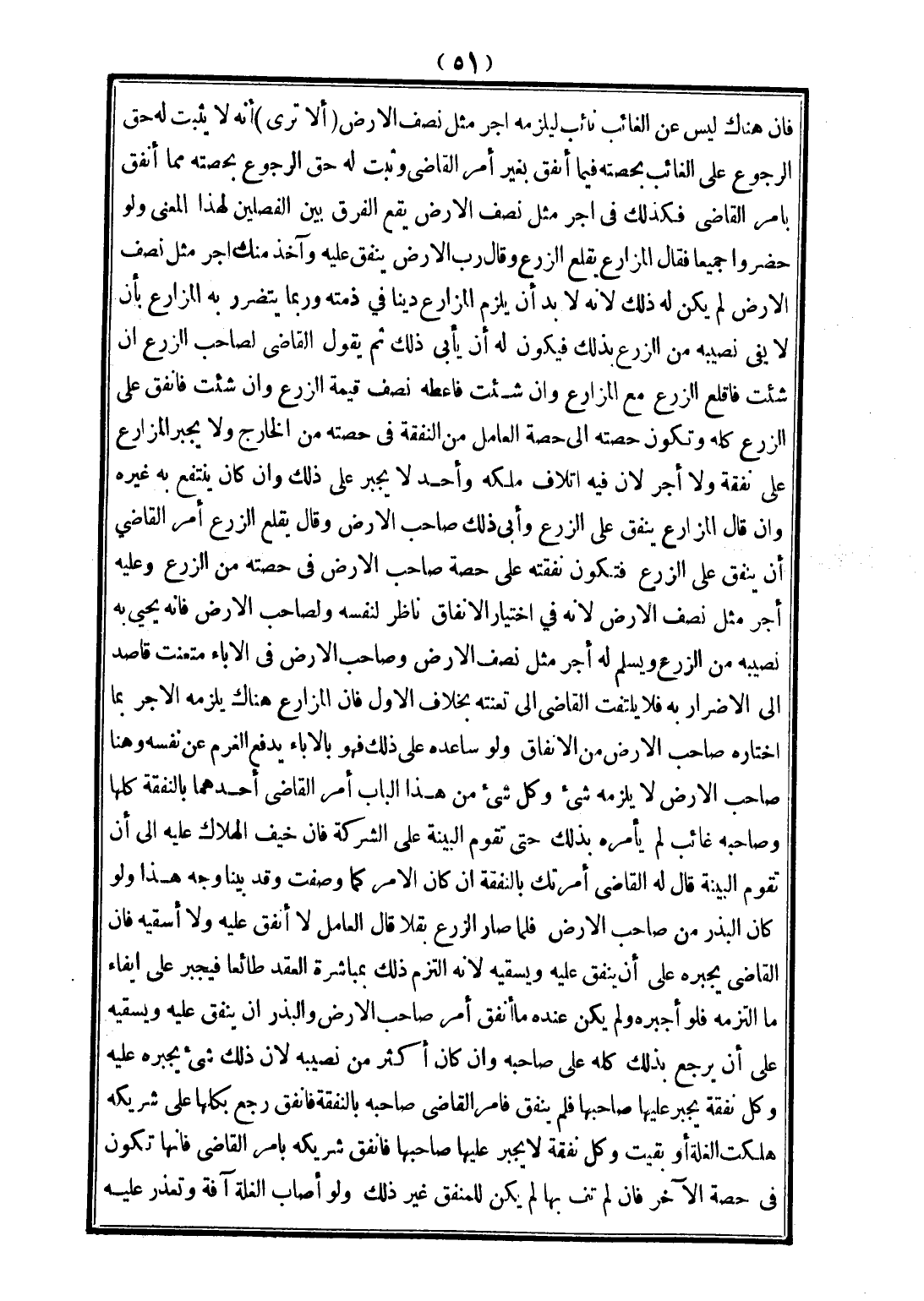 (أَلَا تَرَى) أَنَّهُ لَا يَثْبُتُ لَهُ حَقُّ الرُّجُوعِ عَلَى الْغَائِبِ بِحِصَّتِهِ فِيمَا أَنْفَقَ بِغَيْرِ أَجْرِ الْقَاضِي، وَثَبَتَ لَهُ حَقُّ الرُّجُوعِ بِحِصَّتِهِ مِمَّا أَنْفَقَ بِأَمْرِ الْقَاضِي، فَكَذَلِكَ فِي أَجْرِ مِثْلِ نِصْفِ الْأَرْضِ يَقَعُ الْفَرْقُ بَيْنَ الْفَصْلَيْنِ؛ لِهَذَا الْمَعْنَى، وَلَوْ حَضَرُوا جَمِيعًا فَقَالَ الْمُزَارِعُ: يَقْلَعُ الزَّرْعَ، وَقَالَ رَبُّ الْأَرْضِ: يُنْفِقُ عَلَيْهِ وَآخُذُ مِنْك أَجْرَ مِثْلِ نِصْفِ الْأَرْضِ لَمْ يَكُنْ لَهُ ذَلِكَ؛ لِأَنَّهُ لَا بُدَّ أَنْ يَلْزَمَ الْمُزَارِعُ دَيْنًا فِي ذِمَّتِهِ وَرُبَّمَا يَتَضَرَّرُ بِهِ الْمُزَارِعُ بِأَنْ لَا يَفِيَ نَصِيبُهُ مِنْ الزَّرْعِ بِذَلِكَ، فَيَكُونَ لَهُ أَنْ يَأْبَى ذَلِكَ، ثُمَّ يَقُولُ الْقَاضِي لِصَاحِبِ الزَّرْعِ: إنْ شِئْتَ فَاقْلَعْ الزَّرْعَ مَعَ الْمُزَارِعِ، وَإِنْ شِئْتَ فَأَعْطِهِ نِصْفَ قِيمَةِ الزَّرْعِ، وَإِنْ شِئْتَ فَأَنْفِقْ عَلَى الزَّرْعِ كُلِّهِ، وَتَكُونُ حِصَّتُهُ إلَى حِصَّةِ الْعَامِلِ مِنْ النَّفَقَةِ فِي حِصَّتِهِ مِنْ الْخَارِجِ، وَلَا يُجْبَرُ الْمُزَارِعُ عَلَى نَفَقَةٍ وَلَا أَجْرٍ؛ لِأَنَّ فِيهِ إتْلَافَ مِلْكِهِ، وَأَحَدٌ لَا يُجْبَرُ عَلَى ذَلِكَ، وَإِنْ كَانَ يَنْتَفِعُ بِهِ غَيْرُهُ، وَإِنْ قَالَ الْمُزَارِعُ: يُنْفِقُ عَلَى الزَّرْعِ، وَأَبَى ذَلِكَ صَاحِبُ الْأَرْضِ وَقَالَ: يَقْلَعُ الزَّرْعَ أَمْرُ الْقَاضِي أَنْ يُنْفِقَ عَلَى الزَّرْعِ فَتَكُونُ نَفَقَتُهُ عَلَى حِصَّةِ صَاحِبِ الْأَرْضِ فِي حِصَّتِهِ مِنْ الزَّرْعِ، وَعَلَيْهِ أَجْرُ مِثْلِ نِصْفِ الْأَرْضِ؛ لِأَنَّهُ فِي اخْتِيَارِ الْإِنْفَاقِ نَاظِرٌ لِنَفْسِهِ، وَلِصَاحِبِ الْأَرْضِ، فَإِنَّهُ يُحْيِي بِهِ نَصِيبَهُ مِنْ الزَّرْعِ، وَيُسَلِّمُ لَهُ أَجْرَ مِثْلِ نِصْفِ الْأَرْضِ، وَصَاحِبُ الْأَرْضِ فِي الْإِبَاءِ مُتَعَنِّتٌ قَاصِدٌ إلَى الْإِضْرَارِ بِهِ، فَلَا يَلْتَفِتُ الْقَاضِي إلَى تَعَنُّتِهِ بِخِلَافِ الْأَوَّلِ، فَإِنَّ الْمُزَارِعَ هُنَاكَ يَلْزَمُهُ الْأَجْرُ بِمَا اخْتَارَهُ صَاحِبُ الْأَرْضِ مِنْ الْإِنْفَاقِ، وَلَوْ سَاعَدَهُ عَلَى ذَلِكَ فَهُوَ بِالْإِبَاءِ يَدْفَعُ الْغُرْمَ عَنْ نَفْسِهِ، وَهُنَا صَاحِبُ الْأَرْضِ لَا يَلْزَمُهُ شَيْءٌ وَكُلُّ شَيْءٍ مِنْ هَذَا الْبَابِ أَمَرَ الْقَاضِي أَحَدَهُمَا بِالنَّفَقَةِ كُلِّهَا، وَصَاحِبُهُ غَائِبٌ لَمْ يَأْمُرْهُ بِذَلِكَ حَتَّى تَقُومَ الْبَيِّنَةُ عَلَى الشَّرِكَةِ، فَإِنْ خِيفَ الْهَلَاكُ عَلَيْهِ إلَى أَنْ تَقُومَ الْبَيِّنَةُ، قَالَ لَهُ الْقَاضِي: أَمَرْتُكَ بِالنَّفَقَةِ إنْ كَانَ الْأَمْرُ كَمَا وَصَفْتَ، وَقَدْ بَيَّنَّا وَجْهَ هَذَا، وَلَوْ كَانَ الْبَذْرُ مِنْ صَاحِبِ الْأَرْضِ فَلَمَّا صَارَ الزَّرْعُ بَقْلًا قَالَ الْعَامِلُ: لَا أُنْفِقُ عَلَيْهِ، وَلَا أَسْقِيهِ فَإِنَّ الْقَاضِيَ يُجْبِرُهُ عَلَى أَنْ يُنْفِقَ عَلَيْهِ، وَيَسْقِيَهُ؛ لِأَنَّهُ الْتَزَمَ ذَلِكَ بِمُبَاشَرَةِ الْعَقْدِ طَائِعًا فَيُجْبَرُ عَلَى إيفَاءِ مَا الْتَزَمَهُ، فَلَوْ أَجْبَرَهُ، وَلَمْ يَكُنْ عِنْدَهُ مَا أَنْفَقَ أُمِرَ صَاحِبُ الْأَرْضِ وَالْبَذْرِ أَنْ يُنْفِقَ عَلَيْهِ وَيَسْقِيَهُ عَلَى أَنْ يَرْجِعَ بِذَلِكَ كُلِّهِ عَلَى صَاحِبِهِ، وَإِنْ كَانَ أَكْثَرَ مِنْ نَصِيبِهِ؛ لِأَنَّ ذَلِكَ شَيْءٌ يُجْبِرُهُ عَلَيْهِ، وَكُلُّ نَفَقَةٍ يُجْبَرُ عَلَيْهَا صَاحِبُهَا، فَلَمْ يُنْفِقْ، فَأَمَرَ الْقَاضِي صَاحِبَهُ بِالنَّفَقَةِ، فَأَنْفَقَ رَجَعَ بِكُلِّهَا عَلَى شَرِيكِهِ هَلَكَتْ الْغَلَّةُ أَوْ بَقِيَتْ، وَكُلُّ نَفَقَةٍ لَا يُجْبَرُ عَلَيْهَا صَاحِبُهَا فَأَنْفَقَ شَرِيكُهُ بِأَ
