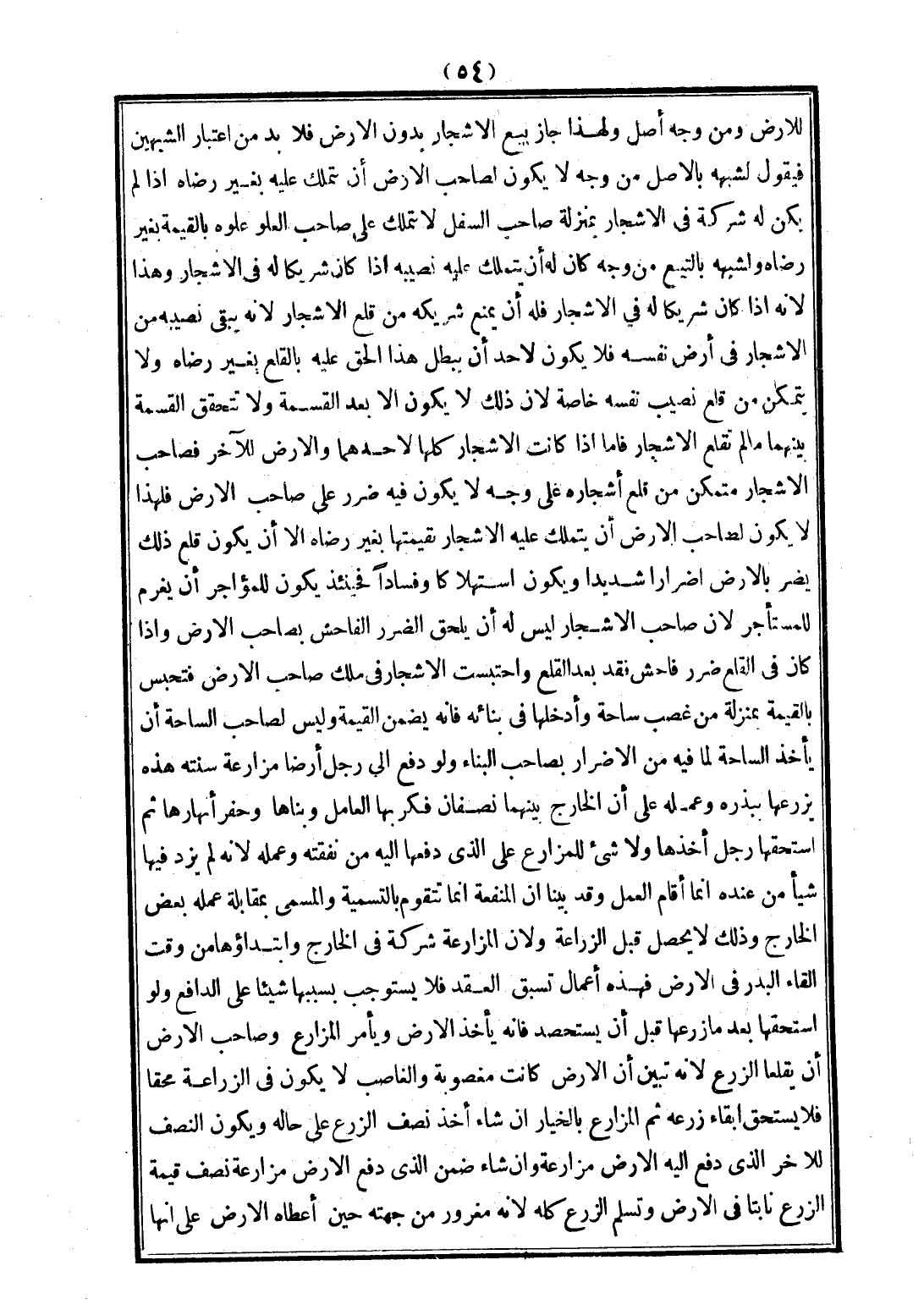 لِلْأَرْضِ، وَمِنْ وَجْهٍ أَصْلٌ؛ وَلِهَذَا جَازَ بَيْعُ الْأَشْجَارِ بِدُونِ الْأَرْضِ، فَلَا بُدَّ مِنْ اعْتِبَارِ الشَّبَهَيْنِ، فَيَقُولُ لِشَبَهِهِ بِالْأَصْلِ مِنْ وَجْهٍ: لَا يَكُونُ لِصَاحِبِ الْأَرْضِ أَنْ يَتَمَلَّكَ عَلَيْهِ بِغَيْرِ رِضَاهُ إذَا لَمْ يَكُنْ لَهُ شَرِكَةٌ فِي الْأَشْجَارِ بِمَنْزِلَةِ صَاحِبِ السُّفْلِ لَا يَتَمَلَّكُ عَلَى صَاحِبِ الْعُلُوِّ عُلُوَّهُ بِالْقِيمَةِ بِغَيْرِ رِضَاهُ، وَلِشَبَهِهِ بِالتَّبَعِ مِنْ وَجْهٍ كَانَ لَهُ أَنْ يَتَمَلَّكَ عَلَيْهِ نَصِيبَهُ إذَا كَانَ شَرِيكًا لَهُ فِي الْأَشْجَارِ، وَهَذَا؛ لِأَنَّهُ إذَا كَانَ شَرِيكًا لَهُ فِي الْأَشْجَارِ فَلَهُ أَنْ يَمْنَعَ شَرِيكَهُ مِنْ قَلْعِ الْأَشْجَارِ؛ لِأَنَّهُ يُبْقِي نَصِيبَهُ مِنْ الْأَشْجَارِ فِي أَرْضِ نَفْسِهِ، فَلَا يَكُونُ لِأَحَدٍ أَنْ يُبْطِلَ هَذَا الْحَقَّ عَلَيْهِ بِالْقَلْعِ بِغَيْرِ رِضَاهُ، وَلَا يَتَمَكَّنُ مِنْ قَلْعِ نَصِيبِ نَفْسِهِ خَاصَّةً؛ لِأَنَّ ذَلِكَ لَا يَكُونَ إلَّا بَعْدَ الْقِسْمَةِ، وَلَا تَتَحَقَّقُ الْقِسْمَةُ بَيْنَهُمَا مَا لَمْ تُقْلَعُ الْأَشْجَارُ، فَأَمَّا إذَا كَانَتْ الْأَشْجَارُ كُلُّهَا لِأَحَدِهِمَا، وَالْأَرْضُ لِلْآخَرِ فَصَاحِبُ الْأَشْجَارِ مُتَمَكِّنٌ مِنْ قَلْعِ أَشْجَارِهِ عَلَى وَجْهٍ لَا يَكُونُ فِيهِ ضَرَرٌ عَلَى صَاحِبِ الْأَرْضِ؛ فَلِهَذَا لَا يَكُونُ لِصَاحِبِ الْأَرْضِ أَنْ يَتَمَلَّكَ عَلَيْهِ الْأَشْجَارَ بِقِيمَتِهَا بِغَيْرِ رِضَاهُ إلَّا أَنْ يَكُونَ قَلْعُ ذَلِكَ يَضُرُّ بِالْأَرْضِ إضْرَارًا شَدِيدًا وَيَكُونُ اسْتِهْلَاكًا لَهَا وَفَسَادًا، فَحِينَئِذٍ يَكُونُ لِلْمُؤَاجِرِ أَنْ يَغْرَمَ لِلْمُسْتَأْجِرِ، لِأَنَّ صَاحِبَ الْأَشْجَارِ لَيْسَ لَهُ أَنْ يُلْحِقَ الضَّرَرَ الْفَاحِشَ بِصَاحِبِ الْأَرْضِ، وَإِذَا كَانَ فِي الْقَلْعِ ضَرَرٌ فَاحِشٌ فَقَدْ بَعُدَ الْقَلْعُ، وَاحْتُبِسَتْ الْأَشْجَارُ فِي مِلْكِ صَاحِبِ الْأَرْضِ فَتُحْبَسُ بِالْقِيمَةِ بِمَنْزِلَةِ مَنْ غَصَبَ سَاحَةً، وَأَدْخَلَهَا فِي بِنَائِهِ فَإِنَّهُ يَضْمَنُ الْقِيمَةَ، وَلَيْسَ لِصَاحِبِ السَّاحَةِ أَنْ يَأْخُذَ السَّاحَةَ؛ لِمَا فِيهِ مِنْ الْإِضْرَارِ بِصَاحِبِ الْبِنَاءِ