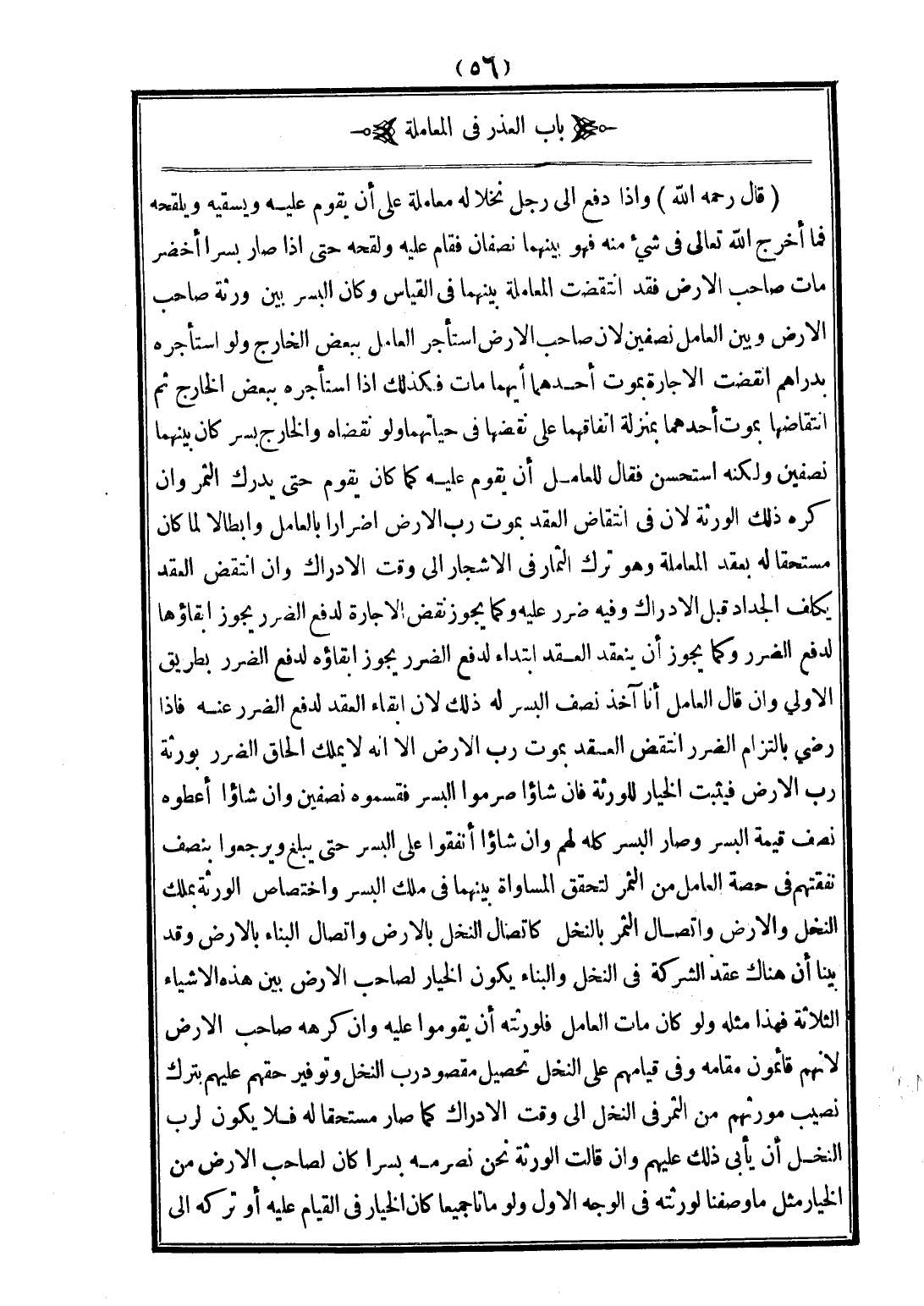 قَالَ - رَحِمَهُ اللَّهُ -: وَإِذَا دَفَعَ إلَى رَجُلٍ نَخْلًا لَهُ مُعَامَلَةً عَلَى أَنْ يَقُومَ عَلَيْهِ، وَيَسْقِيَهُ، وَيُلَقِّحَهُ فَمَا أَخْرَجَ اللَّهُ - تَعَالَى - فِي شَيْءٍ مِنْهُ فَهُوَ بَيْنَهُمَا نِصْفَانِ، فَقَامَ عَلَيْهِ، وَلَقَّحَهُ حَتَّى إذَا صَارَ بُسْرًا أَخْضَرَ مَاتَ صَاحِبُ الْأَرْضِ فَقَدْ اُنْتُقِضَتْ الْمُعَامَلَةُ بَيْنَهُمَا فِي الْقِيَاسِ، وَكَانَ الْبُسْرُ بَيْنَ وَرَثَةِ صَاحِبِ الْأَرْضِ، وَبَيْنَ الْعَامِلِ نِصْفَيْنِ؛ لِأَنَّ صَاحِبَ الْأَرْضِ اسْتَأْجَرَ الْعَامِلَ بِبَعْضِ الْخَارِجِ، وَلَوْ اسْتَأْجَرَهُ بِدَرَاهِمَ انْتَقَضَتْ الْإِجَارَةُ بِمَوْتِ أَحَدِهِمَا أَيُّهُمَا مَاتَ، فَكَذَلِكَ إذَا اسْتَأْجَرَهُ بِبَعْضِ الْخَارِجِ ثُمَّ انْتِقَاضُهَا بِمَوْتِ أَحَدِهِمَا بِمَنْزِلَةِ اتِّفَاقِهِمَا عَلَى نَقْضِهَا فِي حَيَاتِهِمَا، وَلَوْ نَقَضَاهُ، وَالْخَارِجُ بُسْرٌ كَانَ بَيْنَهُمَا نِصْفَيْنِ، وَلَكِنَّهُ اسْتَحْسَنَ فَقَالَ: لِلْعَامِلِ أَنْ يَقُومَ عَلَيْهِ، كَمَا كَانَ يَقُومُ حَتَّى يُدْرِكَ الثَّمَرَ، وَإِنْ كَرِهَ ذَلِكَ الْوَرَثَةُ؛ لِأَنَّ فِي انْتِقَاضِ الْعَقْدِ بِمَوْتِ رَبِّ الْأَرْضِ إضْرَارًا بِالْعَامِلِ، وَإِبْطَالًا لِمَا كَانَ مُسْتَحَقًّا لَهُ بِعَقْدِ الْمُعَامَلَةِ، وَهُوَ تَرْكُ الثِّمَارِ فِي الْأَشْجَارِ إلَى وَقْتِ الْإِدْرَاكِ، وَإِنْ اُنْتُقِضَ الْعَقْدُ يُكَلَّفُ الْجِدَادَ قَبْلَ الْإِدْرَاكِ، وَفِيهِ ضَرَرٌ عَلَيْهِ، وَكَمَا يَجُوزُ نَقْضُ الْإِجَارَةِ لِدَفْعِ الضَّرَرِ يَجُوزُ إبْقَاؤُهَا لِدَفْعِ الضَّرَرِ، وَكَمَا يَجُوزُ أَنْ يَنْعَقِدَ الْعَقْدُ ابْتِدَاءً لِدَفْعِ الضَّرَرِ يَجُوزُ إبْقَاؤُهُ لِدَفْعِ الضَّرَرِ بِطَرِيقِ الْأَوْلَى، وَإِنْ قَالَ الْعَامِلُ: أَنَا آخُذُ نِصْفَ الْبُسْرِ لَهُ ذَلِكَ؛ لِأَنَّ إبْقَاءَ الْعَقْدِ لِدَفْعِ الضَّرَرِ عَنْهُ، فَإِذَا رَضِيَ بِالْتِزَامِ الضَّرَرِ اُنْتُقِضَ الْعَقْدُ بِمَوْتِ رَبِّ الْأَرْضِ إلَّا أَنَّهُ لَا يَمْلِكُ إلْحَاقَ الضَّرَرِ بِوَرَثَةِ رَبِّ الْأَرْضِ، فَيَثْبُتُ الْخِيَارُ لِلْوَرَثَةِ فَإِنْ شَاءُوا صَرَمُوا الْبُسْرَ، فَقَسَمُوهُ نِصْفَيْنِ، وَإِنْ شَاءُوا أَعْطَوْهُ نِصْفَ قِيمَةِ الْبُسْرِ، وَصَارَ الْبُسْرُ كُلُّهُ لَهُمْ وَإِنْ شَاءُوا أَنْفَقُوا عَلَى الْبُسْرِ حَتَّى يَبْلُغَ، وَيَرْجِعُوا بِنِصْفِ نَفَقَتِهِمْ فِي حِصَّةِ الْعَامِلِ مِنْ الثَّمَرِ، لِتَحَقُّقِ الْمُسَاوَاةِ بَيْنَهُمَا فِي مِلْكِ الْبُسْرِ، وَاخْتِصَاصِ الْوَرَثَةِ بِمِلْكِ النَّخْلِ وَالْأَرْضِ. وَاتِّصَالُ الثَّمَرِ بِالنَّخْلِ كَاتِّصَالِ النَّخْلِ بِالْأَرْضِ، وَاتِّصَالِ الْبِنَاءِ بِالْأَرْضِ، وَقَدْ بَيَّنَّا أَنَّ هُنَاكَ عَقْدَ الشَّرِكَةِ فِي النَّخْلِ وَالْبِنَاءِ يَكُونُ الْخِيَارُ لِصَاحِبِ الْأَرْضِ بَيْنَ هَذِهِ الْأَشْيَاءِ الثَّلَاثَةِ، فَهَذَا مِثْلُهُ، وَلَوْ كَانَ مَاتَ الْعَامِلُ فَلِوَرَثَتِهِ أَنْ يَقُومُوا عَلَيْهِ، وَإِنْ كَرِهَهُ صَاحِبُ الْأَرْضِ؛ لِأَنَّهُمْ قَائِمُونَ مَقَامَهُ، وَفِي قِيَامِهِمْ عَلَى النَّخْلِ تَحْصِيلُ مَقْصُودِ رَبِّ النَّخْلِ، وَتَوْفِيرُ حَقِّهِمْ عَلَيْهِمْ بِتَرْكِ نَصِيبِ مُورَثِهِمْ مِنْ الثَّمَرِ فِي النَّخْلِ إلَى وَقْتِ الْإِدْرَاكِ، كَمَا صَارَ مُسْتَحَقًّا لَهُ، فَلَا يَكُونُ لِرَبِّ النَّخْلِ أَنْ يَأْبَى ذَلِكَ عَلَيْهِمْ، وَإِنْ قَالَتْ الْوَرَثَةُ: نَحْنُ نَصْرِمُهُ بُسْرًا كَانَ لِصَاحِبِ الْأَرْضِ مِنْ الْخِيَارِ مِثْلُ مَا وَصَفْنَا لِوَرَثَتِهِ فِي الْوَجْهِ الْأَوَّلِ، وَلَوْ مَاتَا جَمِيعًا كَانَ الْخِيَارُ فِي الْقِيَامِ عَلَيْهِ أَوْ تَرْكِهِ إ