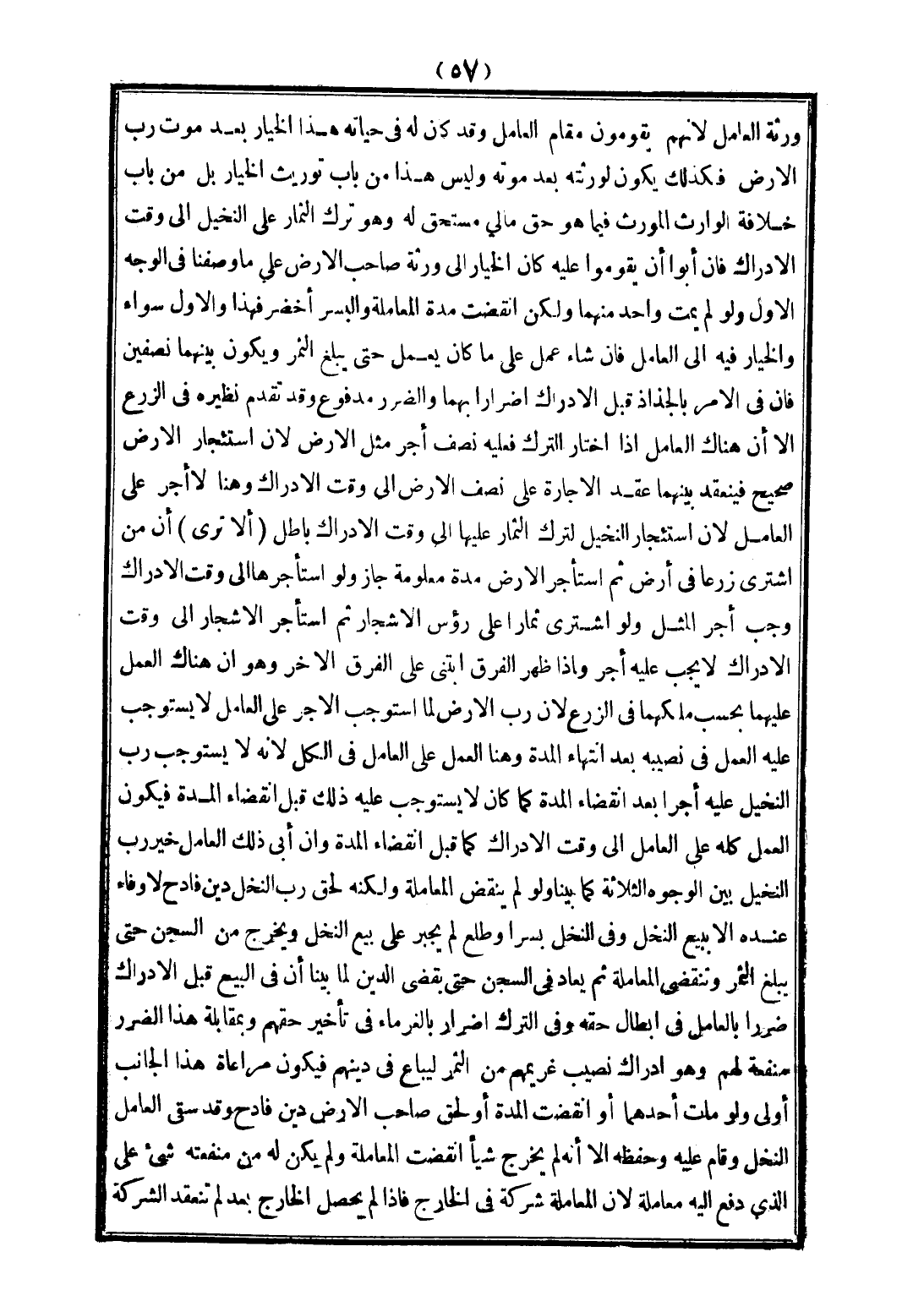 وَرَثَةِ الْعَامِلِ؛ لِأَنَّهُمْ يَقُومُونَ مَقَامَ الْعَامِلِ، وَقَدْ كَانَ لَهُ فِي حَيَاتِهِ هَذَا الْخِيَارُ بَعْدَ مَوْتِ رَبِّ الْأَرْضِ، فَكَذَلِكَ يَكُونُ لِوَرَثَتِهِ بَعْدَ مَوْتِهِ، وَلَيْسَ هَذَا مِنْ بَابِ تَوْرِيثِ الْخِيَارِ بَلْ مِنْ بَابِ خِلَافَةِ الْوَارِثِ الْمُورَثَ فِيمَا هُوَ حَقٌّ مَالِيٌّ مُسْتَحَقٌّ لَهُ، وَهُوَ تَرْكُ الثِّمَارِ عَلَى النَّخِيلِ إلَى وَقْتِ الْإِدْرَاكِ، فَإِنْ أَبَوْا أَنْ يَقُومُوا عَلَيْهِ كَانَ الْخِيَارُ إلَى وَرَثَةِ صَاحِبِ الْأَرْضِ عَلَى مَا وَصَفْنَا فِي الْوَجْهِ الْأَوَّلِ، وَلَوْ لَمْ يَمُتْ وَاحِدٌ مِنْهُمَا، وَلَكِنْ انْقَضَتْ مُدَّةُ الْمُعَامَلَةِ وَالْبُسْرُ أَخْضَرُ، فَهَذَا وَالْأَوَّلُ سَوَاءٌ، وَالْخِيَارُ فِيهِ إلَى الْعَامِلِ، فَإِنْ شَاءَ عَمِلَ عَلَى مَا كَانَ يَعْمَلُ حَتَّى يَبْلُغَ الثَّمَرُ، وَيَكُونَ بَيْنَهُمَا نِصْفَيْنِ فَإِنَّ فِي الْأَمْرِ بِالْجِذَاذِ قَبْلَ الْإِدْرَاكِ إضْرَارًا بِهِمَا، وَالضَّرَرُ مَدْفُوعٌ، وَقَدْ تَقَدَّمَ نَظِيرُهُ فِي الزَّرْعِ إلَّا أَنَّ هُنَاكَ الْعَامِلُ إذَا اخْتَارَ التَّرْكَ فَعَلَيْهِ نِصْفُ أَجْرِ مِثْلِ الْأَرْضِ؛ لِأَنَّ اسْتِئْجَارَ الْأَرْضِ صَحِيحٌ، فَيَنْعَقِدُ بَيْنَهُمَا عَقْدُ الْإِجَارَةِ عَلَى نِصْفِ الْأَرْضِ إلَى وَقْتِ الْإِدْرَاكِ، وَهُنَا لَا أَجْرَ عَلَى الْعَامِلِ؛ لِأَنَّ اسْتِئْجَارَ النَّخِيلِ لِتَرْكِ الثِّمَارِ عَلَيْهَا إلَى وَقْتِ الْإِدْرَاكِ بَاطِلٌ.
