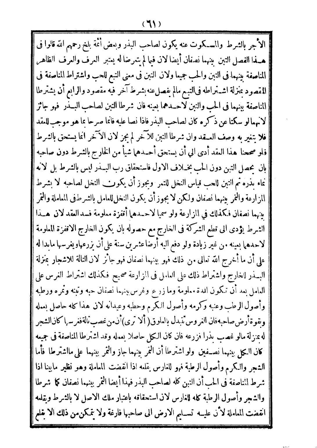 الْأَجْرَ بِالشَّرْطِ، وَالْمَسْكُوتُ عَنْهُ يَكُونُ لِصَاحِبِ الْبَذْرِ، وَبَعْضُ أَئِمَّةِ بَلْخَ - رَحِمَهُمُ اللَّهُ - قَالُوا: فِي هَذَا الْفَصْلِ التِّبْنُ بَيْنَهُمَا نِصْفَانِ أَيْضًا؛ لِأَنَّ فِيمَا لَمْ يَتَعَرَّضَا لَهُ يُعْتَبَرُ الْعُرْفُ، وَالْعُرْفُ الظَّاهِرُ الْمُنَاصَفَةُ بَيْنَهُمَا فِي التِّبْنِ وَالْحَبِّ جَمِيعًا، وَلِأَنَّ التِّبْنَ فِي مَعْنَى التَّبَعِ لِلْحَبِّ وَاشْتِرَاطُ الْمُنَاصَفَةِ فِي الْمَقْصُودِ بِمَنْزِلَةِ اشْتِرَاطِهِ فِي التَّبَعِ مَا لَمْ يُفْصَلْ عَنْهُ بِشَرْطٍ آخَرَ فِيهِ مَقْصُودٌ. وَالرَّابِعُ: أَنْ يَشْتَرِطَا الْمُنَاصَفَةَ بَيْنَهُمَا فِي الْحَبِّ، وَالتِّبْنُ لِأَحَدِهِمَا بِعَيْنِهِ، فَإِنْ شَرَطَا التِّبْنَ لِصَاحِبِ الْبَذْرِ فَهُوَ جَائِزٌ؛ لِأَنَّهُمَا لَوْ سَكَتَا عَنْ ذِكْرِهِ كَانَ لِصَاحِبِ الْبَذْرِ، فَإِذَا نَصَّا عَلَيْهِ فَإِنَّمَا صَرَّحَا بِمَا هُوَ مُوجِبٌ لِلْعَقْدِ، فَلَا يَتَغَيَّرُ بِهِ وَصْفُ الْعَقْدِ، وَإِنْ شَرَطَا التِّبْنَ لِلْآخَرِ لَمْ يَجُزْ؛ لِأَنَّ الْآخَرَ إنَّمَا يَسْتَحِقُّ بِالشَّرْطِ، فَلَوْ صَحَّحْنَا هَذَا الْعَقْدَ أَدَّى إلَى أَنْ يَسْتَحِقَّ أَحَدُهُمَا شَيْئًا مِنْ الْخَارِجِ بِالشَّرْطِ دُونَ صَاحِبِهِ بِأَنْ يَحْصُلَ التِّبْنُ دُونَ الْحَبِّ بِخِلَافِ الْأَوَّلِ، فَاسْتِحْقَاقُ رَبِّ الْبَذْرِ لَيْسَ بِالشَّرْطِ بَلْ؛ لِأَنَّهُ نَمَاءُ بَذْرِهِ ثُمَّ التِّبْنُ لِلْحَبِّ قِيَاسُ النَّخْلِ لِلتَّمْرِ، وَيَجُوزُ أَنْ يَكُونَ النَّخْلُ لِصَاحِبِهِ لَا بِشَرْطِ الْمُزَارَعَةِ، وَالتَّمْرُ بَيْنَهُمَا نِصْفَانِ، وَلَكِنْ لَا يَجُوزُ أَنْ يَكُونَ النَّخْلُ لِلْعَامِلِ بِالشَّرْطِ فِي الْمُعَامَلَةِ، وَالتَّمْرُ بَيْنَهُمَا نِصْفَانِ، فَكَذَلِكَ فِي الْمُزَارَعَةِ وَلَوْ سَمَّيَا لِأَحَدِهِمَا أَقْفِزَةً مَعْلُومَةً فَسَدَ الْعَقْدُ؛ لِأَنَّ هَذَا الشَّرْطَ يُؤَدِّي إلَى قَطْعِ الشَّرِكَةِ فِي الْخَارِجِ مَعَ حُصُولِهِ بِأَنْ يَكُونَ الْخَارِجُ الْأَقْفِزَةَ الْمَعْلُومَةَ لِأَحَدِهِمَا بِعَيْنِهِ مِنْ غَيْرِ زِيَادَةٍ