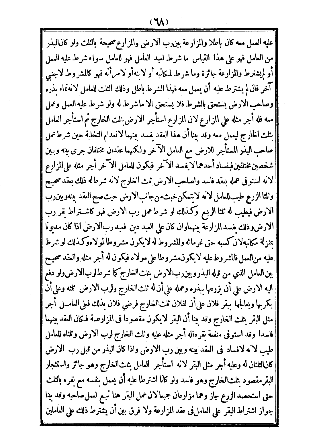 عَلَيْهِ الْعَمَلَ مَعَهُ كَانَ بَاطِلًا، وَالْمُزَارَعَةُ بَيْنَ رَبِّ الْأَرْضِ وَالْمُزَارِعِ صَحِيحَةٌ بِالثُّلُثِ، وَلَوْ كَانَ الْبَذْرُ مِنْ الْعَامِلِ فَهُوَ عَلَى هَذَا الْقِيَاسِ مَا شَرَطَ لِعَبْدِ الْعَامِلِ، فَهُوَ لِلْعَامِلِ سَوَاءٌ شَرَطَ عَلَيْهِ الْعَمَلَ أَوْ لَمْ يَشْتَرِطْ، وَالْمُزَارَعَةُ جَائِزَةٌ، وَمَا شَرَطَ لِمُكَاتَبِهِ أَوْ لِابْنِهِ أَوْ لِامْرَأَتِهِ فَهُوَ كَالْمَشْرُوطِ لِأَجْنَبِيٍّ آخَرَ، فَإِنْ لَمْ يَشْتَرِطْ عَلَيْهِ أَنْ يَعْمَلَ مَعَهُ فَهَذَا الشَّرْطُ بَاطِلٌ، وَذَلِكَ الثُّلُثُ لِلْعَامِلِ؛ لِأَنَّهُ نَمَاءُ بَذْرِهِ، وَصَاحِبُ الْأَرْضِ يَسْتَحِقُّ بِالشَّرْطِ، فَلَا يَسْتَحِقُّ إلَّا مَا شُرِطَ لَهُ، وَلَوْ شَرَطَ عَلَيْهِ الْعَمَلَ، وَعَمِلَ مَعَهُ فَلَهُ أَجْرُ مِثْلِهِ عَلَى الْمُزَارِعِ؛ لِأَنَّ الْمُزَارِعَ اسْتَأْجَرَ الْأَرْضَ بِثُلُثِ الْخَارِجِ ثُمَّ اسْتَأْجَرَ الْعَامِلَ بِثُلُثِ الْخَارِجِ؛ لِيَعْمَلَ مَعَهُ، وَقَدْ بَيَّنَّا أَنَّ هَذَا الْعَقْدَ يَفْسُدُ بَيْنَهُمَا؛ لِانْعِدَامِ التَّخْلِيَةِ حِينَ شَرَطَ عَمَلَ صَاحِبِ الْبَذْرِ الْمُسْتَأْجِرِ لِلْأَرْضِ مَعَ الْعَامِلِ الْآخَرِ، وَلَكِنَّهُمَا عَقْدَانِ مُخْتَلِفَانِ جَرَى بَيْنَهُ وَبَيْنَ شَخْصَيْنِ مُخْتَلِفَيْنِ؛ فَبِفَسَادِ أَحَدِهِمَا لَا يَفْسُدُ الْآخَرُ، فَيَكُونُ لِلْعَامِلِ الْآخَرِ أَجْرُ مِثْلِهِ عَلَى الْمُزَارِعِ؛ لِأَنَّهُ اسْتَوْفَى عَمَلَهُ بِعَقْدٍ فَاسِدٍ، وَلِصَاحِبِ الْأَرْضِ ثُلُثُ الْخَارِجِ؛ لِأَنَّهُ شَرَطَ لَهُ ذَلِكَ بِعَقْدٍ صَحِيحٍ، وَثُلُثَا الزَّرْعِ طَيِّبٌ لِلْعَامِلِ؛ لِأَنَّهُ لَا يَتَمَكَّنُ خُبْثٌ مِنْ جَانِبِ الْأَرْضِ، حَيْثُ صَحَّ الْعَقْدُ بَيْنَهُ وَبَيْنَ رَبِّ الْأَرْضِ فَيَطِيبُ لَهُ ثُلُثُ الرِّيعِ، وَكَذَلِكَ لَوْ شَرَطَ عَمَلَ رَبِّ الْأَرْضِ فَهُوَ كَاشْتِرَاطِ بَقَرِ رَبِّ الْأَرْضِ، وَذَلِكَ يُفْسِدُ الْمُزَارَعَةَ بَيْنَهُمَا، وَإِنْ كَانَ عَلَى الْعَبْدِ دَيْنٌ فَعَبْدُ رَبِّ الْأَرْضِ إذَا كَانَ مَدْيُونًا بِمَنْزِلَةِ مُكَاتَبِهِ؛ لِأَنَّ كَسْبَهُ حَقُّ غُرَمَائِهِ، وَالْمَشْرُوطُ لَهُ لَا يَكُونُ مَشْرُوطًا لِمَوْلَاهُ، وَكَذَلِكَ لَوْ شَرَطَ عَلَيْهِ مِنْ الْعَمَلِ فَالْمَشْرُوطُ عَلَيْهِ لَا يَكُونُ مَشْرُوطًا عَلَى مَوْلَاهُ، فَيَكُونُ لَهُ أَجْرُ مِثْلِهِ، وَالْعَقْدُ صَحِيحٌ بَيْنَ الْعَامِلِ الَّذِي مِنْ قِبَلِهِ الْبَذْرُ وَبَيْنَ رَبِّ الْأَرْضِ بِثُلُثِ الْخَارِجِ كَمَا شُرِطَ لِرَبِّ الْأَرْضِ