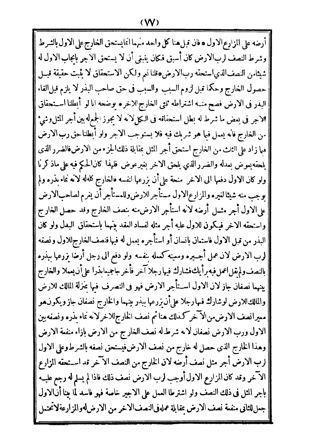 أَرْضِهِ عَلَى الْمُزَارِعِ الْأَوَّلِ، فَإِنْ قِيلَ هُنَا: كُلُّ وَاحِدٍ مِنْهُمَا إنَّمَا يَسْتَحِقُّ الْخَارِجَ عَلَى الْأَوَّلِ بِالشَّرْطِ، وَشَرْطُ النِّصْفِ لِرَبِّ الْأَرْضِ كَانَ أَسْبَقَ، فَكَانَ يَنْبَغِي أَنْ لَا يَسْتَحِقَّ الْأَجْرَ بِإِيجَابِ الْأَوَّلِ لَهُ شَيْئًا مِنْ النِّصْفِ الَّذِي اسْتَحَقَّهُ رَبُّ الْأَرْضِ، قُلْنَا: نَعَمْ، وَلَكِنَّ الِاسْتِحْقَاقَ لَا يَثْبُتُ حَقِيقَةً قَبْلَ حُصُولِ الْخَارِجِ، وَحُكْمًا قَبْلَ لُزُومِ السَّبَبِ، وَالسَّبَبُ فِي حَقِّ صَاحِبِ الْبَذْرِ لَا يَلْزَمُ قَبْلَ إلْقَاءِ الْبَذْرِ فِي الْأَرْضِ فَصَحَّ مِنْهُ اشْتِرَاطُهُ ثُلُثَيْ الْخَارِجِ لِلْآخَرِ يُوَضِّحُهُ أَنَّا لَوْ أَبْطَلْنَا اسْتِحْقَاقَ الْأَجْرِ فِي بَعْضِ مَا شُرِطَ لَهُ بَطَلَ اسْتِحْقَاقُهُ فِي الْكُلِّ؛ لِأَنَّهُ لَا يَجُوزُ الْجَمْعُ لَهُ بَيْنَ أَجْرِ الْمِثْلِ وَشَيْءٍ مِنْ الْخَارِجِ، فَإِنَّهُ يَعْمَلُ فِيمَا هُوَ شَرِيكٌ فِيهِ، فَلَا يَسْتَوْجِبُ الْأَجْرَ، وَلَوْ أَبْطَلْنَا حَقَّ رَبِّ الْأَرْضِ فِيمَا زَادَ عَلَى الثُّلُثِ مِنْ الْخَارِجِ اسْتَحَقَّ أَجْرَ الْمِثْلِ بِمُقَابَلَةِ ذَلِكَ الْجُزْءِ مِنْ الْأَرْضِ، فَالضَّرَرُ الَّذِي يَلْحَقُهُ يُعَوَّضُ بِعَدْلِهِ، وَالضَّرَرُ الَّذِي يَلْحَقُ الْآخَرَ بِغَيْرِ عِوَضٍ؛ فَلِهَذَا كَانَ الْحُكْمُ فِيهِ عَلَى مَا ذَكَرْنَا، وَلَوْ كَانَ الْأَوَّلُ دَفَعَهَا إلَى الْآخَرِ مِنْحَةً عَلَى أَنْ يَزْرَعَهَا لِنَفْسِهِ فَالْخَارِجُ كُلُّهُ لَهُ؛ لِأَنَّهُ نَمَاءُ بَذْرِهِ، وَلَمْ يُوجِبْ مِنْهُ شَيْئًا لِغَيْرِهِ، وَالْمُزَارِعُ الْأَوَّلُ مُسْتَأْجِرٌ لِلْأَرْضِ، وَلِلْمُسْتَأْجِرِ أَنْ يَغْرَمَ لِصَاحِبِ الْأَرْضِ عَلَى الْأَوَّلِ أَجْرَ مِثْلِ أَرْضِهِ؛ لِأَنَّهُ اسْتَأْجَرَ الْأَرْضَ مِنْهُ بِنِصْفِ الْخَارِجِ، وَقَدْ حَصَلَ الْخَارِجُ، وَاسْتَحَقَّهُ الْآخَرُ، فَيَكُونُ لِلْأَوَّلِ عَلَيْهِ أَجْرُ مِثْلِهِ؛ لِفَسَادِ الْعَقْدِ بَيْنَهُمَا بِاسْتِحْقَاقِ الْبَدَلِ، وَلَوْ كَانَ الْبَذْرُ مِنْ قِبَلِ الْأَوَّلِ، فَاسْتَعَانَ بِإِنْسَانٍ أَوْ اسْتَأْجَرَهُ يَعْمَلُ لَهُ فِيهَا فَنِصْفُ الْخَارِجِ لِلْأَوَّلِ وَنِصْفُهُ لِرَبِّ الْأَرْضِ؛ لِأَنَّ عَمَلَ أَجِيرِهِ وَمُعِينِهِ، كَعَمَلِهِ بِنَفْسِهِ