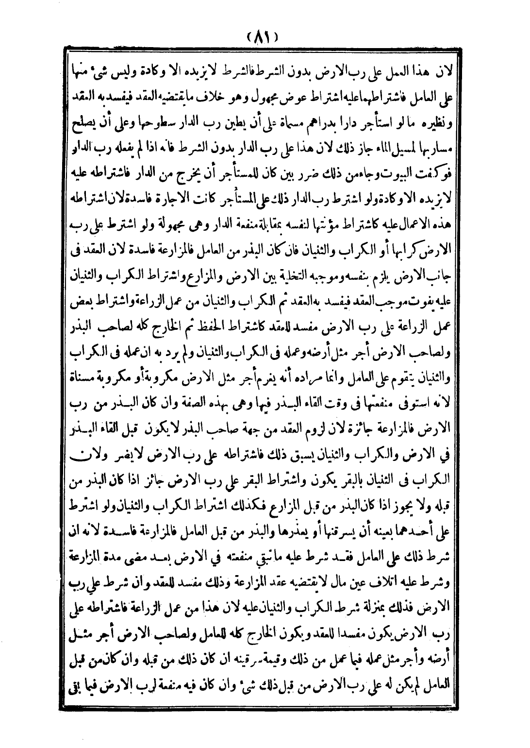 لِأَنَّ هَذَا الْعَمَلَ عَلَى رَبِّ الْأَرْضِ بِدُونِ الشَّرْطِ فَالشَّرْطُ لَا يَزِيدُهُ إلَّا وِكَادَةً، وَلَيْسَ شَيْءٌ مِنْهَا عَلَى الْعَامِلِ، فَاشْتِرَاطُهُمَا عَلَيْهِ اشْتِرَاطُ عِوَضٍ مَجْهُولٍ، وَهُوَ خِلَافُ مَا يَقْتَضِيه الْعَقْدُ، فَيَفْسُدُ بِهِ الْعَقْدُ، وَنَظِيرُهُ مَا لَوْ اسْتَأْجَرَ دَارًا بِدَرَاهِمَ مُسَمَّاةٍ عَلَى أَنْ يُطَيِّنَ رَبُّ الدَّارِ سُطُوحَهَا، وَعَلَى أَنْ يُصْلِحَ مَسَارِبَهَا لِمَسِيلِ الْمَاءِ جَازَ ذَلِكَ؛ لِأَنَّ هَذَا عَلَى رَبِّ الدَّارِ بِدُونِ الشَّرْطِ؛ فَإِنَّهُ إذَا لَمْ يَفْعَلْهُ رَبُّ الدَّارِ فَوُكِفَتْ الْبُيُوتُ، وَجَاءَ مِنْ ذَلِكَ ضَرَرٌ بَيِّنٌ كَانَ لِلْمُسْتَأْجِرِ أَنْ يَخْرُجَ مِنْ الدَّارِ فَاشْتِرَاطُهُ عَلَيْهِ لَا يَزِيدُهُ إلَّا وِكَادَةً، وَلَوْ اشْتَرَطَ رَبُّ الدَّارِ ذَلِكَ عَلَى الْمُسْتَأْجِرِ كَانَتْ الْإِجَارَةُ فَاسِدَةً؛ لِأَنَّ اشْتِرَاطَهُ هَذِهِ الْأَعْمَالَ عَلَيْهِ، كَاشْتِرَاطِ مُؤْنَتِهَا لِنَفْسِهِ بِمُقَابَلَةِ مَنْفَعَةِ الدَّارِ، وَهِيَ مَجْهُولَةٌ، وَلَوْ اشْتَرَطَ عَلَى رَبِّ الْأَرْضِ كِرَابَهَا أَوْ الْكِرَابَ وَالثُّنْيَانَ، فَإِنْ كَانَ الْبَذْرُ مِنْ الْعَامِلِ فَالْمُزَارَعَةُ فَاسِدَةٌ؛ لِأَنَّ الْعَقْدَ فِي جَانِبِ الْأَرْضِ يَلْزَمُ بِنَفْسِهِ، وَمُوجَبُهُ التَّخْلِيَةُ بَيْنَ الْأَرْضِ وَالْمُزَارِعِ، وَاشْتِرَاطُ الْكِرَابِ وَالثُّنْيَانِ عَلَيْهِ يُفَوِّتُ مُوجَبَ الْعَقْدِ، فَيَفْسُدُ بِهِ الْعَقْدُ ثُمَّ الْكِرَابُ وَالثُّنْيَانُ مِنْ عَمَلِ الزِّرَاعَةِ، وَاشْتِرَاطُ بَعْضِ عَمَلِ الزِّرَاعَةِ عَلَى رَبِّ الْأَرْضِ مُفْسِدٌ لِلْعَقْدِ، كَاشْتِرَاطِ الْحِفْظِ، ثُمَّ الْخَارِجُ كُلُّهُ لِصَاحِبِ الْبَذْرِ، وَلِصَاحِبِ الْأَرْضِ أَجْرُ مِثْلِ أَرْضِهِ وَعَمَلِهِ فِي الْكِرَابِ وَالثُّنْيَانِ، وَلَمْ يُرِدْ بِهِ أَنَّ عَمَلَهُ فِي الْكِرَابِ وَالثُّنْيَانِ يُتَقَوَّمُ عَلَى الْعَامِلِ وَإِنَّمَا مُرَادُهُ أَنَّهُ يَغْرَمُ أَجْرَ مِثْلِ الْأَرْضِ مَكْرُوبَةً أَوْ مَكْرُوبَةً مُسَنَّاةً؛ لِأَنَّهُ اسْتَوْفَى مَنْفَعَتَهَا فِي وَقْتِ إلْقَاءِ الْبَذْرِ فِيهَا، وَهِيَ بِهَذِهِ الصِّفَةِ، وَإِنْ كَانَ الْبَذْرُ مِنْ رَبِّ الْأَرْضِ فَالْمُزَارَعَةُ جَائِزَةٌ؛ لِأَنَّ لُزُومَ الْعَقْدِ مِنْ جِهَةِ صَاحِبِ الْبَذْرِ لَا يَكُونُ قَبْلَ إلْقَاءِ الْبَذْرِ فِي الْأَرْضِ، وَالْكِرَابُ وَالثُّنْيَانُ يَسْبِقُ ذَلِكَ، فَاشْتِرَاطُهُ عَلَى رَبِّ الْأَرْضِ لَا يَضُرُّ؛ لِأَنَّ الْكِرَابَ فِي الثُّنْيَانِ بِالْبَقَرِ يَكُونُ، وَاشْتِرَاطُ الْبَقَرِ عَلَى رَبِّ الْأَرْضِ جَائِزٌ إذَا كَانَ الْبَذْرُ مِنْ قِبَلِهِ، وَلَا يَجُوزُ إنْ كَانَ الْبَذْرُ مِنْ قِبَلِ الْمُزَارِعِ، فَكَذَلِكَ اشْتِرَاطُ الْكِرَابِ وَالثُّنْيَانِ، وَلَوْ اشْتَرَطَ عَلَى أَحَدِهِمَا بِعَيْنِهِ أَنْ يُسَرْقِنَهَا أَوْ يَعْذِرَهَا، وَالْبَذْرُ مِنْ قِبَلِ الْعَامِلِ فَالْمُزَارَعَةُ فَاسِدَةٌ؛ لِأَنَّهُ إنْ شَرَطَ ذَلِكَ عَلَى الْعَامِلِ فَقَدْ شَرَطَ عَلَيْهِ مَا تَبْقَى مَنْفَعَتُهُ فِي الْأَرْضِ بَعْدَ مُضِيِّ مُدَّةِ الْمُزَارَعَةِ، وَشَرَطَ عَلَيْهِ إتْلَافَ عَيْنِ مَالٍ لَا يَقْتَضِيه عَقْدُ الْمُزَارَعَةِ، وَذَلِكَ مُفْسِدٌ لِلْعَقْدِ، وَإِنْ شَرَطَ عَلَى رَبِّ الْأَرْضِ فَذَلِكَ بِمَنْزِلَةِ شَرْطِ الْكِرَابِ وَالثُّنْيَانِ عَلَيْهِ؛ لِأَنَّ هَذَا مِنْ عَمَلِ الزِّرَاعَةِ، فَاشْتِرَاطُهُ عَلَى رَبِّ الْأَرْضِ يَكُونُ مُفْسِدًا لِلْعَقْدِ، وَيَكُونُ الْخَارِجُ كُلُّهُ لِلْعَامِلِ، وَلِصَاحِبِ الْأَرْضِ أَجْرُ مِثْلِ أَرْضِهِ، وَأَجْرُ مِثْلِ عَمَلِهِ فِيمَا