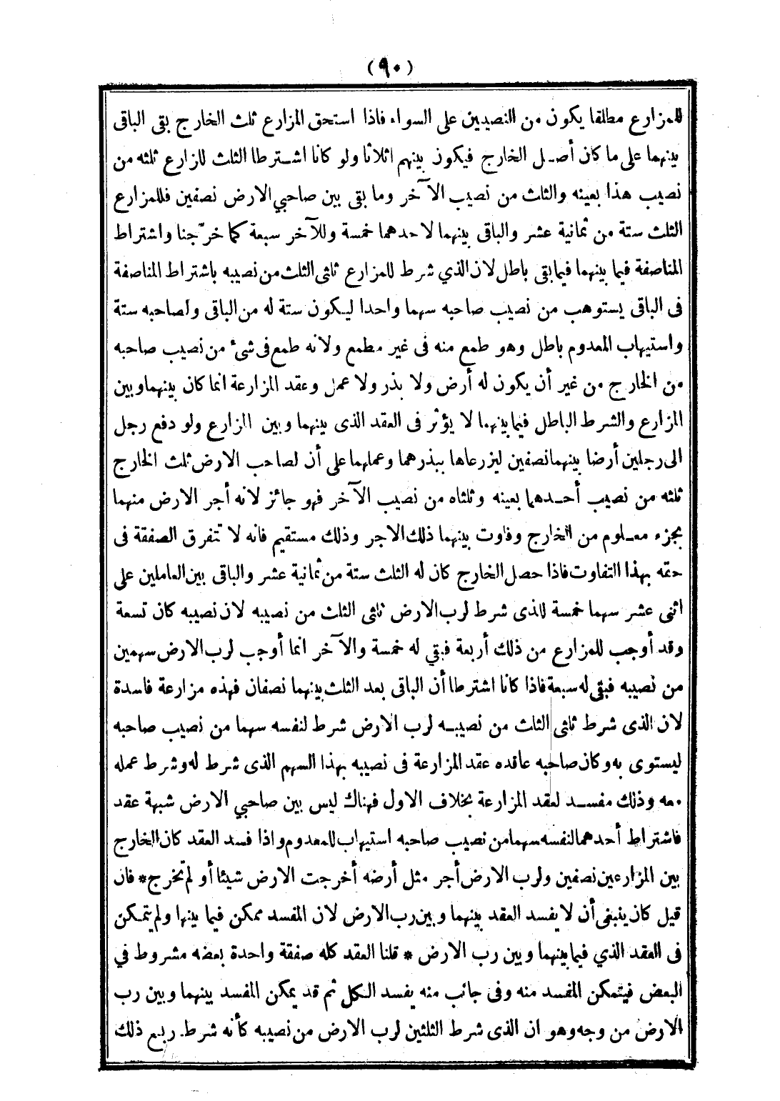 لِلْمُزَارِعِ مُطْلَقًا يَكُونُ مِنْ النَّصِيبَيْنِ عَلَى السَّوَاءِ، فَإِذَا اسْتَحَقَّ الْمُزَارِعُ ثُلُثَ الْخَارِجِ بَقِيَ الْبَاقِي بَيْنَهُمَا عَلَى مَا كَانَ أَصْلَ الْخَارِجِ فَيَكُونُ بَيْنَهُمْ أَثْلَاثًا وَلَوْ كَانَا اشْتَرَطَا الثُّلُثَ لِلزَّارِعِ ثُلُثُهُ مِنْ نَصِيبِ هَذَا بِعَيْنِهِ، وَالثُّلُثُ مِنْ نَصِيبِ الْآخَرِ، وَمَا بَقِيَ مِنْ صَاحِبَيْ الْأَرْضِ نِصْفَيْنِ، فَلِلْمُزَارِعِ الثُّلُثُ سِتَّةٌ مِنْ ثَمَانِيَةَ عَشَرَ، وَالْبَاقِي بَيْنَهُمَا لِأَحَدِهِمَا خَمْسَةٌ، وَلِلْآخَرِ سَبْعَةٌ، كَمَا خَرَّجْنَا، وَاشْتِرَاطُ الْمُنَاصَفَةِ فِيمَا بَيْنَهُمَا فِيمَا بَقِيَ بَاطِلٌ؛ لِأَنَّ الَّذِي شَرَطَ لِلْمُزَارِعِ ثُلُثَيْ الثُّلُثِ مِنْ نَصِيبِهِ بِاشْتِرَاطِ الْمُنَاصَفَةِ فِي الْبَاقِي يَسْتَوْهِبُ مِنْ نَصِيبِ صَاحِبِهِ سَهْمًا وَاحِدًا؛ لِيَكُونَ سِتَّةً لَهُ مِنْ الْبَاقِي، وَلِصَاحِبِهِ سِتَّةٌ، وَاسْتِيهَابُ الْمَعْدُومِ بَاطِلٌ، وَهُوَ طَمَعٌ مِنْهُ فِي غَيْرِ مَطْمَعٍ؛ وَلِأَنَّهُ طَمِعَ فِي شَيْءٍ مِنْ نَصِيبِ صَاحِبِهِ مِنْ الْخَارِجِ مِنْ غَيْرِ أَنْ يَكُونَ لَهُ أَرْضٌ وَلَا بَذْرٌ وَلَا عَمَلٌ، وَعَقْدُ الْمُزَارَعَةِ إنَّمَا كَانَ بَيْنَهُمَا وَبَيْنَ الْمُزَارِعِ، وَالشَّرْطُ الْبَاطِلُ فِيمَا بَيْنَهُمَا لَا يُؤَثِّرُ فِي الْعَقْدِ الَّذِي بَيْنَهُمَا، وَبَيْنَ الْمُزَارِعِ،