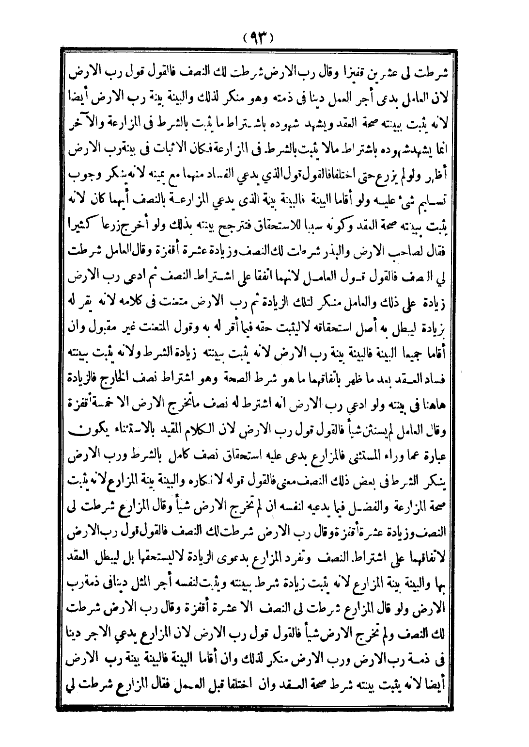 شَرَطْتَ لِي عِشْرِينَ؛ قَفِيزًا، وَقَالَ رَبُّ الْأَرْضِ: شَرَطْتُ لَكَ النِّصْفَ، فَالْقَوْلُ قَوْلُ رَبِّ الْأَرْضِ؛ لِأَنَّ الْعَامِلَ يَدَّعِي أَجْرَ الْعَمَلِ دَيْنًا فِي ذِمَّتِهِ، وَهُوَ مُنْكِرٌ لِذَلِكَ، وَالْبَيِّنَةُ بَيِّنَةُ رَبِّ الْأَرْضِ أَيْضًا؛ لِأَنَّهُ يُثْبِتُ بِبَيِّنَتِهِ صِحَّةَ الْعَقْدِ، وَيَشْهَدُ شُهُودُهُ بِاشْتِرَاطِ مَا يُثْبِتُ بِالشَّرْطِ فِي الْمُزَارَعَةِ، وَالْآخَرُ إنَّمَا يَشْهَدُ شُهُودُهُ بِاشْتِرَاطِ مَا لَا يَثْبُتُ بِالشَّرْطِ فِي الْمُزَارَعَةِ، فَكَانَ الْإِثْبَاتُ فِي بَيِّنَةِ رَبِّ الْأَرْضِ أَظْهَرَ، وَلَوْ لَمْ يَزْرَعْ حَتَّى اخْتَلَفَا، فَالْقَوْلُ قَوْلُ الَّذِي يَدَّعِي الْفَسَادَ مِنْهُمَا مَعَ يَمِينِهِ؛ لِأَنَّهُ يُنْكِرُ وُجُوبَ تَسْلِيمِ شَيْءٍ عَلَيْهِ، وَلَوْ أَقَامَا الْبَيِّنَةَ فَالْبَيِّنَةُ بَيِّنَةُ الَّذِي يَدَّعِي الْمُزَارَعَةَ بِالنِّصْفِ أَيُّهُمَا كَانَ؛ لِأَنَّهُ يُثْبِتُ بِبَيِّنَتِهِ صِحَّةَ الْعَقْدِ، وَكَوْنَهُ سَبَبًا لِلِاسْتِحْقَاقِ، فَتَتَرَجَّحُ بَيِّنَتُهُ بِذَلِكَ، وَلَوْ أَخْرَجَ زَرْعًا كَثِيرًا، فَقَالَ لِصَاحِبِ الْأَرْضِ وَالْبَذْرِ: شَرَطْتُ لَكَ النِّصْفَ وَزِيَادَةَ عَشَرَةِ أَقْفِزَةٍ، وَقَالَ الْعَامِلُ: شَرَطْتَ لِي النِّصْفَ فَالْقَوْلُ قَوْلُ الْعَامِلِ؛ لِأَنَّهُمَا اتَّفَقَا عَلَى اشْتِرَاطِ النِّصْفِ ثُمَّ ادَّعَى رَبُّ الْأَرْضِ زِيَادَةً عَلَى ذَلِكَ، وَالْعَامِلُ مُنْكِرٌ لِتِلْكَ الزِّيَادَةِ، ثُمَّ رَبُّ الْأَرْضِ مُتَعَنِّتٌ فِي كَلَامِهِ؛ لِأَنَّهُ يُقِرُّ لَهُ بِزِيَادَةٍ لِيُبْطِلَ بِهِ أَصْلَ اسْتِحْقَاقِهِ، لَا لِيُثْبِتَ حَقَّهُ فِيمَا أَقَرَّ لَهُ بِهِ، وَقَوْلُ الْمُتَعَنِّتِ غَيْرُ مَقْبُولٍ، وَإِنْ أَقَامَا جَمِيعًا الْبَيِّنَةَ فَالْبَيِّنَةُ بَيِّنَةُ رَبِّ الْأَرْضِ؛ لِأَنَّهُ يُثْبِتُ بِبَيِّنَتِهِ زِيَادَةَ الشَّرْطِ؛ وَلِأَنَّهُ يُثْبِتُ بِبَيِّنَتِهِ فَسَادَ الْعَقْدِ بَعْدَ مَا ظَهَرَ بِاتِّفَاقِهِمَا مَا هُوَ شَرْطُ الصِّحَّةِ، وَهُوَ اشْتِرَاطُ نِصْفِ الْخَارِجِ فَالزِّيَادَةُ هَاهُنَا فِي بَيِّنَتِهِ، وَلَوْ ادَّعَى رَبُّ الْأَرْضِ أَنَّهُ اشْتَرَطَ لَهُ نِصْفَ مَا تُخْرِجُ الْأَرْضُ إلَّا خَمْسَةَ أَقْفِزَةٍ، وَقَالَ الْعَامِلُ: لَمْ يَسْتَثْنِ شَيْئًا فَالْقَوْلُ قَوْلُ رَبِّ الْأَرْضِ؛ لِأَنَّ الْكَلَامَ الْمُقَيَّدَ بِالِاسْتِثْنَاءِ يَكُونُ عِبَارَةً عَمَّا وَرَاءَ الْمُسْتَثْنَى، فَالْمُزَارِعُ يَدَّعِي عَلَيْهِ اسْتِحْقَاقَ نِصْفٍ كَامِلٍ بِالشَّرْطِ، وَرَبُّ الْأَرْضِ يُنْكِرُ الشَّرْطَ فِي بَعْضِ ذَلِكَ النِّصْفِ مَعْنًى، فَالْقَوْلُ قَوْلُهُ؛ لِإِنْكَارِهِ، وَالْبَيِّنَةُ بَيِّنَةُ الْمُزَارِعِ؛ لِأَنَّهُ يُثْبِتُ صِحَّةَ الْمُزَارَعَةِ، وَالْفَضْلَ فِيمَا يَدَّعِيهِ لِنَفْسِهِ إنْ لَمْ تُخْرِجْ الْأَرْضُ شَيْئًا، وَقَالَ الْمُزَارِعُ: شَرَطْتَ لِي النِّصْفَ وَزِيَادَةَ عَشَرَةِ أَقْفِزَةٍ، وَقَالَ رَبُّ الْأَرْضِ: شَرَطْتُ لَكَ النِّصْفَ فَالْقَوْلُ قَوْلُ رَبِّ الْأَرْضِ؛ لِاتِّفَاقِهِمَا عَلَى اشْتِرَاطِ النِّصْفِ، وَتَفَرَّدَ الْمُزَارِعُ بِدَعْوَى الزِّيَادَةِ لَا لِيَسْتَحِقَّهَا، بَلْ لِيُبْطِلَ الْعَقْدَ بِهَا، وَالْبَيِّنَةُ بَيِّنَةُ الْمُزَارِعِ؛ لِأَنَّهُ يُثْبِتُ زِيَادَةَ شَرْطٍ بِبَيِّنَتِهِ، وَيُثْبِتُ لِنَفْسِهِ أَجْرَ الْمِثْلِ دَيْنًا فِي ذِمَّةِ رَبِّ الْأَرْضِ، وَلَوْ قَالَ الْمُزَارِعُ: شَرَطْتَ لِي النِّصْفَ إلَّا عَشَرَةَ أَقْفِزَةٍ، وَقَالَ رَبُّ الْأَرْضِ: شَرَطْتُ لَكَ النِّصْفَ، وَلَمْ تُخْرِجْ الْأَرْضُ شَيْئًا فَالْقَوْلُ قَوْلُ رَبِّ الْأَرْضِ؛ لِأَ