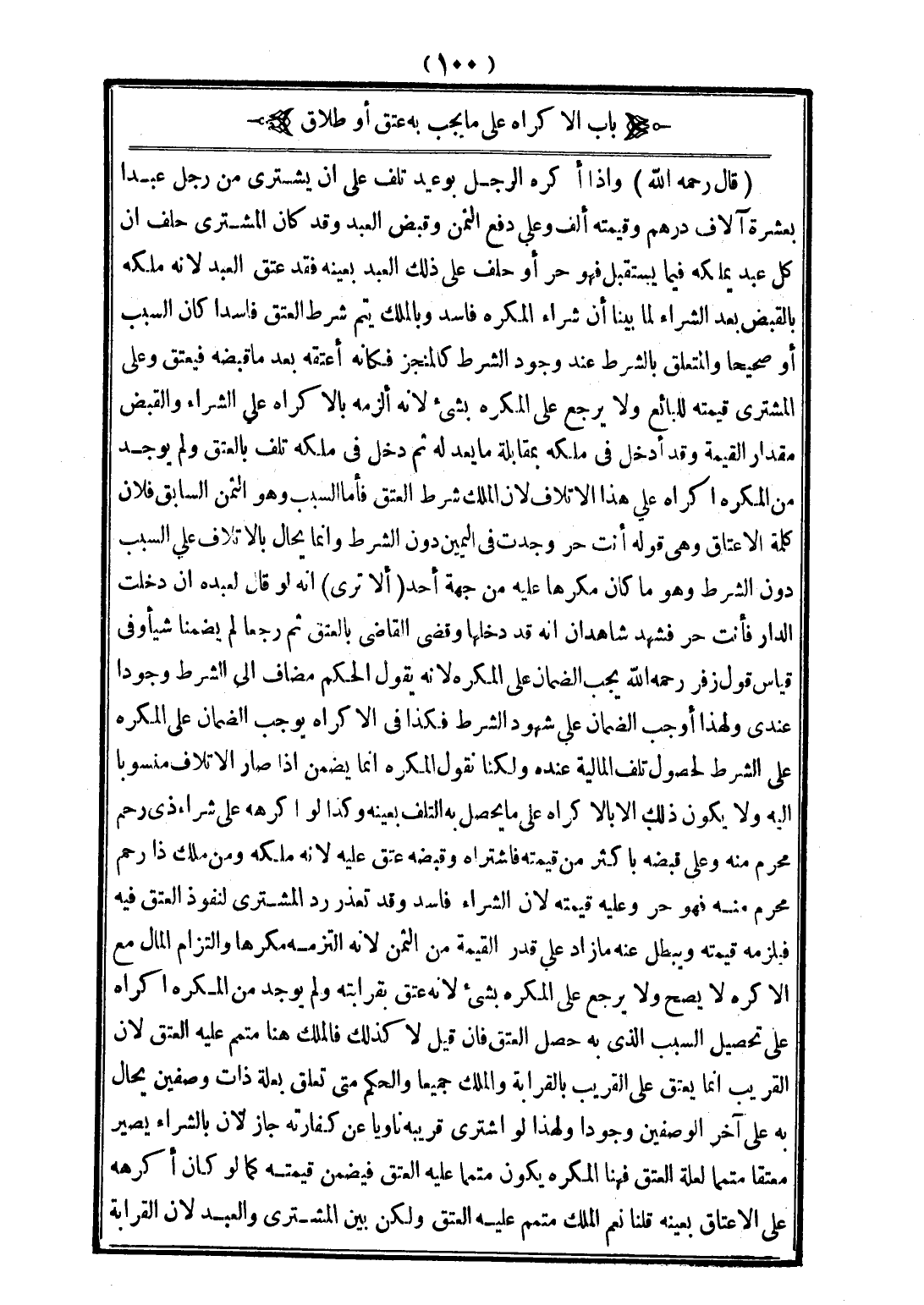 قَالَ - رَحِمَهُ اللَّهُ -) وَإِذَا أُكْرِهَ الرَّجُلُ بِوَعِيدِ تَلَفٍ عَلَى أَنْ يَشْتَرِيَ مِنْ رَجُلٍ عَبْدًا بِعَشَرَةِ آلَافِ دِرْهَمٍ، وَقِيمَتُهُ أَلْفٌ، وَعَلَى دَفْعِ الثَّمَنِ، وَقَبْضِ الْعَبْدِ، وَقَدْ كَانَ الْمُشْتَرِي حَلَفَ أَنَّ كُلَّ عَبْدٍ يَمْلِكُهُ فِيمَا يَسْتَقْبِلُ، فَهُوَ حُرٌّ، أَوْ حَلَفَ عَلَى ذَلِكَ الْعَبْدِ بِعَيْنِهِ، فَقَدْ عَتَقَ الْعَبْدُ؛ لِأَنَّهُ مَلَكَهُ بِالْقَبْضِ بَعْدَ الشِّرَاءِ لِمَا بَيَّنَّا أَنَّ شِرَاءَ الْمُكْرَهِ فَاسِدٌ، وَبِالْمِلْكِ يَتِمُّ شَرْطُ الْعِتْقِ فَاسِدًا كَانَ السَّبَبُ، أَوْ صَحِيحًا، وَالْمُتَعَلِّقُ بِالشَّرْطِ عِنْدَ وُجُودِ الشَّرْطِ كَالْمُنْجِزِ، فَكَأَنَّهُ أَعْتَقَهُ بَعْدَ مَا قَبَضَهُ، فَيَعْتِقُ، وَعَلَى الْمُشْتَرِي قِيمَتُهُ لِلْبَائِعِ، وَلَا يَرْجِعُ عَلَى الْمُكْرِهِ بِشَيْءٍ؛ لِأَنَّهُ أَلْزَمَهُ بِالْإِكْرَاهِ عَلَى الشِّرَاءِ، وَالْقَبْضِ مِقْدَارَ الْقِيمَةِ، وَقَدْ أُدْخِلَ فِي مِلْكِهِ بِمُقَابَلَةِ مَا يُعَدُّ لَهُ، ثُمَّ دَخَلَ فِي مِلْكِهِ تَلَفٌ بِالْعِتْقِ، وَلَمْ يُوجَدْ مِنْ الْمُكْرِهِ إكْرَاهٌ عَلَى هَذَا الْإِتْلَافِ؛ لِأَنَّ الْمِلْكَ شَرْطُ الْعِتْقِ فَأَمَّا السَّبَبُ، وَهُوَ الثَّمَنُ السَّابِقُ، فَلِأَنَّ كَلِمَةَ الْإِعْتَاقِ، وَهِيَ قَوْلُهُ أَنْتَ حُرٌّ وُجِدَتْ فِي الْيَمِينِ دُونَ الشَّرْطِ، وَإِنَّمَا يُحَالُ بِالْإِتْلَافِ عَلَى السَّبَبِ دُونَ الشَّرْطِ، وَهُوَ مَا كَانَ مُكْرَهًا عَلَيْهِ مِنْ جِهَةِ أَحَدٍ.
