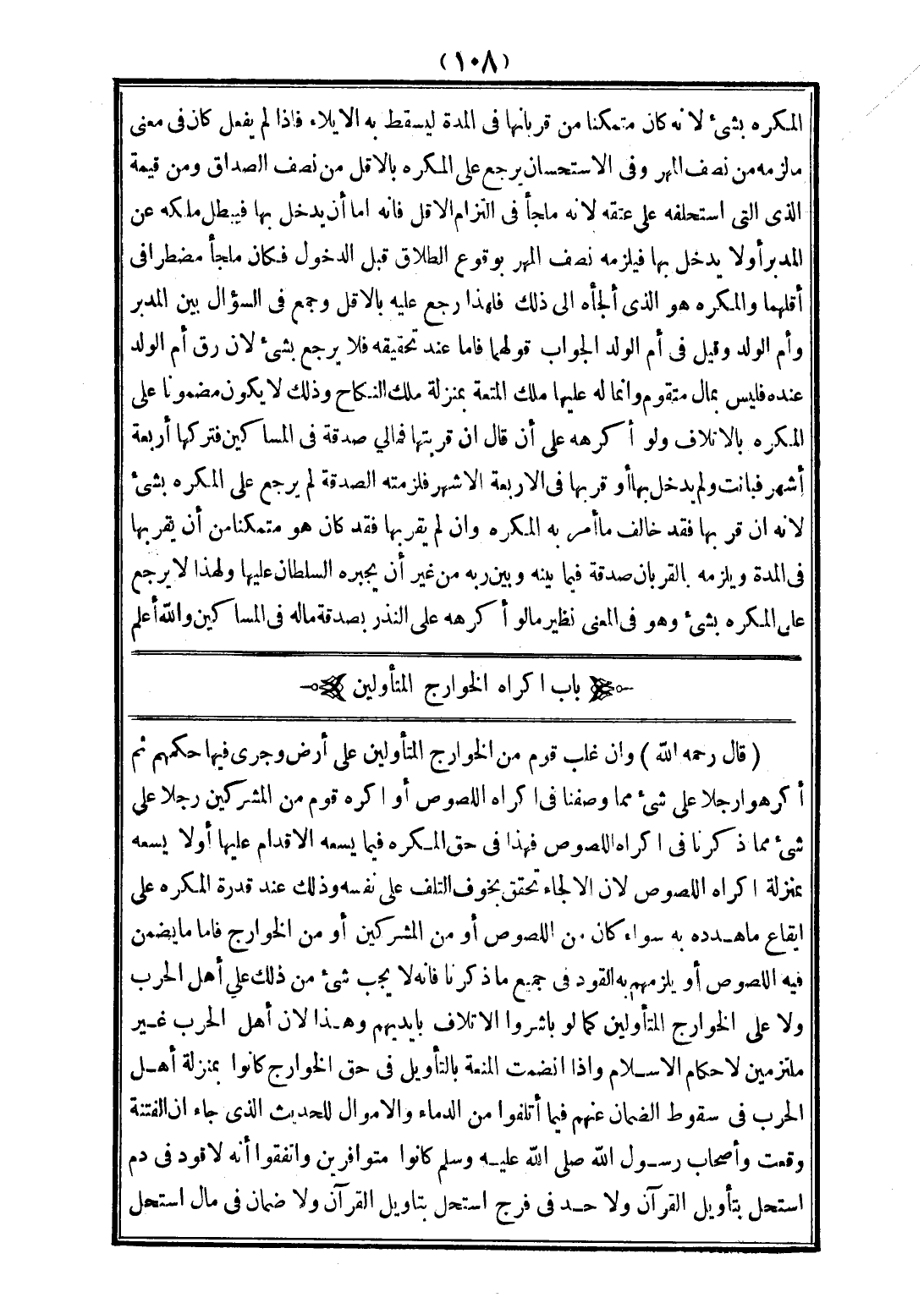 (قَالَ - رَحِمَهُ اللَّهُ -) وَإِنْ غَلَبَ قَوْمٌ مِنْ الْخَوَارِجِ الْمُتَأَوِّلِينَ عَلَى أَرْضٍ، وَجَرَى فِيهَا حُكْمُهُمْ، ثُمَّ أَكْرَهُوا رَجُلًا عَلَى شَيْءٍ مِمَّا، وَصَفْنَا فِي إكْرَاهِ اللُّصُوصِ، أَوْ إكْرَاهِ قَوْمٍ مِنْ الْمُشْرِكِينَ رَجُلًا عَلَى شَيْءٍ مِمَّا ذَكَرْنَا فِي إكْرَاهِ اللُّصُوصِ، فَهَذَا فِي حَقِّ الْمُكْرَهِ فِيمَا يَسَعُهُ الْإِقْدَامُ عَلَيْهَا، أَوْ لَا يَسَعُهُ بِمَنْزِلَةِ إكْرَاهِ اللُّصُوصِ؛ لِأَنَّ الْإِلْجَاءَ تَحَقَّقَ بِخَوْفِ التَّلَفِ عَلَى نَفْسِهِ، وَذَلِكَ عِنْدَ قُدْرَةِ الْمُكْرِهِ عَلَى إيقَاعِ مَا هَدَّدَهُ بِهِ سَوَاءٌ كَانَ مِنْ اللُّصُوصِ، أَوْ مِنْ الْمُشْرِكِينَ، أَوْ مِنْ الْخَوَارِجِ، فَأَمَّا مَا يَضْمَنُ فِيهِ اللُّصُوصُ أَوَيَلْزَمُهُمْ بِهِ الْقَوَدُ فِي جَمِيعِ مَا ذَكَرْنَا، فَإِنَّهُ لَا يَجِبُ شَيْءٌ مِنْ ذَلِكَ عَلَى أَهْلِ الْحَرْبِ، وَلَا عَلَى الْخَوَارِجِ الْمُتَأَوِّلِينَ كَمَا لَوْ بَاشَرُوا الْإِتْلَافَ بِأَيْدِيهِمْ، وَهَذَا؛ لِأَنَّ أَهْلَ الْحَرْبِ غَيْرُ مُلْتَزِمِينَ لِأَحْكَامِ الْإِسْلَامِ، وَإِذَا انْضَمَّتْ الْمَنَعَةُ بِالتَّأْوِيلِ فِي حَقِّ الْخَوَارِجِ كَانُوا بِمَنْزِلَةِ أَهْلِ الْحَرْبِ فِي سُقُوطِ الضَّمَانِ عَنْهُمْ فِيمَا أَتْلَفُوا مِنْ الدِّمَاءِ، وَالْأَمْوَالِ لِلْحَدِيثِ الَّذِي جَاءَ أَنَّ الْفِتْنَةَ وَقَعَتْ، وَأَصْحَابُ رَسُولِ اللَّهِ - صَلَّى اللَّهُ عَلَيْهِ وَسَلَّمَ - كَانُوا مُتَوَافِرِينَ، وَاتَّفَقُوا أَنَّهُ لَا قَوَدَ فِي دَمٍ اُسْتُحِلَّ بِتَأْوِيلِ الْقُرْآنِ، وَلَا حَدَّ فِي، فَرْجٍ اُسْتُحِلَّ بِتَأْوِيلِ الْقُرْآنِ، وَلَا ضَمَانَ فِي مَالٍ اُسْتُحِلَّ