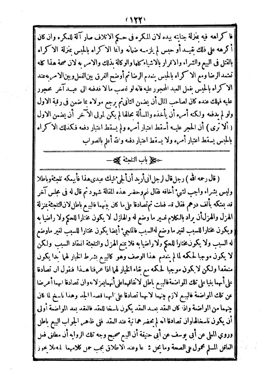 (قَالَ - رَحِمَهُ اللَّهُ -) رَجُلٌ قَالَ لِرَجُلٍ إنِّي أُرِيدُ أَنْ أُلْجِئَ إلَيْكَ عَبْدِي هَذَا فَأَبِيعُكَهُ تَلْجِئَةً، وَبَاطِلًا، وَلَيْسَ بِشِرَاءٍ، وَاجِبٍ لِشَيْءِ أَخَافُهُ، فَقَالَ: نَعَمْ وَحَضَرَ هَذِهِ الْمَقَالَةَ شُهُودٌ، ثُمَّ قَالَ لَهُ فِي مَجْلِسٍ آخَرَ قَدْ بِعْتُكَهُ بِأَلْفِ دِرْهَمٍ، فَقَالَ قَدْ فَعَلْت، ثُمَّ تَصَادَقَا عَلَى مَا كَانَ بَيْنَهُمَا، فَالْبَيْعُ بَاطِلٌ؛ لِأَنَّ التَّلْجِئَةَ بِمَنْزِلَةِ الْهَزْلِ، وَالْهَزْلُ أَنْ يُرَادَ بِالْكَلَامِ غَيْرُ مَا وُضِعَ لَهُ وَالْهَازِلُ لَا يَكُونُ مُخْتَارًا لِلْحُكْمِ، وَلَا رَاضِيًا بِهِ، وَيَكُونُ مُخْتَارًا لِلسَّبَبِ لِغَيْرِ مَا وُضِعَ لَهُ السَّبَبُ، فَالْمُلْجِئُ أَيْضًا يَكُونُ مُخْتَارًا لِلسَّبَبِ لِغَيْرِ مَا وُضِعَ لَهُ السَّبَبُ، وَلَا يَكُونُ مُخْتَارًا لِلْحُكْمِ، وَلَا رَاضِيًا بِهِ.