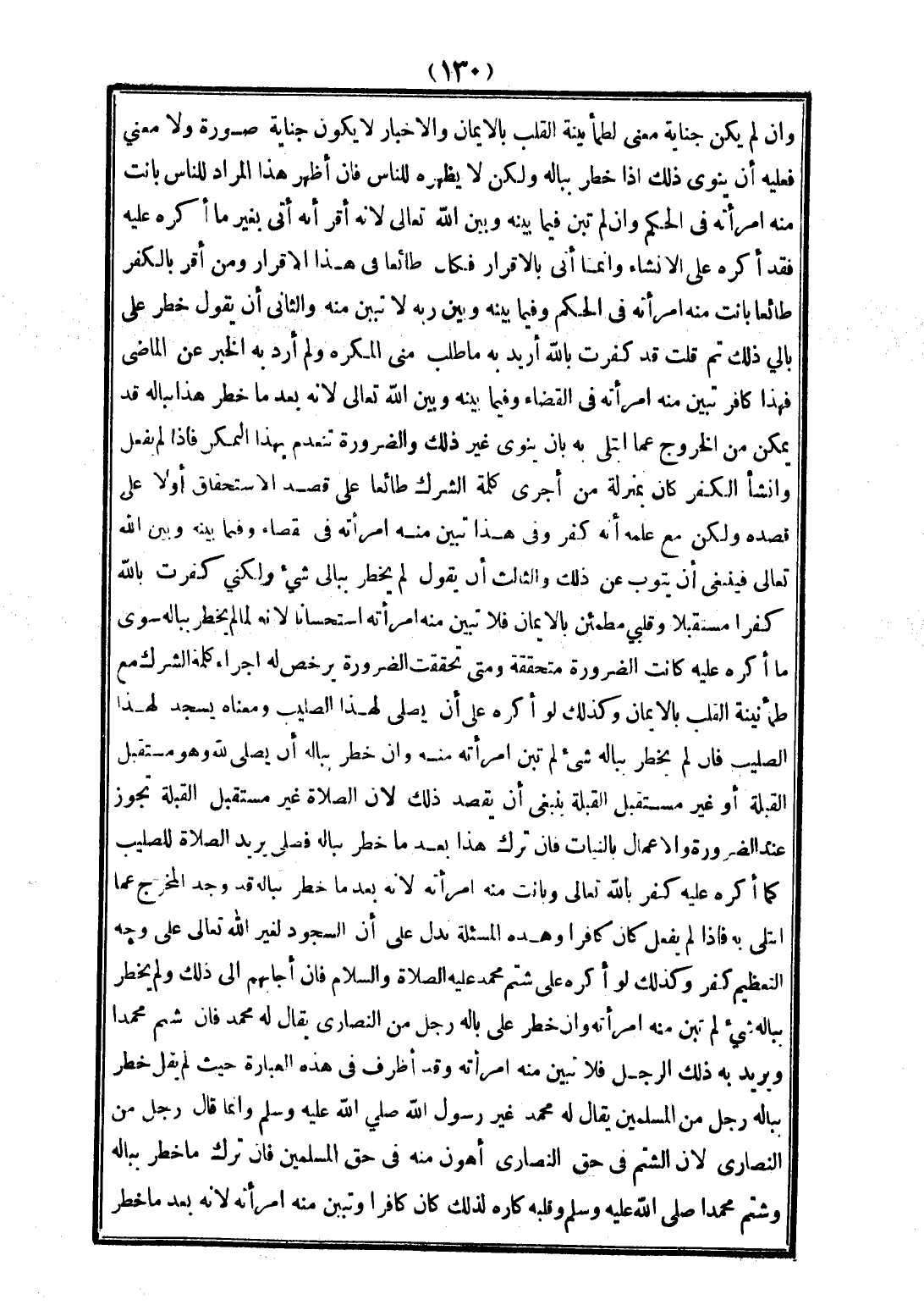 وَكَذَلِكَ لَوْ أُكْرِهَ عَلَى شَتْمِ مُحَمَّدٍ - عَلَيْهِ الصَّلَاةُ وَالسَّلَامُ -، فَإِنْ أَجَابَهُمْ إلَى ذَلِكَ، وَلَمْ يَخْطُرْ بِبَالِهِ شَيْءٌ لَمْ تَبِنْ مِنْهُ امْرَأَتُهُ، وَإِنْ خَطَرَ عَلَى بَالِهِ رَجُلٌ مِنْ النَّصَّارِي يُقَال لَهُ مُحَمَّدٌ فَإِنْ شَتَمَ مُحَمَّدًا، وَيُرِيدُ بِهِ ذَلِكَ الرَّجُلَ، فَلَا تَبِينُ امْرَأَتُهُ وَقَدْ أَظْرَفَ فِي هَذِهِ الْعِبَارَةِ حَيْثُ لَمْ يَقُلْ خَطَرَ بِبَالِهِ رَجُلٌ مِنْ الْمُسْلِمِينَ يُقَال لَهُ مُحَمَّدٌ غَيْرُ رَسُولِ اللَّهِ - صَلَّى اللَّهُ عَلَيْهِ وَسَلَّمَ - وَإِنَّمَا قَالَ رَجُلٌ مِنْ النَّصَارَى؛ لِأَنَّ الشَّتْمَ فِي حَقِّ النَّصَارَى أَهْوَنُ مِنْهُ فِي حَقِّ الْمُسْلِمِينَ، فَإِنْ تَرَكَ مَا خَطَرَ بِبَالِهِ، وَشَتَمَ مُحَمَّدًا - صَلَّى اللَّهُ عَلَيْهِ وَسَلَّمَ - وَقَلْبُهُ كَارِهٌ لِذَلِكَ كَانَ كَافِرًا، وَتَبِينُ مِنْهُ امْرَأَتُهُ؛ لِأَنَّهُ بَعْدَمَا خَطَرَ