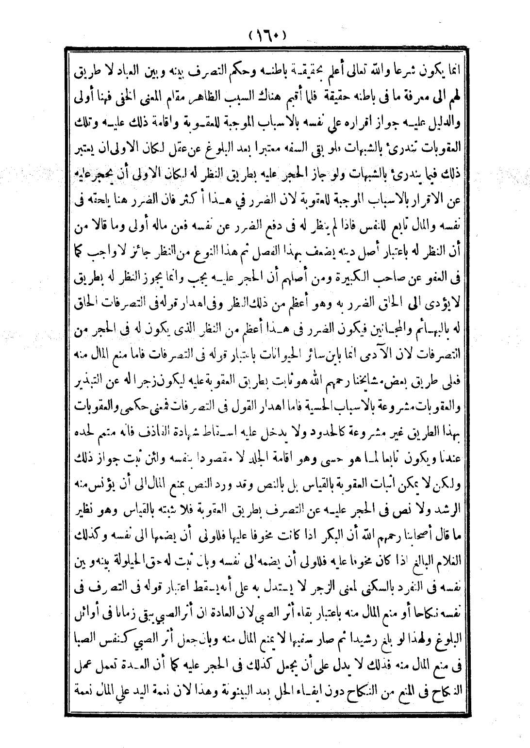 إنَّمَا يَكُونُ شَرْعًا وَاَللَّهُ تَعَالَى أَعْلَمُ بِحَقِيقَةِ بَاطِنِهِ، وَحُكْمُ التَّصَرُّفِ بَيْنَهُ، وَبَيْنَ الْعِبَادِ لَا طَرِيقَ لَهُمْ إلَى مَعْرِفَةِ مَا فِي بَاطِنِهِ حَقِيقَةً فَلَمَّا أُقِيمَ هُنَاكَ السَّبَبُ الظَّاهِرُ مَقَامَ الْمَعْنَى الْخَفِيِّ، فَهُنَا أَوْلَى، وَالدَّلِيلُ عَلَيْهِ جَوَازُ إقْرَارِهِ عَلَى نَفْسِهِ بِالْأَسْبَابِ الْمُوجِبَةِ لِلْعُقُوبَةِ، وَإِقَامَةُ ذَلِكَ عَلَيْهِ، وَتِلْكَ الْعُقُوبَاتُ تَنْدَرِئُ بِالشُّبُهَاتِ، فَلَوْ بَقِيَ السَّفَهُ مُعْتَبَرًا بَعْدَ الْبُلُوغِ عَنْ عَقْلٍ لَكَانَ الْأَوْلَى أَنْ يُعْتَبَرَ ذَلِكَ فِيمَا يَنْدَرِئُ بِالشُّبُهَاتِ، وَلَوْ جَازَ الْحَجْرُ عَلَيْهِ بِطَرِيقِ النَّظَرِ لَهُ لَكَانَ الْأَوْلَى أَنْ يَحْجُرَ عَلَيْهِ عَنْ الْإِقْرَارِ بِالْأَسْبَابِ الْمُوجِبَةِ لِلْعُقُوبَةِ؛ لِأَنَّ الضَّرَرَ فِي هَذَا أَكْثَرُ، فَإِنَّ الضَّرَرَ هُنَا يَلْحَقُهُ فِي نَفْسِهِ، وَالْمَالُ تَابِعٌ لِلنَّفْسِ، فَإِذَا لَمْ يُنْظَرْ لَهُ فِي دَفْعِ الضَّرَرِ عَنْ نَفْسِهِ فَعَنْ مَالِهِ أَوْلَى، وَمَا قَالَا مِنْ أَنَّ النَّظَرَ لَهُ بِاعْتِبَارِ أَصْلِ دِينِهِ يُضَعَّفُ بِهَذَا الْفَصْلِ ثُمَّ هَذَا النَّوْعُ مِنْ النَّظَرِ جَائِزٌ لَا، وَاجِبٌ كَمَا فِي الْعَفْوِ عَنْ صَاحِبِ الْكَبِيرَةِ وَمِنْ أَصْلِهِمْ أَنَّ الْحَجْرَ عَلَيْهِ يَجِبُ، وَإِنَّمَا يَجُوزُ النَّظَرُ لَهُ بِطَرِيقٍ لَا يُؤَدِّي إلَى إلْحَاقِ الضَّرَرِ بِهِ وَهُوَ أَعْظَمُ مِنْ ذَلِكَ النَّظَرِ، وَفِي إهْدَارِ قَوْلِهِ فِي التَّصَرُّفَاتِ إلْحَاقٌ لَهُ بِالْبَهَائِمِ، وَالْمَجَانِينِ فَيَكُونُ الضَّرَرُ فِي هَذَا أَعْظَمُ مِنْ النَّظَرِ الَّذِي يَكُونُ لَهُ فِي الْحَجْرِ مِنْ التَّصَرُّفَاتِ؛ لِأَنَّ الْآدَمِيَّ إنَّمَا بَايَنَ سَائِرَ الْحَيَوَانَاتِ بِاعْتِبَارِ قَوْلِهِ فِي التَّصَرُّفَاتِ، فَأَمَّا مَنْعُ الْمَالِ مِنْهُ، فَعَلَى طَرِيقِ بَعْضِ مَشَايِخِنَا - رَحِمَهُمُ اللَّهُ - هُوَ ثَابِتٌ بِطَرِيقِ الْعُقُوبَةِ عَلَيْهِ لِيَكُونَ زَجْرًا لَهُ عَنْ التَّبْذِيرِ، وَالْعُقُوبَاتُ مَشْرُوعَةٌ بِالْأَسْبَابِ الْحِسِّيَّةِ.