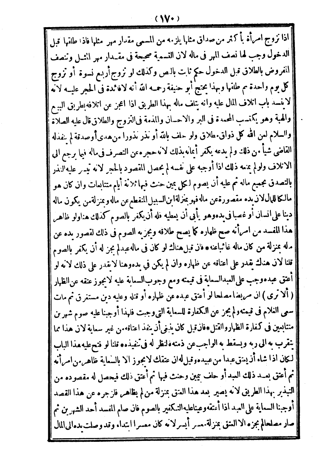 وَكَذَلِكَ لَوْ تَزَوَّجَ أَرْبَعَ نِسْوَةٍ، أَوْ تَزَوَّجَ كُلَّ يَوْمٍ وَاحِدَةٍ، ثُمَّ طَلَّقَهَا، وَبِهَذَا يَحْتَجُّ أَبُو حَنِيفَةَ - رَحِمَهُ اللَّهُ - أَنَّهُ لَا فَائِدَةَ فِي الْحَجْرِ عَلَيْهِ؛ لِأَنَّهُ لَا يَنْسَدُّ بَابُ إتْلَافِ الْمَالِ عَلَيْهِ، وَإِنَّهُ يُتْلِفُ مَالَهُ بِهَذَا الطَّرِيقِ إذَا أُعْجِزَ عَنْ إتْلَافِهِ بِطَرِيقِ الْبَيْعِ، وَالْهِبَةِ، وَهُوَ يَكْتَسِبُ الْمَحْمَدَةَ فِي الْبِرِّ وَالْإِحْسَانِ، وَالْمَذَمَّةَ فِي التَّزَوُّجِ، وَالطَّلَاقِ قَالَ: - عَلَيْهِ الصَّلَاةُ وَالسَّلَامُ - «لَعَنْ اللَّهُ كُلَّ ذَوَّاقٍ مِطْلَاقٍ»، وَلَوْ حَلَفَ بِاَللَّهِ أَوْ نَذَرَ نُذُورًا مِنْ هَدْيٍ، أَوْ صَدَقَةٍ لَمْ يُنَفِّذْ لَهُ الْقَاضِي شَيْئًا مِنْ ذَلِكَ، وَلَمْ يَدَعْهُ يُكَفِّرُ أَيْمَانَهُ بِذَلِكَ؛ لِأَنَّهُ حَجَرَهُ عَنْ التَّصَرُّفِ فِي مَالِهِ فِيمَا يَرْجِعُ إلَى الْإِتْلَافِ، وَلَوْ لَمْ يَمْنَعْهُ ذَلِكَ إذَا، أَوْجَبَهُ عَلَى نَفْسِهِ لَمْ يَحْصُلْ الْمَقْصُودُ بِالْحَجْرِ؛ لِأَنَّهُ تَيَسَّرَ عَلَيْهِ النَّذْرُ بِالتَّصَدُّقِ بِجَمِيعِ مَالِهِ، ثُمَّ عَلَيْهِ أَنْ يَصُومَ لِكُلِّ يَمِينٍ حَنِثَ فِيهَا ثَلَاثَةَ أَيَّامٍ مُتَتَابِعَاتٍ، وَإِنْ كَانَ هُوَ مَالِكًا لِلْمَالِ؛ لِأَنَّ يَدَهُ مَقْصُورَةٌ عَنْ مَالِهِ فَهُوَ بِمَنْزِلَةِ ابْنِ السَّبِيلِ الْمُنْقَطِعِ عَنْ مَالِهِ وَبِمَنْزِلَةِ مَنْ يَكُونُ مَالُهُ دَيْنًا عَلَى إنْسَانٍ، أَوْ غَصْبًا فِي يَدِهِ، وَهُوَ يَأْبَى أَنْ يُعْطِيَهُ، فَلَهُ أَنْ يُكَفِّرَ بِالصَّوْمِ كَذَلِكَ هُنَا.
