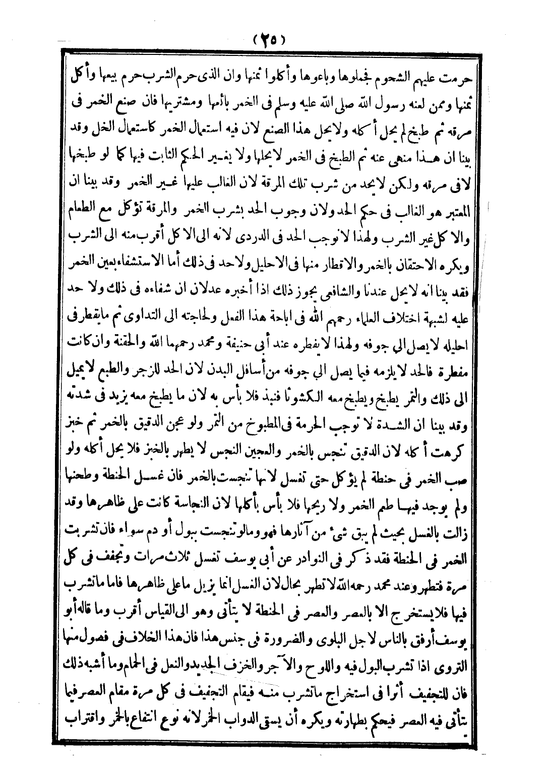 فَإِنْ صُنِعَ الْخَمْرُ فِي مَرَقَةٍ، ثُمَّ طُبِخَ لَمْ يَحِلَّ أَكْلُهُ، وَلَا يَحِلُّ هَذَا الصُّنْعُ؛ لِأَنَّ فِيهِ اسْتِعْمَالُ الْخَمْرِ كَاسْتِعْمَالِ الْخَلِّ، وَقَدْ بَيَّنَّا أَنَّ هَذَا مَنْهِيٌّ عَنْهُ، ثُمَّ الطَّبْخُ فِي الْخَمْرِ لَا يُحِلُّهَا، وَلَا يُغَيِّرُ الْحُكْمَ الثَّابِتَ فِيهَا كَمَا لَوْ طَبَخَهَا لَا فِي مَرَقَةٍ، وَلَكِنْ لَا يُحَدُّ مَنْ شَرِبَ تِلْكَ الْمَرَقَةَ؛ لِأَنَّ الْغَالِبَ عَلَيْهَا غَيْرُ الْخَمْرِ، وَقَدْ بَيَّنَّا أَنَّ الْمُعْتَبَرَ هُوَ الْغَالِبُ فِي حُكْمِ الْحَدِّ؛ وَلِأَنَّ وُجُوبَ الْحَدِّ بِشُرْبِ الْخَمْرِ، وَالْمَرَقَةُ تُؤْكَلُ مَعَ الطَّعَامِ، وَالْأَكْلُ غَيْرُ الشُّرْبِ، وَلِهَذَا لَا نُوجِبُ الْحَدَّ فِي الدُّرْدِيِّ؛ لِأَنَّهُ إلَى الْأَكْلِ أَقْرَبُ مِنْهُ إلَى الشُّرْبِ، وَيُكْرَهُ الِاحْتِقَانُ بِالْخَمْرِ، وَالْإِقْطَارُ مِنْهَا فِي الْإِحْلِيلِ، وَلَا حَدَّ فِي ذَلِكَ أَمَّا الِاسْتِشْفَاءُ بِعَيْنِ الْخَمْرِ، فَقَدْ بَيَّنَّا أَنَّهُ لَا يَحِلُّ عِنْدَنَا وَالشَّافِعِيُّ يُجَوِّزُ ذَلِكَ إذَا أَخْبَرَهُ عَدْلَانِ أَنَّ شِفَاءَهُ فِي ذَلِكَ، وَلَا حَدَّ عَلَيْهِ لِشُبْهَةِ اخْتِلَافِ الْعُلَمَاءِ - رَحِمَهُمُ اللَّهُ - فِي إبَاحَةِ هَذَا الْفِعْلِ، وَلِحَاجَتِهِ إلَى التَّدَاوِي، ثُمَّ مَا يُقَطَّرُ فِي إحْلِيلِهِ لَا يَصِلُ إلَى جَوْفِهِ، وَلِهَذَا لَا يُفْطِرُهُ عِنْدَ أَبِي حَنِيفَةَ وَمُحَمَّدٍ رَحِمَهُمَا اللَّهُ، وَالْحُقْنَةُ، وَإِنْ كَانَتْ مُفْطِرَةً، فَالْحَدُّ لَا يَلْزَمُهُ فِيمَا يَصِلُ إلَى جَوْفِهِ مِنْ أَسَافِلِ الْبَدَنِ؛ لِأَنَّ الْحَدَّ لِلزَّجْرِ، وَالطَّبْعُ لَا يَمِيلُ إلَى ذَلِكَ، وَالتَّمْرُ يُطْبَخُ، وَيُطْبَخُ مَعَهُ الْكَشُوثَاءُ فَنُبِذَ فَلَا بَأْسَ بِهِ؛ لِأَنَّ مَا يُطْبَخُ مَعَهُ يَزِيدُ فِي شِدَّتِهِ، وَقَدْ بَيَّنَّا أَنَّ الشِّدَّةَ لَا تُوجِبُ الْحُرْمَةَ فِي الْمَطْبُوخِ مِنْ التَّمْرِ