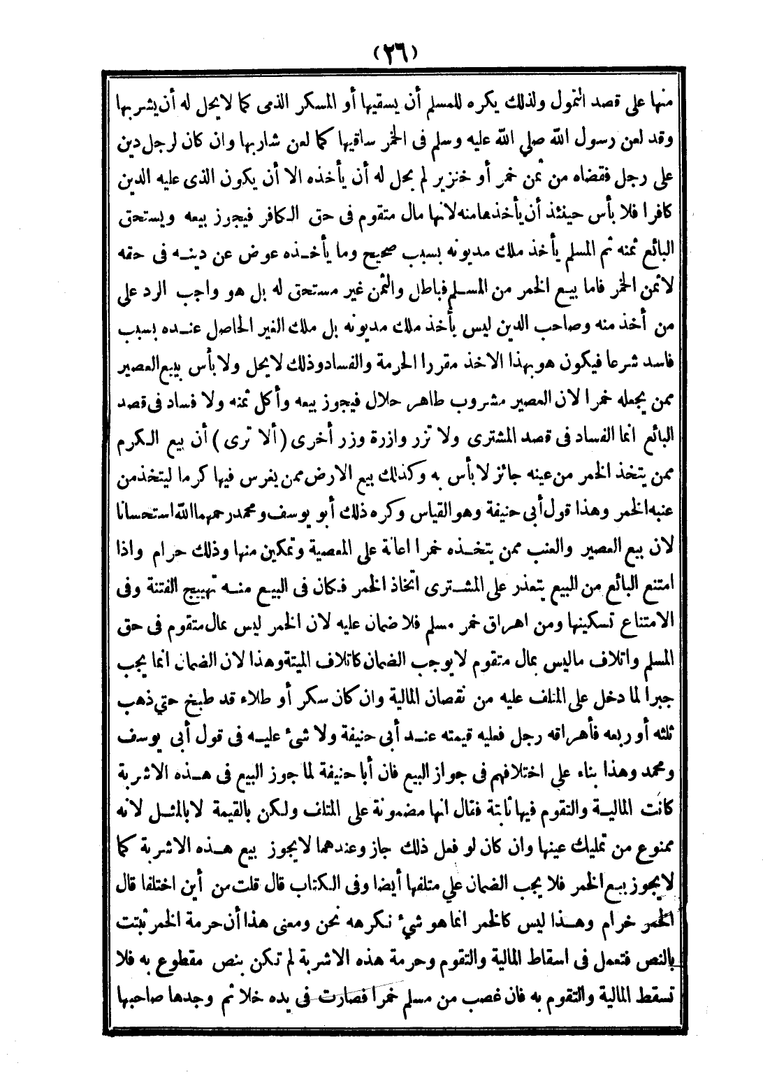 وَمَنْ أَهْرَاقَ خَمْرَ مُسْلِمٍ، فَلَا ضَمَانَ عَلَيْهِ؛ لِأَنَّ الْخَمْرَ لَيْسَ بِمَالٍ مُتَقَوِّمٍ فِي حَقِّ الْمُسْلِمِ، وَإِتْلَافُ مَا لَيْسَ بِمَالٍ مُتَقَوِّمٍ لَا يُوجِبُ الضَّمَانَ كَإِتْلَافِ الْمَيْتَةِ، وَهَذَا؛ لِأَنَّ الضَّمَانَ إنَّمَا يَجِبُ جَبْرًا لِمَا دَخَلَ عَلَى الْمُتْلَفِ عَلَيْهِ مِنْ نُقْصَانِ الْمَالِيَّةِ، وَإِنْ كَانَ سُكَّرًا، أَوْ طِلَاءً قَدْ طُبِخَ حَتَّى ذَهَبَ ثُلُثُهُ، أَوْ رُبُعُهُ، فَأَهْرَاقَهُ رَجُلٌ، فَعَلَيْهِ قِيمَتُهُ عِنْدَ أَبِي حَنِيفَةَ، وَلَا شَيْءَ عَلَيْهِ فِي قَوْلِ أَبِي يُوسُفَ وَمُحَمَّدٍ وَهَذَا بِنَاءً عَلَى اخْتِلَافِهِمْ فِي جَوَازِ الْبَيْعِ.