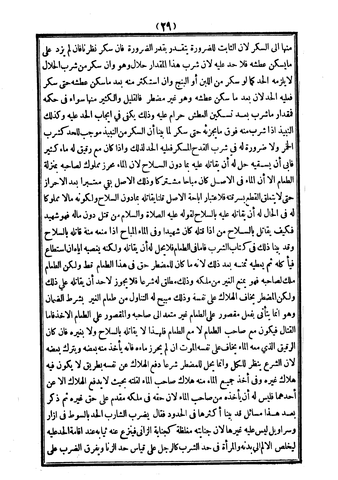 وَكَذَلِكَ النَّبِيذُ إذَا شَرِبَ مِنْهُ، فَوْقَ مَا يُجْزِئُهُ حَتَّى سَكِرَ لِمَا بَيَّنَّا أَنَّ السُّكْرَ مِنْ النَّبِيذِ مُوجِبٌ لِلْحَدِّ كَشُرْبِ الْخَمْرِ، وَلَا ضَرُورَةَ لَهُ فِي شُرْبِ الْقَدَحِ الْمُسْكِرِ، فَعَلَيْهِ الْحَدُّ لِذَلِكَ، وَإِذَا كَانَ مَعَ رَقِيقٍ لَهُ مَاءٌ كَثِيرٌ، فَأَبَى أَنْ يَسْقِيَهُ حَلَّ لَهُ أَنْ يُقَاتِلَهُ عَلَيْهِ بِمَا دُونَ السِّلَاحِ؛ لِأَنَّ الْمَاءَ مُحَرَّزٌ مَمْلُوكٌ لِصَاحِبِهِ بِمَنْزِلَةِ الطَّعَامِ إلَّا أَنَّ الْمَاءَ فِي الْأَصْلِ كَانَ مُبَاحًا مُشْتَرَكًا، وَذَلِكَ الْأَصْلُ بَقِيَ مُعْتَبَرًا بَعْدَ الْإِحْرَازِ حَتَّى لَا يَتَعَلَّقَ الْقَطْعُ بِسَرِقَتِهِ، فَلِاعْتِبَارِ إبَاحَةِ الْأَصْلِ قُلْنَا يُقَاتِلُهُ بِمَا دُونَ السِّلَاحِ، وَلِكَوْنِهِ مَالًا مَمْلُوكًا لَهُ فِي الْحَالِ لَهُ أَنْ يُقَاتِلَهُ عَلَيْهِ بِالسِّلَاحِ لِقَوْلِهِ - عَلَيْهِ الصَّلَاةُ وَالسَّلَامُ - «مَنْ قُتِلَ دُونَ مَالِهِ، فَهُوَ شَهِيدٌ»، فَكَيْفَ يُقَاتِلُ بِالسِّلَاحِ مَنْ إذَا قَتَلَهُ كَانَ شَهِيدًا، وَفِي الْمَاءِ الْمُبَاحِ إذَا مَنَعَهُ مِنْهُ قَاتَلَهُ بِالسِّلَاحِ، وَقَدْ بَيَّنَّا ذَلِكَ فِي كِتَابِ الشُّرْبِ، فَأَمَّا فِي الطَّعَامِ، فَلَا يَحِلُّ لَهُ أَنْ يُقَاتِلَهُ، وَلَكِنَّهُ يَغْصِبُهُ إيَّاهُ إنْ اسْتَطَاعَ، فَيَأْكُلُهُ، ثُمَّ يُعْطِيهِ ثَمَنَهُ بَعْدَ ذَلِكَ؛ لِأَنَّهُ مَا كَانَ لِلْمُضْطَرِّ حَقٌّ فِي هَذَا الطَّعَامِ قَطُّ، وَلَكِنَّ الطَّعَامَ مِلْكٌ لِصَاحِبِهِ، فَهُوَ يَمْنَعُ الْغَيْرَ مِنْ مِلْكِهِ، وَذَلِكَ مُطْلَقٌ لَهُ شَرْعًا، فَلَا يَجُوزُ لِأَحَدٍ أَنْ يُقَاتِلَهُ عَلَى ذَلِكَ، وَلَكِنَّ الْمُضْطَرَّ يَخَافُ الْهَلَاكَ عَلَى نَفْسِهِ، وَذَلِكَ مُبِيحٌ لَهُ التَّنَاوُلَ مِنْ طَعَامِ الْغَيْرِ بِشَرْطِ الضَّمَانِ، وَهُوَ إنَّمَا يَتَأَتَّى بِفِعْلٍ مَقْصُورٍ عَلَى الطَّعَامِ غَيْرِ مُتَعَدٍّ إلَى صَاحِبِهِ، وَالْمَقْصُورُ عَلَى الطَّعَامِ الْأَخْذُ، فَأَمَّا الْقِتَالُ، فَيَكُونُ مَعَ صَاحِبِ الطَّعَامِ لَا مَعَ الطَّعَامِ، فَلِهَذَا لَا يُقَاتِلُهُ بِالسِّلَاحِ، وَلَا بِغَيْرِهِ، فَإِنْ كَانَ الرَّقِيقُ الَّذِي مَعَهُ الْمَاءُ يَخَاف عَلَى نَفْسِهِ الْمَوْتَ إنْ لَمْ يُحْرِزْ مَاءَهُ، فَإِنَّهُ يَأْخُذُ مِنْهُ بَعْضَهُ، وَيَتْرُكُ بَعْضَهُ؛ لِأَنَّ الشَّرْعَ يَنْظُرُ لِلْكُلِّ، وَإِنَّمَا يَحِلُّ لِلْمُضْطَرِّ شَرْعًا دَفْعُ الْهَلَاكِ عَنْ نَفْسِهِ بِطَرِيقٍ لَا يَكُونُ فِيهِ هَلَاكُ غَيْرِهِ، وَفِي أَخْذِ جَمِيعِ الْمَاءِ مِنْهُ هَلَاكُ صَاحِبِ الْمَاءِ لِقِلَّتِهِ بِحَيْثُ لَا يَدْفَعُ الْهَلَاكَ إلَّا عَنْ أَحَدِهِمَا، فَلَيْسَ لَهُ أَنْ يَأْخُذَهُ مِنْ صَاحِبِ الْمَاءِ؛ لِأَنَّ حَقَّهُ فِي مِلْكِهِ مُقَدَّمٌ عَلَى حَقِّ غَيْرِهِ.