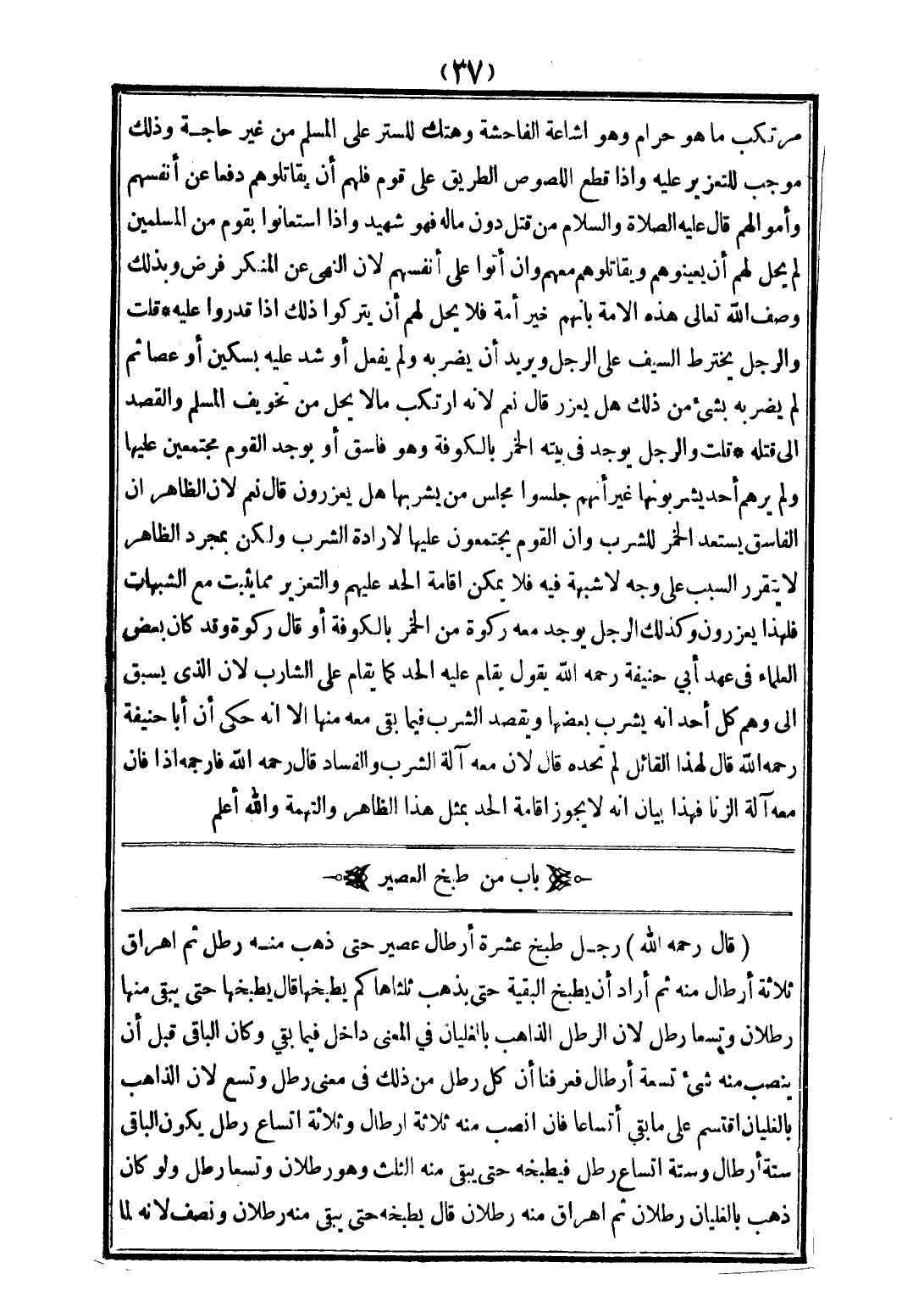 (قَالَ - رَحِمَهُ اللَّهُ -) رَجُلٌ طَبَخَ عَشَرَةَ أَرْطَالِ عَصِيرٍ حَتَّى ذَهَبَ مِنْهُ رِطْلٌ، ثُمَّ أَهْرَاقَ ثَلَاثَةَ أَرْطَالٍ مِنْهُ ثُمَّ أَرَادَ أَنْ يَطْبُخَ الْبَقِيَّةَ حَتَّى يَذْهَبَ ثُلُثَاهَا كَمْ يَطْبُخُهَا قَالَ: يَطْبُخُهَا حَتَّى يَبْقَى مِنْهَا رِطْلَانِ، وَتُسْعَا رِطْلٍ؛ لِأَنَّ الرِّطْلَ الذَّاهِبَ بِالْغَلَيَانِ فِي الْمَعْنَى دَاخِلٌ فِيمَا بَقِيَ، وَكَانَ الْبَاقِي قَبْلَ أَنْ يَنْصَبَّ مِنْهُ شَيْءٌ تِسْعَةُ أَرْطَالٍ، فَعَرَفْنَا أَنَّ كُلَّ رِطْلٍ مِنْ ذَلِكَ فِي مَعْنَى رِطْلٍ، وَتُسْعٍ؛ لِأَنَّ الذَّاهِبَ بِالْغَلَيَانِ اقْتَسَمَ عَلَى مَا بَقِيَ أَتْسَاعًا، فَإِنْ انْصَبَّ مِنْهُ ثَلَاثَةُ أَرْطَالٍ، وَثَلَاثَةُ أَتْسَاعِ رِطْلٍ يَكُونُ الْبَاقِي سِتَّةَ أَرْطَالٍ، وَسِتَّةَ أَتْسَاعِ رِطْلٍ، فَيَطْبُخُهُ حَتَّى يَبْقَى مِنْهُ الثُّلُثُ، وَهُوَ رِطْلَانِ، وَتُسْعَا رِطْلٍ.