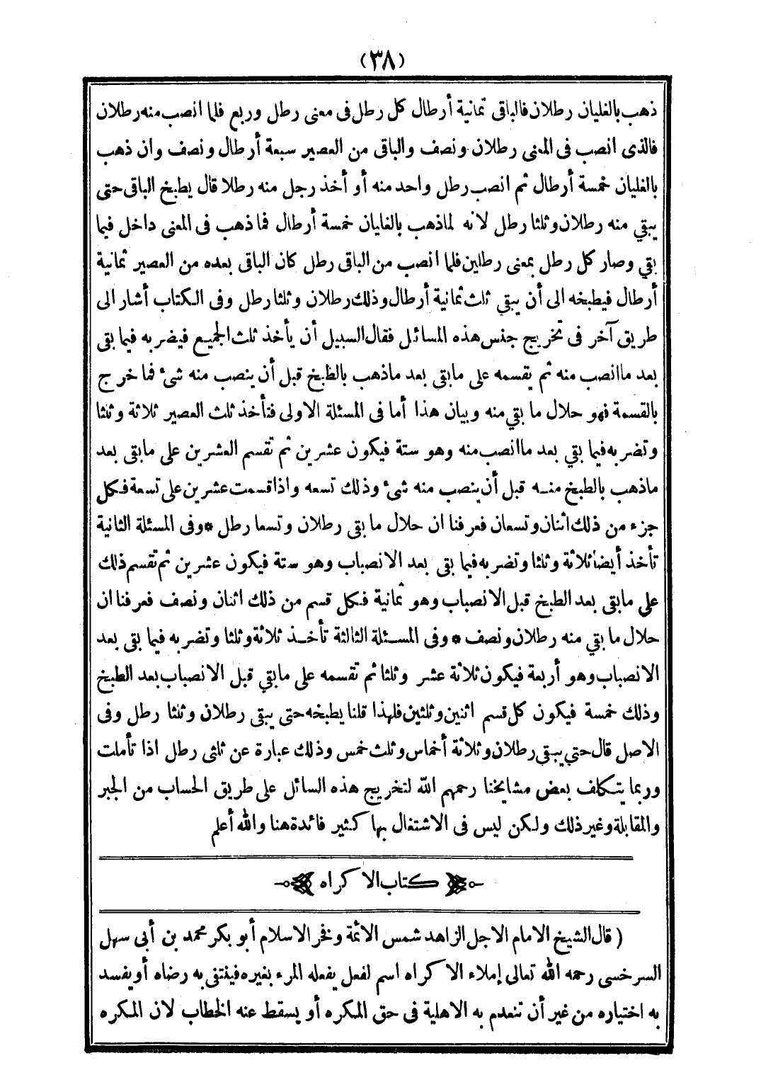 وَفِي الْمَسْأَلَةِ الثَّالِثَةِ تَأْخُذُ ثَلَاثَةً، وَثُلُثًا، وَتَضْرِبُهُ فِيمَا بَقِيَ بَعْدَ الِانْصِبَابِ، وَهُوَ أَرْبَعَةٌ، فَيَكُونُ ثَلَاثَةَ عَشَرَ، وَثُلُثًا، ثُمَّ تَقْسِمُهُ عَلَى مَا بَقِيَ قَبْلَ الِانْصِبَابِ بَعْدَ الطَّبْخِ، وَذَلِكَ خَمْسَةٌ، فَيَكُونُ كُلُّ قِسْمٍ اثْنَيْنِ، وَثُلُثَيْنِ، فَلِهَذَا قُلْنَا يَطْبُخُهُ حَتَّى يَبْقَى رِطْلَانِ، وَثُلُثَا رِطْلٍ، وَفِي الْأَصْلِ قَالَ: حَتَّى يَبْقَى رِطْلَانِ، وَثَلَاثَةُ أَخْمَاسٍ، وَثُلُثُ خُمُسٍ، وَذَلِكَ عِبَارَةٌ عَنْ ثُلُثَيْ رِطْلٍ إذَا تَأَمَّلْت، وَرُبَّمَا يَتَكَلَّفُ بَعْضُ مَشَايِخِنَا - رَحِمَهُمُ اللَّهُ - لِتَخْرِيجِ هَذِهِ الْمَسَائِلِ عَلَى طَرِيقِ الْحِسَابِ مِنْ الْجَبْرِ، وَالْمُقَابَلَةِ، وَغَيْرِ ذَلِكَ، وَلَكِنْ لَيْسَ فِي الِاشْتِغَالِ بِهَا كَثِيرُ فَائِدَةٍ هُنَا، وَاَللَّهُ أَعْلَمُ.
