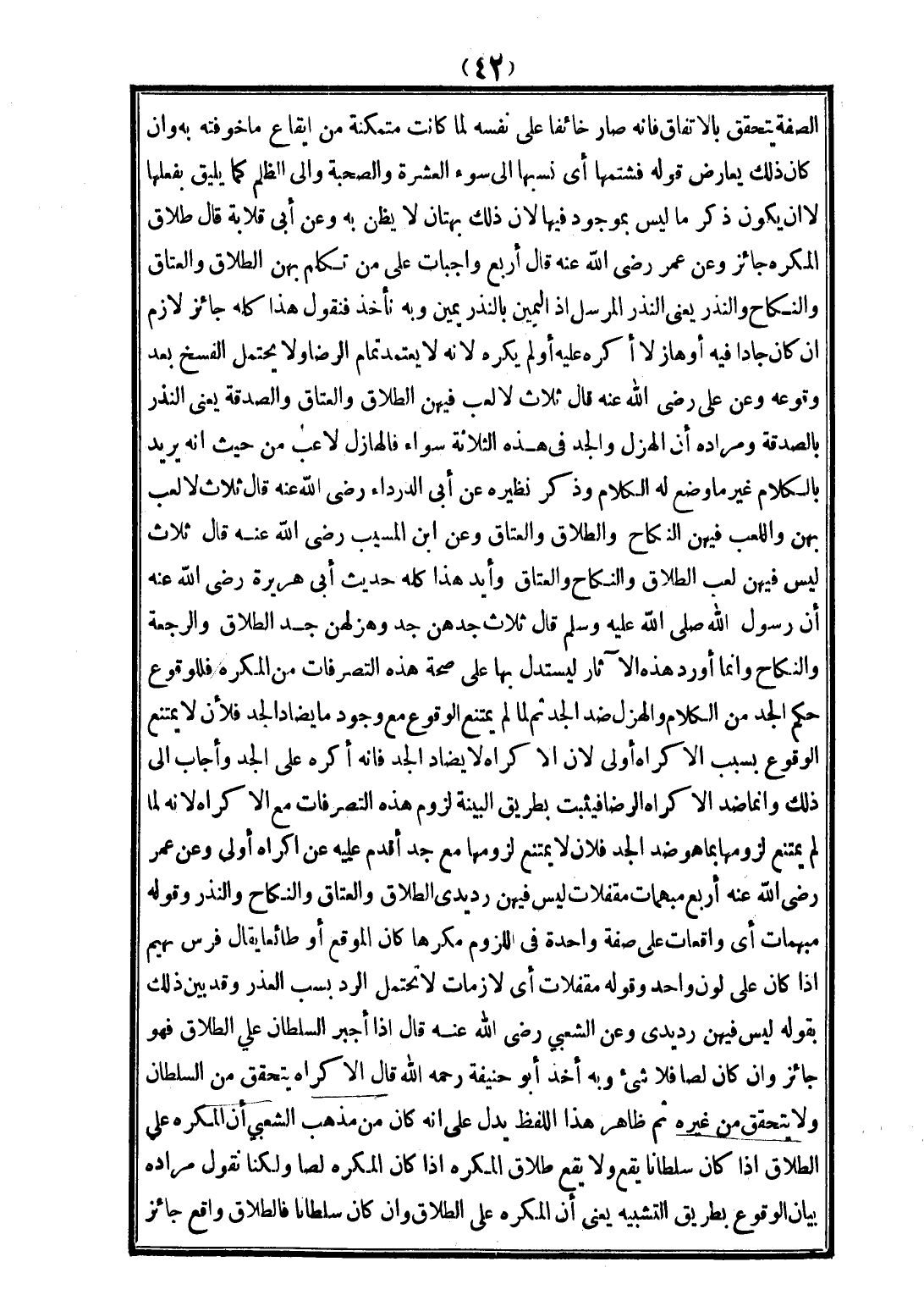 الصِّفَةِ يَتَحَقَّقُ بِالِاتِّفَاقِ، فَإِنَّهُ صَارَ خَائِفًا عَلَى نَفْسِهِ لَمَّا كَانَتْ مُتَمَكِّنَةً مِنْ إيقَاعِ مَا خَوَّفَتْهُ بِهِ، وَإِنْ كَانَ ذَلِكَ يُعَارِضُ قَوْلَهُ: فَشَتَمَهَا أَيْ نَسَبَهَا إلَى سُوءِ الْعِشْرَة، وَالصُّحْبَةِ، وَإِلَى الظُّلْمِ كَمَا يَلِيقُ بِفِعْلِهَا لَا أَنْ يَكُونَ ذَكَرَ مَا لَيْسَ بِمَوْجُودٍ فِيهَا؛ لِأَنَّ ذَلِكَ بُهْتَانٌ لَا يُظَنُّ بِهِ، وَعَنْ أَبِي قِلَابَةَ قَالَ: طَلَاقُ الْمُكْرَهِ جَائِزٌ، وَعَنْ عُمَرَ - رَضِيَ اللَّهُ عَنْهُ - قَالَ: أَرْبَعٌ وَاجِبَاتٌ عَلَى مَنْ تَكَلَّمَ بِهِنَّ: الطَّلَاقُ، وَالْعَتَاقُ، وَالنِّكَاحُ، وَالنَّذْرُ يَعْنِي النَّذْرَ الْمُرْسَلَ إذْ الْيَمِينُ بِالنَّذْرِ يَمِينٌ، وَبِهِ نَأْخُذُ، فَنَقُولُ: هَذَا كُلُّهُ جَائِزٌ لَازِمٌ إنْ كَانَ جَادًّا فِيهِ، أَوْ هَازِلًا أُكْرِهَ عَلَيْهِ، أَوْ لَمْ يُكْرَهْ؛ لِأَنَّهُ لَا يُعْتَمَدُ تَمَامُ الرِّضَا، وَلَا يَحْتَمِلُ الْفَسْخَ بَعْدَ وُقُوعِهِ، وَعَنْ عَلِيٍّ - رَضِيَ اللَّهُ عَنْهُ - قَالَ: ثَلَاثٌ لَا لَعِبَ فِيهِنَّ: الطَّلَاقُ، وَالْعَتَاقُ، وَالصَّدَقَةُ يَعْنِي النَّذْرَ بِالصَّدَقَةِ، وَمُرَادُهُ أَنَّ الْهَزْلَ، وَالْجِدَّ فِي هَذِهِ الثَّلَاثَةِ سَوَاءٌ، فَالْهَازِلُ لَاعِبٌ مِنْ حَيْثُ إنَّهُ يُرِيدُ بِالْكَلَامِ غَيْرَ مَا وُضِعَ لَهُ الْكَلَامُ.