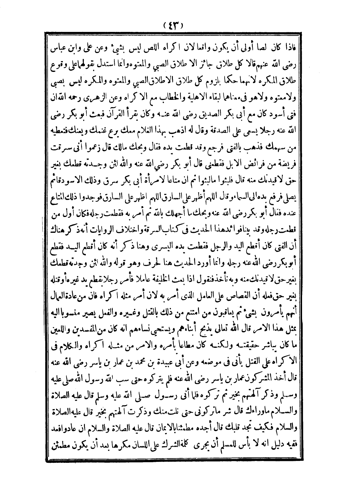 وَعَنْ عَلِيٍّ وَابْنِ عَبَّاسٍ - رَضِيَ اللَّهُ عَنْهُمْ - قَالَا: كُلُّ طَلَاقٍ جَائِزٌ إلَّا طَلَاقَ الصَّبِيِّ، وَالْمَعْتُوهِ، وَإِنَّمَا اُسْتُدِلَّ بِقَوْلِهِمَا عَلَى وُقُوعِ طَلَاقِ الْمُكْرَهِ؛ لِأَنَّهُمَا حَكَمَا بِلُزُومِ كُلِّ طَلَاقٍ إلَّا طَلَاقَ الصَّبِيِّ، وَالْمَعْتُوهِ، وَالْمُكْرَهُ لَيْسَ بِصَبِيٍّ، وَلَا مَعْتُوهٍ، وَلَا هُوَ فِي مَعْنَاهُمَا لِبَقَاءِ الْأَهْلِيَّةِ، وَالْخِطَابِ مَعَ الْإِكْرَاهِ، وَعَنْ الزُّهْرِيِّ - رَحِمَهُ اللَّهُ - أَنَّ فَتًى أَسْوَدَ كَانَ مَعَ أَبِي بَكْرٍ الصِّدِّيقِ - رَضِيَ اللَّهُ عَنْهُ -، وَكَانَ يَقْرَأُ الْقُرْآنَ، فَبَعَثَ أَبُو بَكْرٍ - رَضِيَ اللَّهُ عَنْهُ - رَجُلًا يَسْعَى عَلَى الصَّدَقَةِ، وَقَالَ لَهُ: اذْهَبْ بِهَذَا الْغُلَامِ مَعَك يَرْعَ غَنَمَك، وَيُعِنْك، فَتُعْطِيَهُ مِنْ سَهْمِك فَذَهَبَ بِالْفَتَى فَرَجَعَ، وَقَدْ قُطِعَتْ يَدُهُ فَقَالَ: وَيْحَكَ مَالَكَ؟ قَالَ: زَعَمُوا أَنِّي سَرَقْتُ فَرِيضَةً مِنْ فَرَائِضِ الْإِبِلِ، فَقَطَعَنِي قَالَ أَبُو بَكْرٍ - رَضِيَ اللَّهُ عَنْهُ - وَاَللَّهِ لَئِنْ وَجَدْتُهُ قَطَعَك بِغَيْرِ حَقٍّ لِأُقِيدَنَّكَ مِنْهُ قَالَ فَلَبِثُوا مَا لَبِثُوا، ثُمَّ إنَّ مَتَاعًا لِامْرَأَةِ أَبِي بَكْرٍ سُرِقَ، وَذَلِكَ الْأَسْوَدُ قَائِمٌ يُصَلِّي، فَرَفَعَ يَدَهُ إلَى السَّمَاءِ، وَقَالَ: اللَّهُمَّ أَظْهِرْ عَلَى السَّارِقِ اللَّهُمَّ أَظْهِرْ عَلَى السَّارِقِ، فَوَجَدُوا ذَلِكَ الْمَتَاعَ عِنْدَهُ، فَقَالَ أَبُو بَكْرٍ - رَضِيَ اللَّهُ عَنْهُ -، وَيْحَكَ مَا أَجْهَلَك بِاَللَّهِ، ثُمَّ أَمَرَ بِهِ، فَقُطِعَتْ رِجْلُهُ، فَكَانَ أَوَّلَ مَنْ قُطِعَتْ رِجْلُهُ، وَقَدْ بَيَّنَّا، فَوَائِدَ هَذَا الْحَدِيثِ فِي كِتَابِ السَّرِقَةِ، وَاخْتِلَافُ الرِّوَايَاتِ أَنَّهُ ذَكَرَ هُنَاكَ أَنَّ الْفَتَى كَانَ أَقْطَعَ الْيَدِ، وَالرِّجْلِ، فَقُطِعَتْ يَدُهُ الْيُسْرَى، وَهُنَا ذَكَرَ أَنَّهُ كَانَ أَقْطَعَ الْيَدِ، فَقَطَعَ أَبُو بَكْرٍ - رَضِيَ اللَّهُ عَنْهُ - رِجْلَهُ، وَإِنَّمَا أَوْرَدَ الْحَدِيثَ هُنَا لِحَرْفٍ، وَهُوَ قَوْلُهُ، (وَاَللَّهِ لَئِنْ وَجَدْتُهُ قَطَعَك بِغَيْرِ حَقٍّ لَأُقِيدَنَّكَ مِنْهُ) وَبِهِ نَأْخُذُ، فَنَقُولُ إذَا بَعَثَ الْخَلِيفَةُ عَامِلًا، فَأَمَرَ رَجُلًا بِقَطْعِ يَدِ غَيْرِهِ، أَوْ قَتَلَهُ بِغَيْرِ حَقٍّ، فِعْلِهِ أَنَّ الْقِصَاصَ عَلَى الْعَامِلِ الَّذِي أَمَرَ بِهِ لِأَنَّ أَمْرَ مِثْلِهِ إكْرَاهٌ، فَإِنَّ مِنْ عَادَةِ الْعُمَّالِ أَنَّهُمْ يَأْمُرُونَ بِشَيْءٍ، ثُمَّ يُعَاقِبُونَ مَنْ امْتَنَعَ مِنْ ذَلِكَ بِالْقَتْلِ، وَغَيْرِهِ، وَالْفِعْلُ يَصِيرُ مَنْسُوبًا إلَيْهِ بِمِثْلِ هَذَا الْأَمْرِ قَالَ اللَّهُ تَعَالَى {يُذَبِّحُ أَبْنَاءَهُمْ وَيَسْتَحْيِي نِسَاءَهُمْ إنَّهُ كَانَ مِنْ الْمُفْسِدِينَ} [القصص: 4]، وَاللَّعِينُ مَا كَانَ يُبَاشِرُ حَقِيقَتَهُ، وَلَكِنَّهُ كَانَ مُطَاعًا بِأَمْرِهِ، وَالْأَمْرُ مِنْ مِثْلِهِ إكْرَاهٌ، وَالْكَلَامُ فِي الْإِكْرَاهِ عَلَى الْقَتْلِ يَأْتِي فِي مَوْضِعِهِ. .
