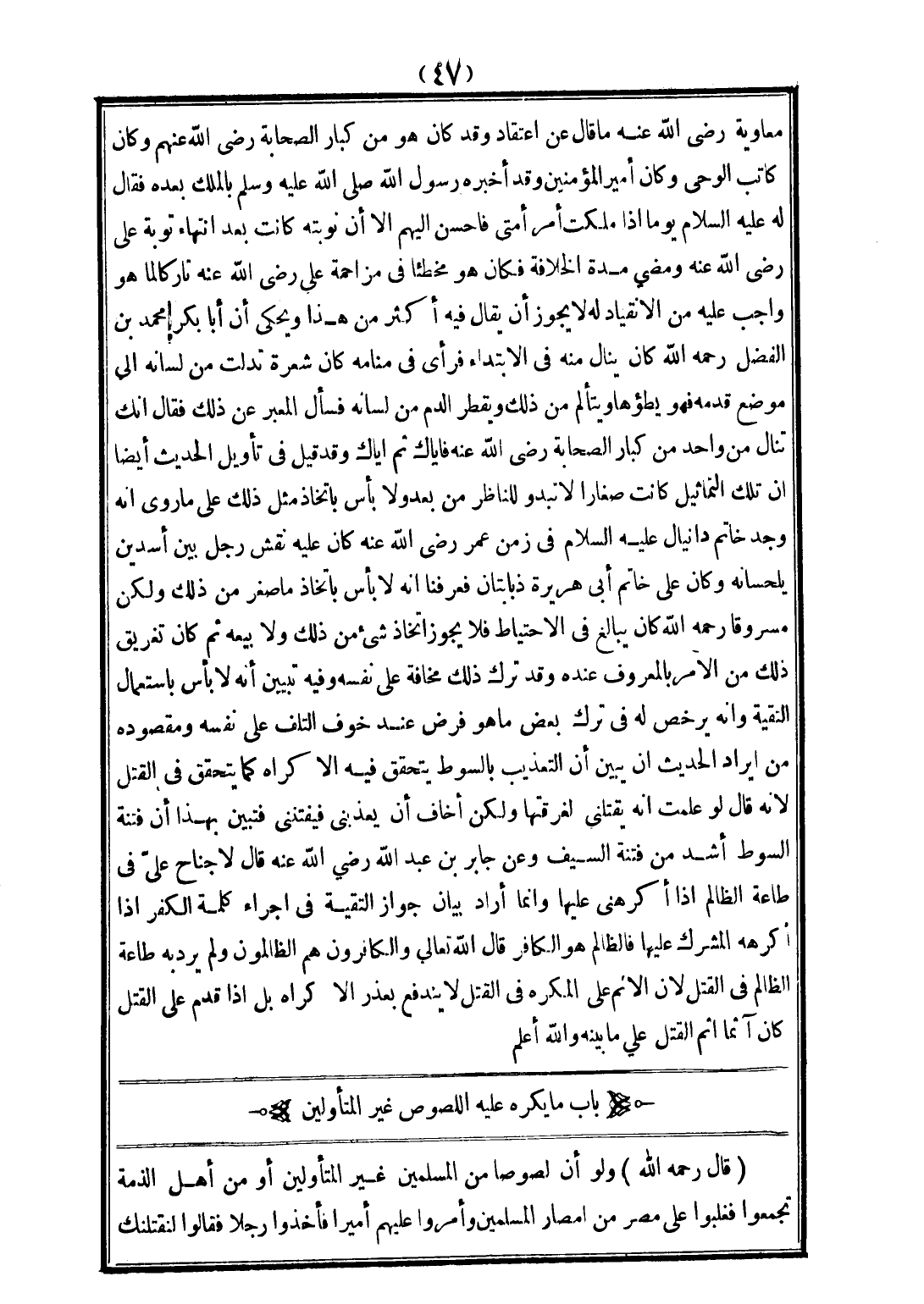 مُعَاوِيَةَ - رَضِيَ اللَّهُ عَنْهُ - مَا قَالَ عَنْ اعْتِقَادٍ، وَقَدْ كَانَ هُوَ مِنْ كِبَارِ الصَّحَابَةِ - رَضِيَ اللَّهُ عَنْهُمْ -، وَكَانَ كَاتِبَ الْوَحْيِ، وَكَانَ أَمِيرَ الْمُؤْمِنِينَ، وَقَدْ أَخْبَرَهُ رَسُولُ اللَّهِ - صَلَّى اللَّهُ عَلَيْهِ وَسَلَّمَ - بِالْمُلْكِ بَعْدَهُ، فَقَالَ لَهُ - عَلَيْهِ السَّلَامُ - يَوْمًا إذَا مَلَكْتَ أَمَرَ أُمَّتِي، فَأَحْسِنْ إلَيْهِمْ إلَّا أَنَّ نَوْبَتَهُ كَانَتْ بَعْدَ انْتِهَاءِ نَوْبَةِ عَلِيٍّ - رَضِيَ اللَّهُ عَنْهُ -، وَمَضَى مُدَّةُ الْخِلَافَةِ، فَكَانَ هُوَ مُخْطِئًا فِي مُزَاحَمَةِ عَلِيٍّ - رَضِيَ اللَّهُ عَنْهُ - تَارِكًا لِمَا هُوَ وَاجِبٌ عَلَيْهِ مِنْ الِانْقِيَادِ لَهُ؛ لَا يَجُوزُ أَنْ يُقَالَ فِيهِ أَكْثَرُ مِنْ هَذَا، وَيُحْكَى أَنَّ أَبَا بَكْرِ مُحَمَّدَ بْنَ الْفَضْلِ - رَحِمَهُ اللَّهُ - كَانَ يَنَالُ مِنْهُ فِي الِابْتِدَاءِ، فَرَأَى فِي مَنَامِهِ كَأَنَّ شَعْرَةً تَدَلَّتْ مِنْ لِسَانِهِ إلَى مَوْضِعِ قَدَمِهِ، فَهُوَ يَطَؤُهَا، وَيَتَأَلَّمُ مِنْ ذَلِكَ، وَيَقْطُرُ الدَّمُ مِنْ لِسَانِهِ، فَسَأَلَ الْمُعَبِّرَ عَنْ ذَلِكَ فَقَالَ إنَّك تَنَالُ مِنْ وَاحِدٍ مِنْ كِبَارِ الصَّحَابَةِ - رَضِيَ اللَّهُ عَنْهُ - فَإِيَّاكَ، ثُمَّ إيَّاكَ.