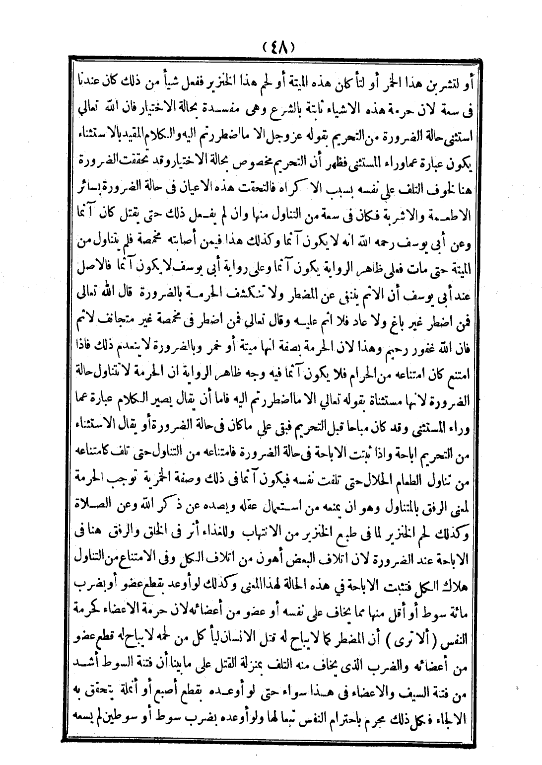 وَهَذَا لِأَنَّ الْحُرْمَةَ بِصِفَةِ أَنَّهَا مَيْتَةٌ، أَوْ خَمْرٌ، وَبِالضَّرُورَةِ لَا يَنْعَدِمُ ذَلِكَ، فَإِذَا امْتَنَعَ كَانَ امْتِنَاعُهُ مِنْ الْحَرَامُ، فَلَا يَكُونُ آثِمًا فِيهِ وَجْهُ ظَاهِرِ الرِّوَايَةِ أَنَّ الْحُرْمَةَ لَا تَتَنَاوَلُ حَالَةَ الضَّرُورَةِ؛ لِأَنَّهَا مُسْتَثْنَاةٌ بِقَوْلِهِ تَعَالَى {إلَّا مَا اُضْطُرِرْتُمْ إلَيْهِ} [الأنعام: 119]، فَأَمَّا أَنْ يُقَالَ: يَصِيرُ الْكَلَامُ عِبَارَةً عَمَّا وَرَاءَ الْمُسْتَثْنَى، وَقَدْ كَانَ مُبَاحًا قَبْلَ التَّحْرِيمِ فَبَقِيَ عَلَى مَا كَانَ فِي حَالَةِ الضَّرُورَةِ، أَوْ يُقَالَ: الِاسْتِثْنَاءُ مِنْ التَّحْرِيمِ إبَاحَةٌ، وَإِذَا ثَبَتَتْ الْإِبَاحَةُ فِي حَالَةِ الضَّرُورَةِ، فَامْتِنَاعُهُ مِنْ التَّنَاوُلِ حَتَّى تَلِفَ كَامْتِنَاعِهِ مِنْ تَنَاوُلِ الطَّعَامِ الْحَلَالِ حَتَّى تَلِفَتْ نَفْسُهُ، فَيَكُونُ آثِمًا فِي ذَلِكَ، وَصِفَةُ الْخَمْرِيَّةِ تُوجِبُ الْحُرْمَةَ لِمَعْنَى الرِّفْقِ بِالْمُتَنَاوِلِ، وَهُوَ أَنْ يَمْنَعَهُ مِنْ اسْتِعْمَالِ عَقْلِهِ، وَيَصُدَّهُ عَنْ ذِكْرِ اللَّهِ، وَعَنْ الصَّلَاةِ، وَكَذَلِكَ لَحْمُ الْخِنْزِيرِ لِمَا فِي طَبْعِ الْخِنْزِيرِ مِنْ الِانْتِهَابِ، وَلِلْغِذَاءِ أَثَرٌ فِي الْخَلْقِ، وَالرِّفْقُ هُنَا فِي الْإِبَاحَةِ عِنْدَ الضَّرُورَةِ؛ لِأَنَّ إتْلَافَ الْبَعْضِ أَهْوَنُ مِنْ إتْلَافِ الْكُلِّ، وَفِي الِامْتِنَاعِ مِنْ التَّنَاوُلِ هَلَاك الْكُلُّ، فَتَثْبُتُ الْإِبَاحَةُ فِي هَذِهِ الْحَالَةِ لِهَذَا الْمَعْنَى، وَكَذَلِكَ لَوْ أَوْعَدَ بِقَطْعِ عُضْوٍ، أَوْ بِضَرْبِ مِائَةِ سَوْطٍ، أَوْ أَقَلَّ مِنْهَا مِمَّا يَخَافُ عَلَى نَفْسِهِ، أَوْ عُضْوٍ مِنْ أَعْضَائِهِ؛ لِأَنَّ حُرْمَةَ الْأَعْضَاءِ كَحُرْمَةِ النَّفْسِ.