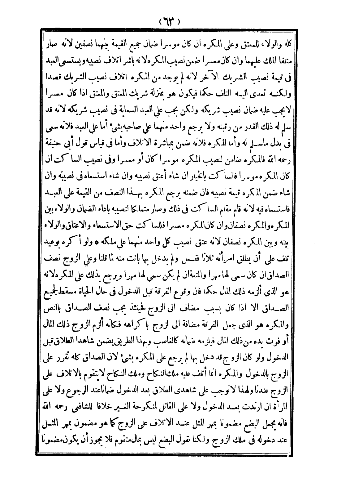 كُلُّهُ، وَالْوَلَاءُ لِلْمُعْتِقِ، وَعَلَى الْمُكْرِهِ إنْ كَانَ مُوسِرًا ضَمَانُ جَمِيعِ الْقِيمَةِ بَيْنَهُمَا نِصْفَيْنِ؛ لِأَنَّهُ صَارَ مُتْلِفًا الْمِلْكَ عَلَيْهِمَا، وَإِنْ كَانَ مُعْسِرًا ضَمِنَ نَصِيبَ الْمُكْرَهِ؛ لِأَنَّهُ بَاشَرَ إتْلَافَ نَصِيبِهِ، وَيُسْتَسْعَى الْعَبْدُ فِي قِيمَةِ نَصِيبِ الشَّرِيكِ الْآخَرِ؛ لِأَنَّهُ لَمْ يُوجَدْ مِنْ الْمُكْرَهِ إتْلَافُ نَصِيبِ الشَّرِيكِ قَصْدًا، وَلَكِنَّهُ تَعَدَّى إلَيْهِ التَّلَفُ حُكْمًا، فَيَكُونُ هُوَ بِمَنْزِلَةِ شَرِيكِ الْمُعْتِقِ، وَالْمُعْتِقُ إذَا كَانَ مُعْسِرًا لَا يَجِبُ عَلَيْهِ ضَمَانُ نَصِيبِ شَرِيكِهِ، وَلَكِنْ يَجِبُ عَلَى الْعَبْدِ السِّعَايَةُ فِي نَصِيبِ شَرِيكِهِ؛ لِأَنَّهُ قَدْ سَلَّمَ لَهُ ذَلِكَ الْقَدْرَ مِنْ رَقَبَتِهِ، وَلَا يَرْجِعُ، وَاحِدٌ مِنْهُمَا عَلَى صَاحِبِهِ بِشَيْءٍ.