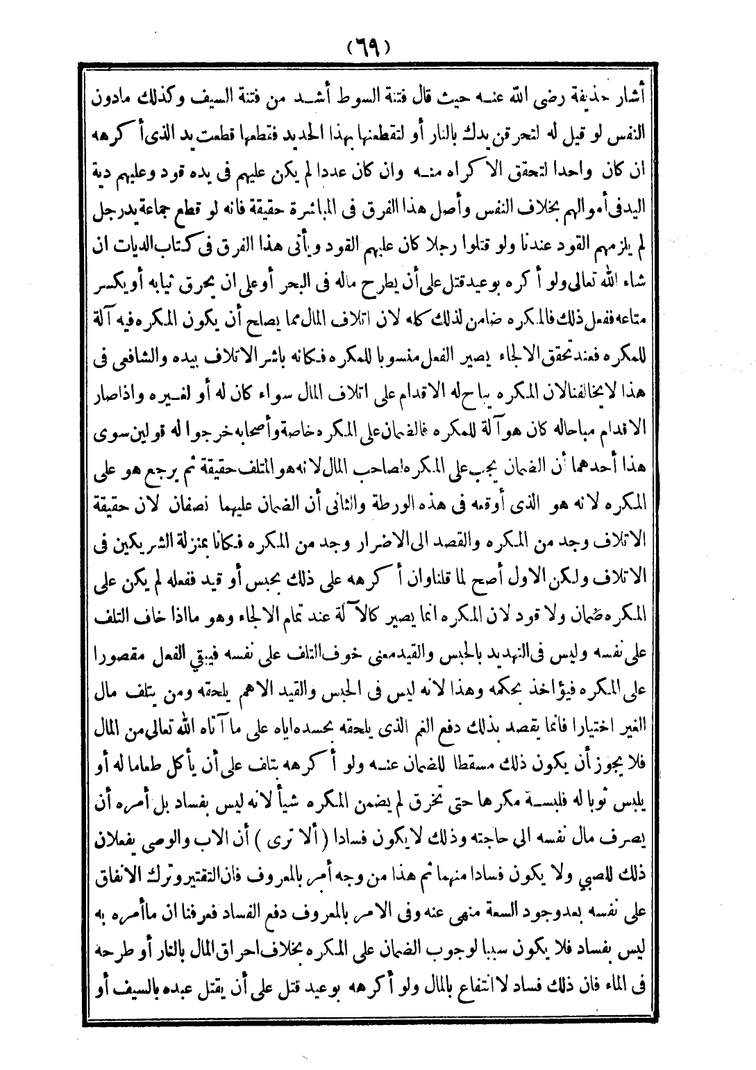 أَشَارَ حُذَيْفَةُ - رَضِيَ اللَّهُ عَنْهُ - حَيْثُ قَالَ: فِتْنَةُ السَّوْطِ أَشَدُّ مِنْ فِتْنَةِ السَّيْفِ، وَكَذَلِكَ مَا دُونَ النَّفْسِ لَوْ قِيلَ: لَهُ لَتُحْرِقَنَّ يَدَك بِالنَّارِ، أَوْ لَتَقْطَعَنَّهَا بِهَذَا الْحَدِيدِ، فَقَطَعَهَا قُطِعَتْ يَدُ الَّذِي أَكْرَهَهُ إنْ كَانَ وَاحِدًا لِتَحَقُّقِ الْإِكْرَاهِ مِنْهُ، وَإِنْ كَانَ عَدَدًا لَمْ يَكُنْ عَلَيْهِمْ فِي يَدِهِ قَوَدٌ، وَعَلَيْهِمْ دِيَةُ الْيَدِ فِي أَمْوَالِهِمْ بِخِلَافِ النَّفْسِ.