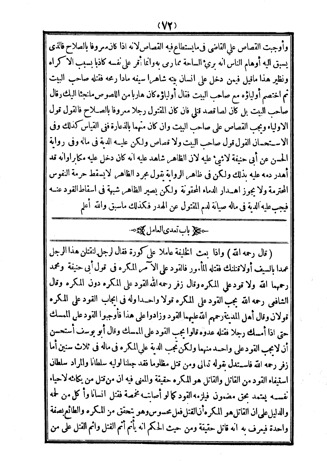 (قَالَ - رَحِمَهُ اللَّهُ -) وَإِذَا بَعَثَ الْخَلِيفَةُ عَامِلًا عَلَى كُورَةٍ، فَقَالَ لِرَجُلٍ لَتَقْتُلَنَّ هَذَا الرَّجُلَ عَمْدًا بِالسَّيْفِ، أَوْ لَأَقْتُلَنَّكَ، فَقَتَلَهُ الْمَأْمُورُ، فَالْقَوَدُ عَلَى الْآمِرِ الْمُكْرِهِ فِي قَوْلِ أَبِي حَنِيفَةَ وَمُحَمَّدٍ رَحِمَهُمَا اللَّهُ، وَلَا قَوَدَ عَلَى الْمُكْرَهِ، وَقَالَ زُفَرُ - رَحِمَهُ اللَّهُ - الْقَوَدُ عَلَى الْمُكْرِهِ دُونَ الْمُكْرَهِ، وَقَالَ الشَّافِعِيُّ - رَحِمَهُ اللَّهُ - يَجِبُ الْقَوَدُ عَلَى الْمُكْرِهِ قَوْلًا وَاحِدًا، وَلَهُ فِي إيجَابِ الْقَوَدِ عَلَى الْمُكْرِهِ قَوْلَانِ.