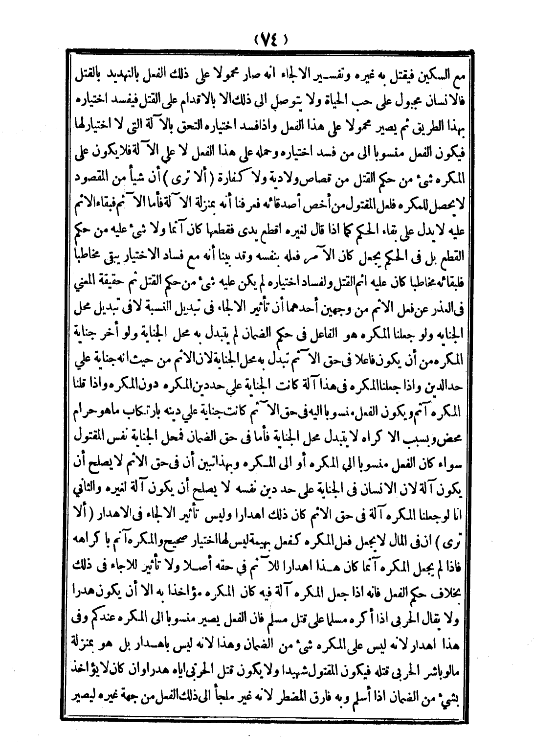 مَعَ السِّكِّينِ، فَيَقْتُلَ بِهِ غَيْرَهُ، وَتَفْسِيرُ الْإِلْجَاءِ أَنَّهُ صَارَ مَحْمُولًا عَلَى ذَلِكَ الْفِعْلِ بِالتَّهْدِيدِ بِالْقَتْلِ، فَالْإِنْسَانُ مَجْبُولٌ عَلَى حُبِّ الْحَيَاةِ، وَلَا يَتَوَصَّلُ إلَى ذَلِكَ إلَّا بِالْإِقْدَامِ عَلَى الْقَتْلِ، فَيَفْسُدُ اخْتِيَارُهُ بِهَذَا الطَّرِيقِ، ثُمَّ يَصِيرُ مَحْمُولًا عَلَى هَذَا الْفِعْلِ، وَإِذَا فَسَدَ اخْتِيَارُهُ الْتَحَقَ بِالْآلَةِ الَّتِي لَا اخْتِيَارَ لَهَا، فَيَكُونُ الْفِعْلُ مَنْسُوبًا إلَى مَنْ فَسَدَ اخْتِيَارُهُ، وَحَمْلُهُ عَلَى هَذَا الْفِعْلِ لَا عَلَى الْآلَةِ، فَلَا يَكُونُ عَلَى الْمُكْرَهِ شَيْءٌ مِنْ حُكْمِ الْقَتْلِ مِنْ قِصَاصٍ، وَلَا دِيَةٍ، وَلَا كَفَّارَةٍ.