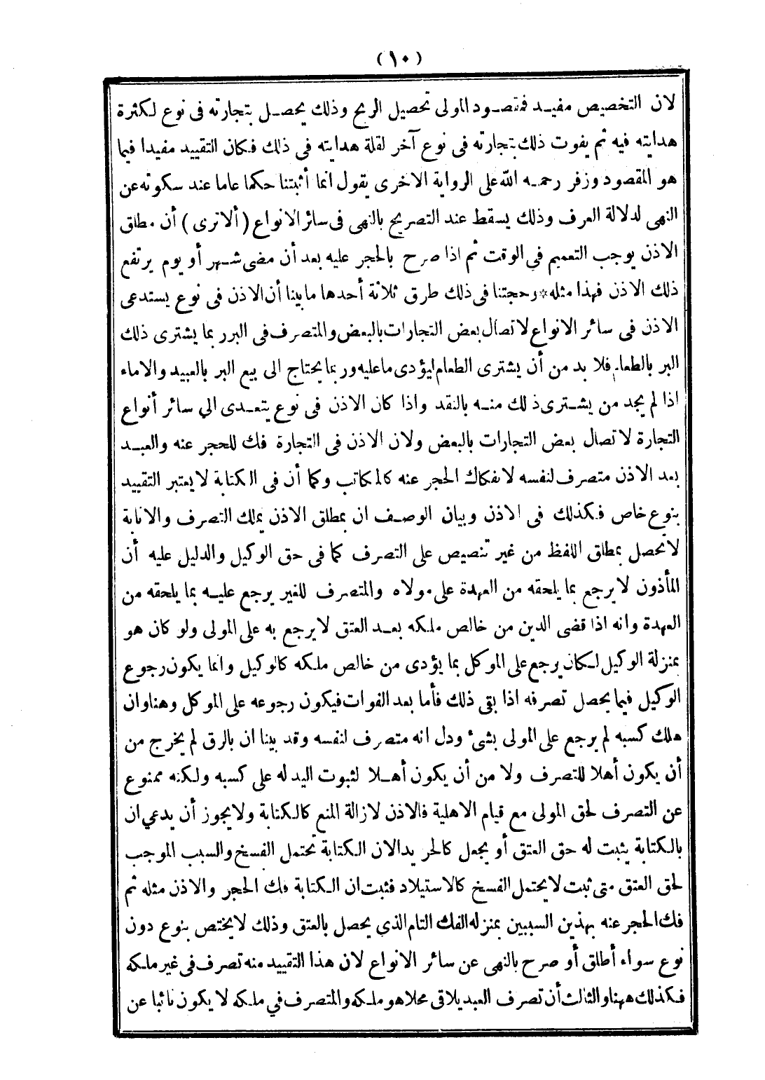أَحَدُهَا مَا بَيَّنَّا أَنَّ الْإِذْنَ فِي نَوْعٍ يَسْتَدْعِي الْإِذْنَ فِي سَائِرِ الْأَنْوَاعِ لِاتِّصَالِ بَعْضِ التِّجَارَاتِ بِالْبَعْضِ، وَالْمُتَصَرِّفُ فِي الْبُرِّ بِمَا يَشْتَرِي ذَلِكَ الْبُرَّ بِالطَّعَامِ فَلَا بُدَّ مِنْ أَنْ يَشْتَرِيَ الطَّعَامَ لِيُؤَدِّيَ مَا عَلَيْهِ وَرُبَّمَا يَحْتَاجُ إلَى بَيْعِ الْبُرِّ بِالْعَبِيدِ، وَالْإِمَاءِ إذَا لَمْ يَجِدْ مِنْ يَشْتَرِي ذَلِكَ مِنْهُ بِالنَّقْدِ وَإِذَا كَانَ الْإِذْنُ فِي نَوْعٍ يَتَعَدَّى إلَى سَائِرِ أَنْوَاعِ التِّجَارَةِ لِاتِّصَالِ بَعْضِ التِّجَارَاتِ بِالْبَعْضِ وَلِأَنَّ الْإِذْنَ فِي التِّجَارَةِ فَكٌّ لِلْحَجْرِ عَنْهُ، وَالْعَبْدُ بَعْدَ الْإِذْنِ مُتَصَرِّفٌ لِنَفْسِهِ لِانْفِكَاكِ الْحَجْرِ عَنْهُ كَالْمُكَاتَبِ، وَكَمَا أَنَّ فِي الْكِتَابَةِ لَا يُعْتَبَرُ التَّقْيِيدُ بِنَوْعٍ خَاصٍّ فَكَذَلِكَ فِي الْإِذْنِ، وَبَيَانُ الْوَصْفِ أَنَّ بِمُطْلَقِ الْإِذْنِ يَمْلِكُ التَّصَرُّفَ، وَالْإِنَابَةُ لَا تَحْصُلُ بِمُطْلَقِ اللَّفْظِ مِنْ غَيْرِ تَنْصِيصٍ عَلَى التَّصَرُّفِ كَمَا فِي حَقِّ الْوَكِيلِ، وَالدَّلِيلُ عَلَيْهِ أَنَّ الْمَأْذُونَ لَا يَرْجِعُ بِمَا يَلْحَقُهُ مِنْ الْعُهْدَةِ عَلَى مَوْلَاهُ، وَالْمُتَصَرِّفُ لِلْغَيْرِ يَرْجِعُ عَلَيْهِ بِمَا يَلْحَقُهُ مِنْ الْعُهْدَةِ، وَأَنَّهُ إذَا قَضَى الدَّيْنَ مِنْ خَالِصِ مِلْكِهِ بَعْدَ الْعِتْقِ لَا يَرْجِعُ بِهِ عَلَى الْمَوْلَى وَلَوْ كَانَ هُوَ بِمَنْزِلَةِ الْوَكِيلِ لَكَانَ يَرْجِعُ عَلَى الْمُوَكِّلِ بِمَا يُؤَدِّي مِنْ خَالِصِ مِلْكِهِ كَالْوَكِيلِ، وَإِنَّمَا يَكُونُ رُجُوعُ الْوَكِيلِ فِيمَا يَحْصُلُ تَصَرُّفُهُ إذَا بَقِيَ ذَلِكَ فَأَمَّا بَعْدَ الْفَوَاتِ فَيَكُونُ رُجُوعُهُ عَلَى الْمُوَكِّلِ وَهُنَا، وَإِنْ هَلَكَ كَسْبُهُ لَمْ يَرْجِعْ عَلَى الْمَوْلَى بِشَيْءٍ وَدَلَّ أَنَّهُ مُتَصَرِّفٌ لِنَفْسِهِ وَقَدْ بَيَّنَّا أَنَّ بِالرِّقِّ لَمْ يَخْرُجْ مِنْ أَنْ يَكُونَ أَهْلًا لِلتَّصَرُّفِ وَلَا مِنْ أَنْ يَكُونَ أَهْلًا لِثُبُوتِ الْيَدِ لَهُ عَلَى كَسْبِهِ وَلَكِنَّهُ مَمْنُوعٌ عَنْ التَّصَرُّفِ لِحَقِّ الْمَوْلَى مَعَ قِيَامِ الْأَهْلِيَّةِ فَالْإِذْنُ لِإِزَالَةِ الْمَنْعِ كَالْكِتَابَةِ وَلَا يَجُوزُ أَنْ يَدَّعِيَ أَنَّ بِالْكِتَابَةِ يَثْبُتُ لَهُ حَقُّ الْعِتْقِ أَوْ يُجْعَلُ كَالْحُرِّ يَدًا؛ لِأَنَّ الْكِتَابَةَ تَحْتَمِلُ الْفَسْخَ، وَالسَّبَبُ الْمُوجِبُ لِحَقِّ الْعِتْقِ مَتَى ثَبَتَ لَا يَحْتَمِلُ الْفَسْخَ كَالِاسْتِيلَادِ فَثَبَتَ أَنَّ الْكِتَابَةَ فَكُّ الْحَجْرِ، وَالْإِذْنُ مِثْلُهُ، ثُمَّ فَكُّ الْحَجْرِ عَنْهُ بِهَذَيْنِ السَّبَبَيْنِ بِمَنْزِلَةِ الْفَكِّ التَّامِّ الَّذِي يَحْصُلُ بِالْعِتْقِ، وَذَلِكَ لَا يَخْتَصُّ بِنَوْعٍ دُونَ نَوْعٍ سَوَاءٌ أَطْلَقَ أَوْ صَرَّحَ بِالنَّهْيِ عَنْ سَائِرِ الْأَنْوَاعِ؛ لِأَنَّ هَذَا التَّقْيِيدَ مِنْهُ تَصَرُّفٌ فِي غَيْرِ مِلْكِهِ فَكَذَلِكَ هَهُنَا.