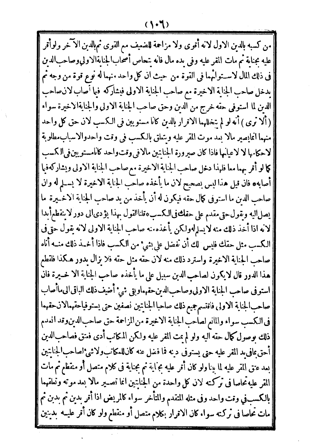 مِنْ كَسْبِهِ بِالدَّيْنِ الْأَوَّلِ؛ لِأَنَّهُ أَقْوَى وَلَا مُزَاحَمَةَ لِلضَّعِيفِ مَعَ الْقَوِيِّ ثُمَّ بِالدَّيْنِ الْآخَرِ، وَلَوْ أَقَرَّ عَلَيْهِ بِجِنَايَةٍ، ثُمَّ مَاتَ الْمَقَرُّ عَلَيْهِ وَفِي يَدِهِ مَالٌ فَإِنَّهُ يَتَحَاصُّ أَصْحَابُ الْجِنَايَةِ الْأُولَى وَصَاحِبُ الدَّيْنِ فِي ذَلِكَ الْمَالِ لِاسْتِوَائِهِمَا فِي الْقُوَّةِ مِنْ حَيْثُ إنَّ كُلَّ وَاحِدٍ مِنْهُمَا لَهُ نَوْعُ قُوَّةٍ مِنْ وَجْهٍ، ثُمَّ يَدْخُلُ صَاحِبُ الْجِنَايَةِ الْأَخِيرَةِ مَعَ صَاحِبِ الْجِنَايَةِ الْأُولَى فَيُشَارِكُهُ فِيمَا أَصَابَ؛ لِأَنَّ صَاحِبَ الدَّيْنِ لَمَّا اسْتَوْفَى حَقَّهُ خَرَجَ مِنْ الدَّيْنِ وَحَقُّ صَاحِبِ الْجِنَايَةِ الْأُولَى وَالْجِنَايَةِ الْأَخِيرَةِ سَوَاءٌ.