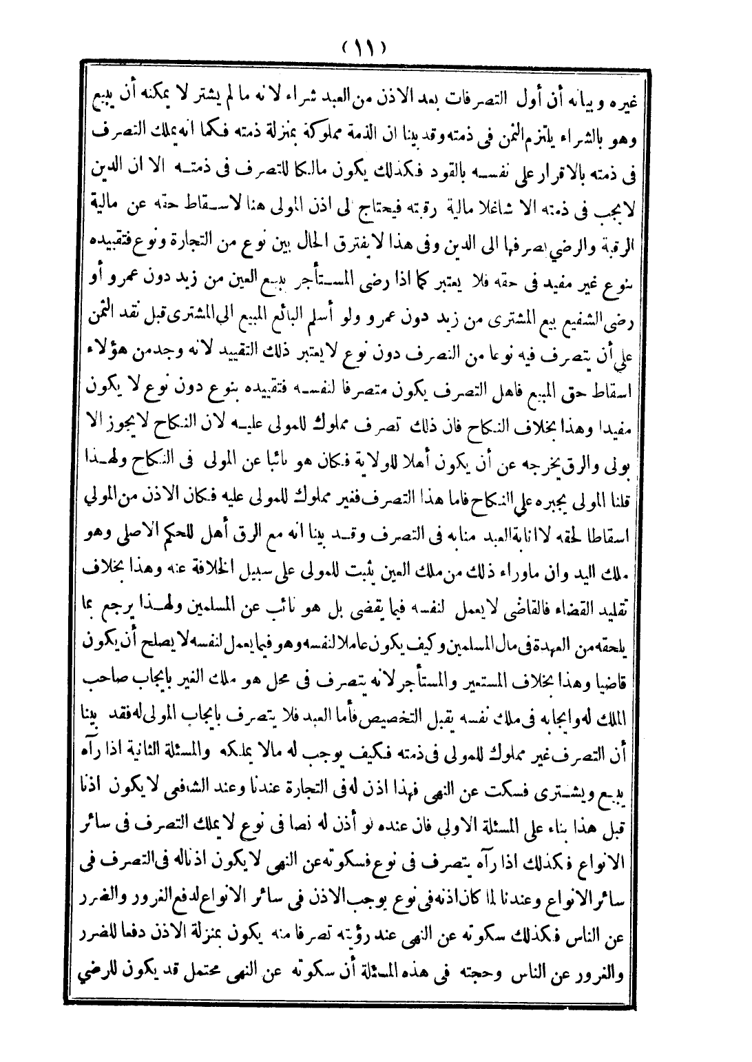 وَالْمَسْأَلَةُ الثَّانِيَةُ: إذَا رَآهُ يَبِيعُ وَيَشْتَرِي فَسَكَتَ عَنْ النَّهْيِ فَهَذَا إذْنٌ لَهُ فِي التِّجَارَةِ عِنْدَنَا وَعِنْدَ الشَّافِعِيِّ لَا يَكُونُ إذْنًا قَبْلَ هَذَا بِنَاءً عَلَى الْمَسْأَلَةِ الْأُولَى فَإِنَّ عِنْدَهُ لَوْ أَذِنَ لَهُ نَصًّا فِي نَوْعٍ لَا يَمْلِكُ التَّصَرُّفَ فِي سَائِرِ الْأَنْوَاعِ فَكَذَلِكَ إذَا رَآهُ يَتَصَرَّفُ فِي نَوْعٍ فَسُكُوتُهُ عَنْ النَّهْيِ لَا يَكُونُ إذْنًا لَهُ فِي التَّصَرُّفِ فِي سَائِرِ الْأَنْوَاعِ وَعِنْدَنَا لَمَّا كَانَ إذْنُهُ فِي نَوْعٍ يُوجِبُ الْإِذْنَ فِي سَائِرِ الْأَنْوَاعِ لِدَفْعِ الْغُرُور، وَالضَّرَرِ عَنْ النَّاسِ فَكَذَلِكَ سُكُوتُهُ عَنْ النَّهْيِ عِنْدَ رُؤْيَتِهِ تَصَرُّفًا مِنْهُ يَكُونُ بِمَنْزِلَةِ الْإِذْنِ دَفْعًا لِلضَّرَرِ، وَالْغُرُورِ عَنْ النَّاسِ وَحُجَّتُهُ فِي هَذِهِ الْمَسْأَلَةِ أَنَّ سُكُوتَهُ عَنْ النَّهْيِ مُحْتَمَلٌ قَدْ يَكُونُ لِلرِّضَى