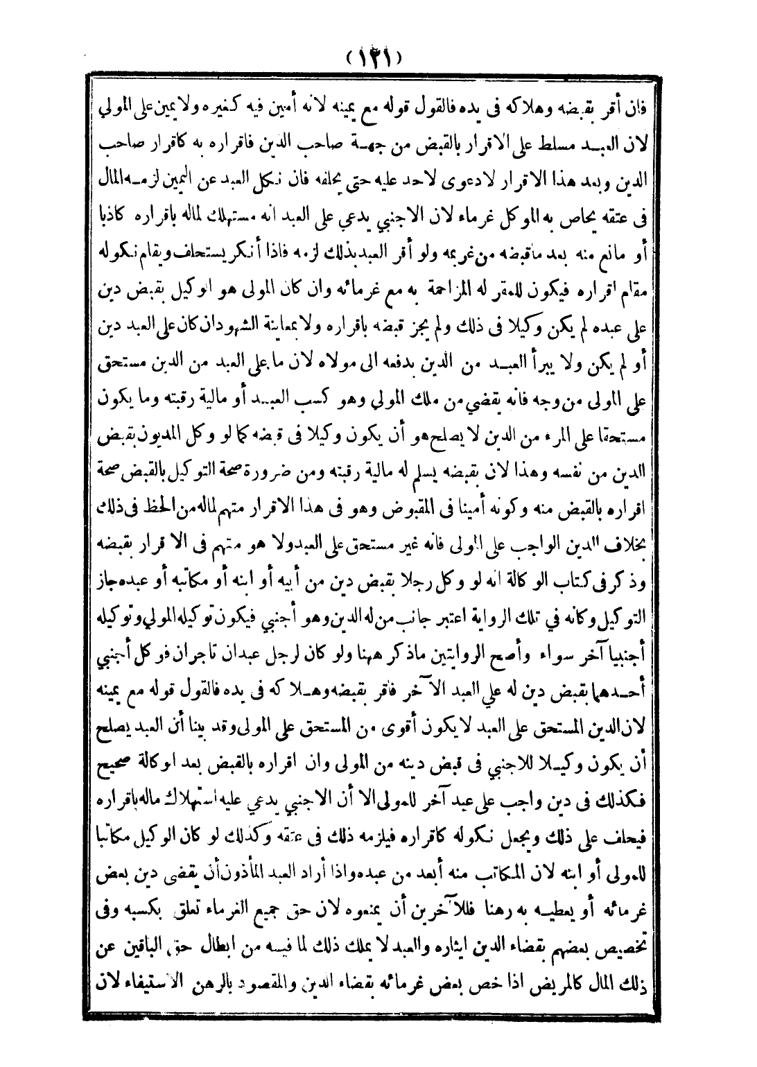 فَإِنْ أَقَرَّ بِقَبْضِهِ وَهَلَاكِهِ فِي يَدِهِ فَالْقَوْلُ قَوْلُهُ مَعَ يَمِينِهِ؛ لِأَنَّهُ أَمِينٌ فِيهِ كَغَيْرِهِ وَلَا يَمِينَ عَلَى الْمَوْلَى؛ لِأَنَّ الْعَبْدَ مُسَلَّطٌ عَلَى الْإِقْرَارِ بِالْقَبْضِ مِنْ جِهَةِ صَاحِبِ الدَّيْنِ فَإِقْرَارُهُ بِهِ كَإِقْرَارِ صَاحِبِ الدَّيْنِ وَبَعْدَ هَذَا الْإِقْرَارِ لَا دَعْوَى لِأَحَدٍ عَلَيْهِ حَتَّى يُحَلِّفَهُ فَإِنْ نَكَلَ الْعَبْدُ عَنْ الْيَمِينِ لَزِمَهُ الْمَالُ فِي عِتْقِهِ يُحَاصُّ بِهِ الْمُوَكِّلُ غُرَمَاءَ؛ لِأَنَّ الْأَجْنَبِيَّ يَدَّعِي عَلَى الْعَبْدِ أَنَّهُ مُسْتَهْلِكٌ لِمَالِهِ بِإِقْرَارِهِ كَاذِبًا أَوْ مَانَعَ مِنْهُ بَعْدَ مَا قَبَضَهُ مِنْ غَرِيمِهِ، وَلَوْ أَقَرَّ الْعَبْدُ بِذَلِكَ لَزِمَهُ فَإِذَا أَنْكَرَ يُسْتَحْلَفُ وَيُقَامُ نُكُولُهُ مَقَامَ إقْرَارِهِ فَيَكُونُ لِلْمُقِرِّ لَهُ الْمُزَاحَمَةُ بِهِ مَعَ غُرَمَائِهِ وَإِنْ كَانَ الْمَوْلَى هُوَ الْوَكِيلَ بِقَبْضِ دَيْنٍ عَلَى عَبْدِهِ لَمْ يَكُنْ وَكِيلًا فِي ذَلِكَ وَلَمْ يَجُزْ قَبْضُهُ بِإِقْرَارِهِ وَلَا بِمُعَايَنَةِ الشُّهُودِ إنْ كَانَ عَلَى الْعَبْدِ دَيْنٌ أَوْ لَمْ يَكُنْ وَلَا يَبْرَأُ الْعَبْدُ مِنْ الدَّيْنِ بِدَفْعِهِ إلَى مَوْلَاهُ؛ لِأَنَّ مَا عَلَى الْعَبْدِ مِنْ الدَّيْنِ مُسْتَحِقٌّ عَلَى الْمَوْلَى مِنْ وَجْهٍ فَإِنَّهُ يُقْضَى مِنْ مِلْكِ الْمَوْلَى وَهُوَ كَسْبُ الْعَبْدِ أَوْ مَالِيَّةُ رَقَبَتِهِ وَمَا يَكُونُ مُسْتَحِقًّا عَلَى الْمَرْءِ مِنْ الدَّيْنِ لَا يَصْلُحُ هُوَ أَنْ يَكُونَ وَكِيلًا فِي قَبْضِهِ كَمَا لَوْ وُكِّلَ الْمَدْيُونُ بِقَبْضِ الدَّيْنِ مِنْ نَفْسِهِ وَهَذَا؛ لِأَنَّ بِقَبْضِهِ يُسَلِّمُ لَهُ مَالِيَّةَ رَقَبَتِهِ وَمِنْ ضَرُورَةِ صِحَّةِ التَّوْكِيلِ بِالْقَبْضِ صِحَّةُ إقْرَارِهِ بِالْقَبْضِ مِنْهُ وَكَوْنُهُ أَمِينًا فِي الْمَقْبُوضِ وَهُوَ فِي هَذَا الْإِقْرَارِ مُتَّهَمٌ لِمَالِهِ مِنْ الْحَظِّ فِي ذَلِكَ بِخِلَافِ الدَّيْنِ الْوَاجِبِ عَلَى الْمَوْلَى فَإِنَّهُ غَيْرُ مُسْتَحِقٍّ عَلَى الْعَبْدِ وَلَا هُوَ مُتَّهَمٌ فِي الْإِقْرَارِ بِقَبْضِهِ وَذَكَرَ فِي كِتَابِ الْوَكَالَةِ أَنَّهُ لَوْ وَكَّلَ رَجُلًا بِقَبْضِ دَيْنٍ مِنْ أَبِيهِ أَوْ ابْنِهِ أَوْ مُكَاتَبِهِ أَوْ عَبْدِهِ جَازَ التَّوْكِيلُ وَكَأَنَّهُ فِي تِلْكَ الرِّوَايَةِ اُعْتُبِرَ جَانِبُ مَنْ لَهُ الدَّيْنُ وَهُوَ أَجْنَبِيٌّ فَيَكُونُ تَوْكِيلُهُ الْمَوْلَى وَتَوْكِيلُهُ أَجْنَبِيًّا آخَرَ سَوَاءً وَأَصَحُّ الرِّوَايَتَيْنِ مَا ذُكِرَ هَهُنَا.