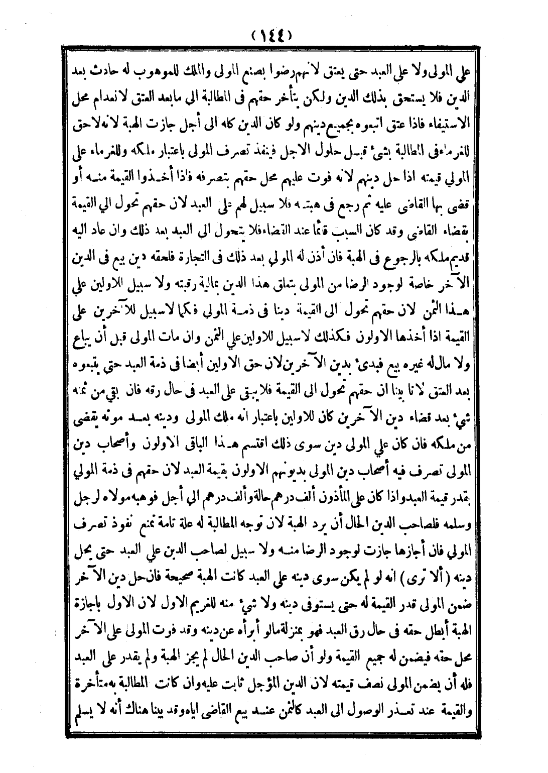 عَلَى الْمَوْلَى وَلَا عَلَى الْعَبْدِ حَتَّى يُعْتَقَ؛ لِأَنَّهُمْ رَضُوا بِصُنْعِ الْمَوْلَى وَالْمِلْكُ لِلْمَوْهُوبِ لَهُ حَادِثٌ بَعْدَ الدَّيْنِ فَلَا يَسْتَحِقُّ بِذَلِكَ الدَّيْنِ وَلَكِنْ يَتَأَخَّرُ حَقُّهُمْ فِي الْمُطَالَبَةِ إلَى مَا بَعْدَ الْعِتْقِ لِانْعِدَامِ مَحَلِّ الِاسْتِيفَاءِ فَإِذَا عَتَقَ اتَّبَعُوهُ بِجَمِيعِ دَيْنِهِمْ، وَلَوْ كَانَ الدَّيْنُ كُلُّهُ إلَى أَجَلٍ جَازَتْ الْهِبَةُ؛ لِأَنَّهُ لَا حَقَّ لِلْغُرَمَاءِ فِي الْمُطَالَبَةِ بِشَيْءٍ قَبْلَ حُلُولِ الْأَجَلِ فَيَنْفُذُ تَصَرُّفُ الْمَوْلَى بِاعْتِبَارِ مِلْكِهِ وَلِلْغُرَمَاءِ عَلَى الْمَوْلَى قِيمَتُهُ إذَا حَلَّ دَيْنُهُمْ؛ لِأَنَّهُ فَوَّتَ عَلَيْهِمْ مَحَلَّ حَقِّهِمْ بِتَصَرُّفِهِ فَإِذَا أَخَذُوا الْقِيمَةَ مِنْهُ أَوْ قَضَى بِهَا - الْقَاضِي عَلَيْهِ، ثُمَّ رَجَعَ فِي هِبَتِهِ فَلَا سَبِيلَ لَهُمْ عَلَى الْعَبْدِ؛ لِأَنَّ حَقَّهُمْ تَحَوَّلَ إلَى الْقِيمَةِ بِقَضَاءِ الْقَاضِي وَقَدْ كَانَ السَّبَبُ قَائِمًا عِنْدَ الْقَضَاءِ فَلَا يَتَحَوَّلُ إلَى الْعَبْدِ بَعْدَ ذَلِكَ وَإِنْ عَادَ إلَيْهِ قَدِيمُ مِلْكِهِ بِالرُّجُوعِ فِي الْهِبَةِ فَإِنْ أَذِنَ لَهُ الْمَوْلَى بَعْدَ ذَلِكَ فِي التِّجَارَةِ فَلَحِقَهُ دَيْنٌ بِيعَ فِي الدَّيْنِ الْآخَرِ خَاصَّةً لِوُجُودِ الرِّضَا مِنْ الْمَوْلَى بِتَعَلُّقِ هَذَا الدَّيْنِ بِمَالِيَّةِ رَقَبَتِهِ وَلَا سَبِيلَ لِلْأَوَّلِينَ عَلَى هَذَا الثَّمَنِ؛ لِأَنَّ حَقَّهُمْ تَحَوَّلَ إلَى الْقِيمَةِ دَيْنًا فِي ذِمَّةِ الْمَوْلَى فَكَمَا لَا سَبِيلَ لِلْآخَرِينَ عَلَى الْقِيمَةِ إذَا أَخَذَهَا الْأَوَّلُونَ فَكَذَلِكَ لَا سَبِيلَ لِلْأَوَّلِينَ عَلَى الثَّمَنِ وَإِنْ مَاتَ الْمَوْلَى قَبْلَ أَنْ يُبَاعَ وَلَا مَالَ لَهُ غَيْرَهُ بِيعَ فَبُدِئَ بِدَيْنِ الْآخَرِينَ؛ لِأَنَّ حَقَّ الْأَوَّلِينَ أَيْضًا فِي ذِمَّةِ الْعَبْدِ حَتَّى يَتَّبِعُوهُ بَعْدَ الْعِتْقِ؛ لِأَنَّا بَيَّنَّا أَنَّ حَقَّهُمْ تَحَوَّلَ إلَى الْقِيمَةِ فَلَا يَبْقَى عَلَى الْعَبْدِ فِي حَالِ رِقِّهِ فَإِنْ بَقِيَ مِنْ ثَمَنِهِ شَيْءٌ بَعْدَ قَضَاءِ دَيْنِ الْآخَرِينَ كَانَ لِلْأَوَّلِينَ بِاعْتِبَارِ أَنَّهُ مِلْكُ الْمَوْلَى وَدَيْنُهُ بَعْدَ مَوْتِهِ يُقْضَى مِنْ مِلْكِهِ فَإِنْ كَانَ عَلَى الْمَوْلَى دَيْنٌ سِوَى ذَلِكَ اقْتَسَمَ هَذَا الْبَاقِيَ الْأَوَّلُونَ وَأَصْحَابُ دَيْنِ الْمَوْلَى تَصَرَّفَ فِيهِ أَصْحَابُ دَيْنِ الْمَوْلَى بِدُيُونِهِمْ الْأَوَّلُونَ بِقِيمَةِ الْعَبْدِ؛ لِأَنَّ حَقَّهُمْ فِي ذِمَّةِ الْمَوْلَى بِقَدْرِ قِيمَةِ الْعَبْدِ.