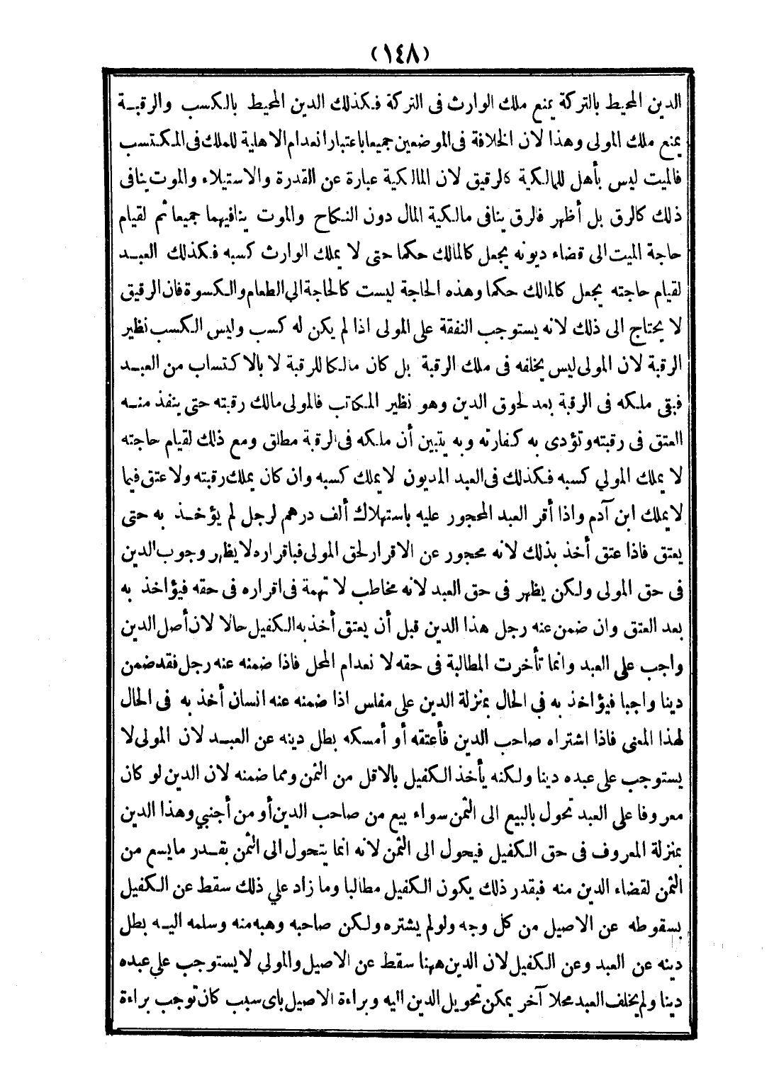 الدَّيْنَ الْمُحِيطَ بِالتَّرِكَةِ يَمْنَعُ مِلْكَ الْوَارِثِ فِي التَّرِكَةِ فَكَذَلِكَ الدَّيْنُ الْمُحِيطُ بِالْكَسْبِ وَالرَّقَبَةِ يَمْنَعُ مِلْكَ الْمَوْلَى وَهَذَا؛ لِأَنَّ الْخِلَافَةَ فِي الْمَوْضِعَيْنِ جَمِيعًا بِاعْتِبَارِ انْعِدَامِ الْأَهْلِيَّةِ لِلْمِلْكِ فِي الْمُكْتَسَبِ فَالْمَيِّتُ لَيْسَ بِأَهْلٍ لِلْمَالِكِيَّةِ كَالرَّقِيقِ؛ لِأَنَّ الْمَالِكِيَّةَ عِبَارَةٌ عَنْ الْقُدْرَةِ وَالِاسْتِيلَاءِ وَالْمَوْتُ يُنَافِي ذَلِكَ كَالرِّقِّ بَلْ أَظْهَرُ فَالرِّقُّ يُنَافِي مَالِكِيَّةَ الْمَالِ دُونَ النِّكَاحِ وَالْمَوْتُ يُنَافِيهِمَا جَمِيعًا، ثُمَّ لِقِيَامِ حَاجَةِ الْمَيِّتِ إلَى قَضَاءِ دُيُونِهِ يُجْعَلُ كَالْمَالِكِ حُكْمًا حَتَّى لَا يَمْلِكَ الْوَارِثُ كَسْبَهُ فَكَذَلِكَ الْعَبْدُ لِقِيَامِ حَاجَتِهِ يُجْعَلُ كَالْمَالِكِ حُكْمًا وَهَذِهِ الْحَاجَةُ لَيْسَتْ كَالْحَاجَةِ إلَى الطَّعَامِ وَالْكِسْوَةِ فَإِنَّ الرَّقِيقَ لَا يَحْتَاجُ إلَى ذَلِكَ؛ لِأَنَّهُ يَسْتَوْجِبُ النَّفَقَةَ عَلَى الْمَوْلَى إذَا لَمْ يَكُنْ لَهُ كَسْبٌ وَلَيْسَ الْكَسْبُ نَظِيرَ الرَّقَبَةِ؛ لِأَنَّ الْمَوْلَى لَيْسَ يَخْلُفُهُ فِي مِلْكِ الرَّقَبَةِ بَلْ كَانَ مَالِكًا لِلرَّقَبَةِ لَا بِالِاكْتِسَابِ مِنْ الْعَبْدِ فَبَقِيَ مِلْكُهُ فِي الرَّقَبَةِ بَعْدَ لُحُوقِ الدَّيْنِ وَهُوَ نَظِيرُ الْمُكَاتَبِ فَالْمَوْلَى مَالِكٌ رَقَبَتَهُ حَتَّى يَنْفُذَ مِنْهُ الْعِتْقُ فِي - رَقَبَتِهِ وَتُؤَدَّى بِهِ كَفَّارَتُهُ وَبِهِ يَتَبَيَّنُ أَنَّ مِلْكَهُ فِي الرَّقَبَةِ مُطْلَقٌ وَمَعَ ذَلِكَ لِقِيَامِ حَاجَتِهِ لَا يَمْلِكُ الْمَوْلَى كَسْبَهُ فَكَذَلِكَ فِي الْعَبْدِ الْمَدْيُونِ لَا يَمْلِكُ كَسْبَهُ وَإِنْ كَانَ يَمْلِكُ رَقَبَتَهُ وَلَا عِتْقَ فِيمَا لَا يَمْلِكُ ابْنُ آدَمَ.