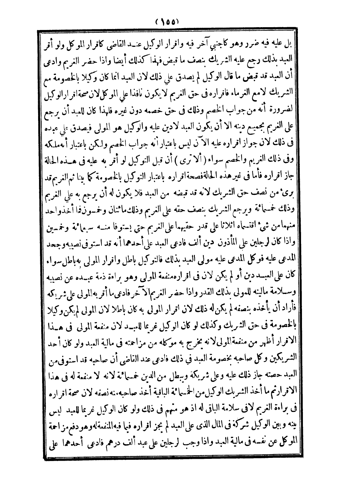 بَلْ عَلَيْهِ فِيهِ ضَرَرٌ وَهُوَ كَأَجْنَبِيٍّ آخَرَ فِيهِ وَإِقْرَارُ الْوَكِيلِ عِنْدَ الْقَاضِي كَإِقْرَارِ الْمُوَكِّلِ، وَلَوْ أَقَرَّ الْعَبْدُ بِذَلِكَ رَجَعَ عَلَيْهِ الشَّرِيكُ بِنِصْفِ مَا قَبَضَ فَهَذَا كَذَلِكَ أَيْضًا، وَإِذَا حَضَرَ الْغَرِيمُ وَادَّعَى أَنَّ الْعَبْدَ قَدْ قَبَضَ مَا قَالَ الْوَكِيلُ لَمْ يُصَدَّقْ عَلَى ذَلِكَ؛ لِأَنَّ الْعَبْدَ إنَّمَا كَانَ وَكِيلًا بِالْخُصُومَةِ مَعَ الشَّرِيكِ لَا مَعَ الْغُرَمَاءِ فَإِقْرَارُهُ فِي حَقِّ الْغَرِيمِ لَا يَكُونُ نَافِذًا عَلَى الْمُوَكِّلِ؛ لِأَنَّ صِحَّةَ إقْرَارِ الْوَكِيلِ لِضَرُورَةِ أَنَّهُ مِنْ جَوَابِ الْخَصْمِ، وَذَلِكَ فِي حَقِّ خَصْمِهِ دُونَ غَيْرِهِ؛ فَلِهَذَا كَانَ لِلْعَبْدِ أَنْ يَرْجِعَ عَلَى الْغَرِيمِ بِجَمِيعِ دَيْنِهِ إلَّا أَنْ يَكُونَ الْعَبْدُ لَا دَيْنَ عَلَيْهِ وَالْوَكِيلُ هُوَ الْمَوْلَى فَيُصَدِّقُ عَلَى عَبْدِهِ فِي ذَلِكَ؛ لِأَنَّ جَوَازَ إقْرَارِهِ عَلَيْهِ الْآنَ لَيْسَ بِاعْتِبَارِ أَنَّهُ جَوَابُ الْخَصْمِ وَلَكِنْ بِاعْتِبَارِ أَنَّهُ مِلْكُهُ وَفِي ذَلِكَ الْغَرِيمُ وَالْخَصْمُ سَوَاءٌ.