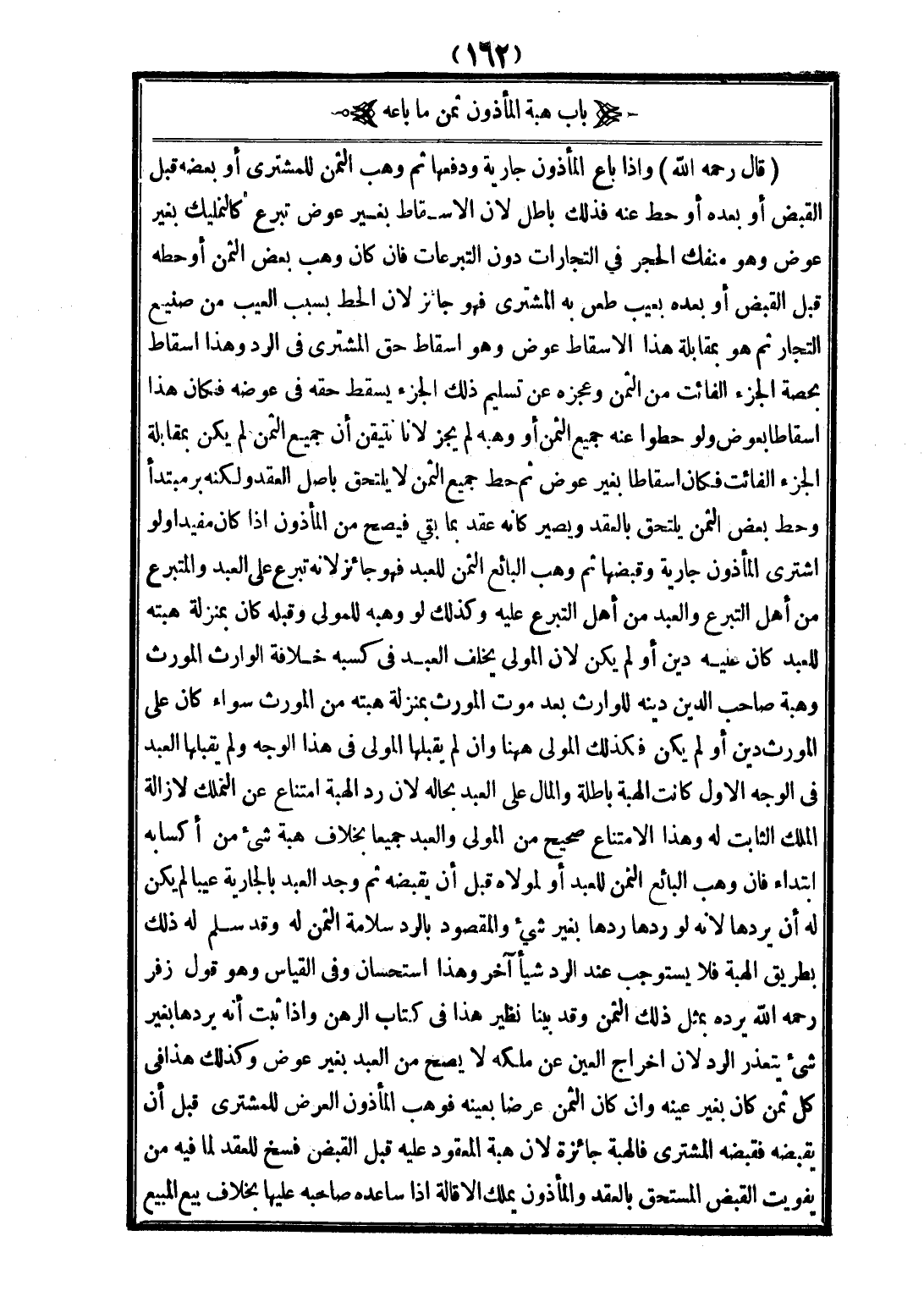 قَالَ: - رَحِمَهُ اللَّهُ -) وَإِذَا بَاعَ الْمَأْذُونُ جَارِيَةً وَدَفَعَهَا، ثُمَّ وَهَبَ الثَّمَنَ لِلْمُشْتَرِي أَوْ بَعْضَهُ قَبْلَ الْقَبْضِ أَوْ بَعْدَهُ أَوْ حَطَّ عَنْهُ فَذَلِكَ بَاطِلٌ؛ لِأَنَّ الْإِسْقَاطَ بِغَيْرِ عِوَضٍ تَبَرُّعٌ كَالتَّمْلِيكِ بِغَيْرِ عِوَضٍ وَهُوَ مُنْفَكُّ الْحَجْرِ فِي التِّجَارَاتِ دُونَ التَّبَرُّعَاتِ فَإِنْ كَانَ وَهَبَ بَعْضَ الثَّمَنِ أَوْ حَطَّهُ قَبْلَ الْقَبْضِ أَوْ بَعْدَهُ بِعَيْبٍ طَعَنَ بِهِ الْمُشْتَرِي فَهُوَ جَائِزٌ؛ لِأَنَّ الْحَطَّ بِسَبَبِ الْعَيْبِ مِنْ صَنِيعِ التُّجَّارِ، ثُمَّ هُوَ بِمُقَابَلَةِ هَذَا الْإِسْقَاطِ عِوَضٌ وَهُوَ إسْقَاطُ حَقِّ الْمُشْتَرِي فِي الرَّدِّ وَهَذَا إسْقَاطٌ بِحِصَّةِ الْجُزْءِ الْفَائِتِ مِنْ الثَّمَنِ وَعَجْزُهُ عَنْ تَسْلِيمِ ذَلِكَ الْجُزْءِ يُسْقِطُ حَقَّهُ فِي عِوَضِهِ فَكَانَ هَذَا إسْقَاطًا بِعِوَضٍ، وَلَوْ حَطُّوا عَنْهُ جَمِيعَ الثَّمَنِ أَوْ وَهَبَهُ لَمْ يَجُزْ؛ لِأَنَّا نَتَيَقَّنُ أَنَّ جَمِيعَ الثَّمَنِ لَمْ يَكُنْ بِمُقَابَلَةِ الْجُزْءِ الْفَائِتِ فَكَانَ إسْقَاطًا بِغَيْرِ عِوَضٍ، ثُمَّ حَطُّ جَمِيعِ الثَّمَنِ لَا يَلْتَحِقُ بِأَصْلِ الْعَقْدِ وَلَكِنَّهُ بَرٌّ مُبْتَدَأٌ وَحَطُّ بَعْضِ الثَّمَنِ يَلْتَحِقُ بِالْعَقْدِ وَيَصِيرُ كَأَنَّهُ عَقْدٌ بِمَا بَقِيَ فَيَصِحُّ مِنْ الْمَأْذُونِ إذَا كَانَ مُفِيدًا.